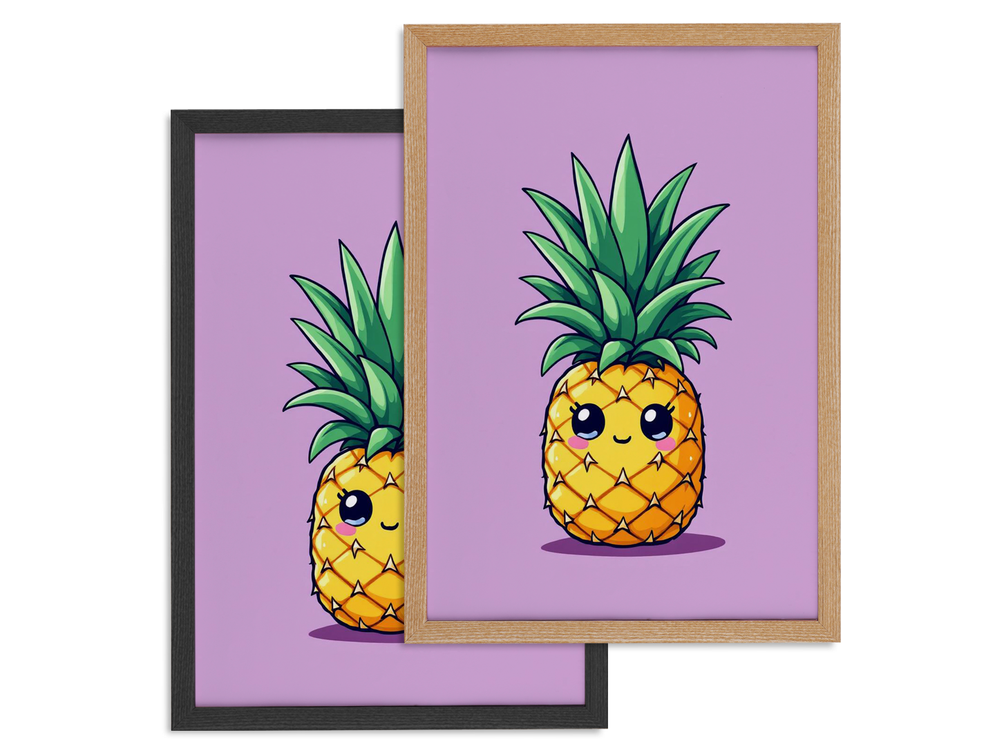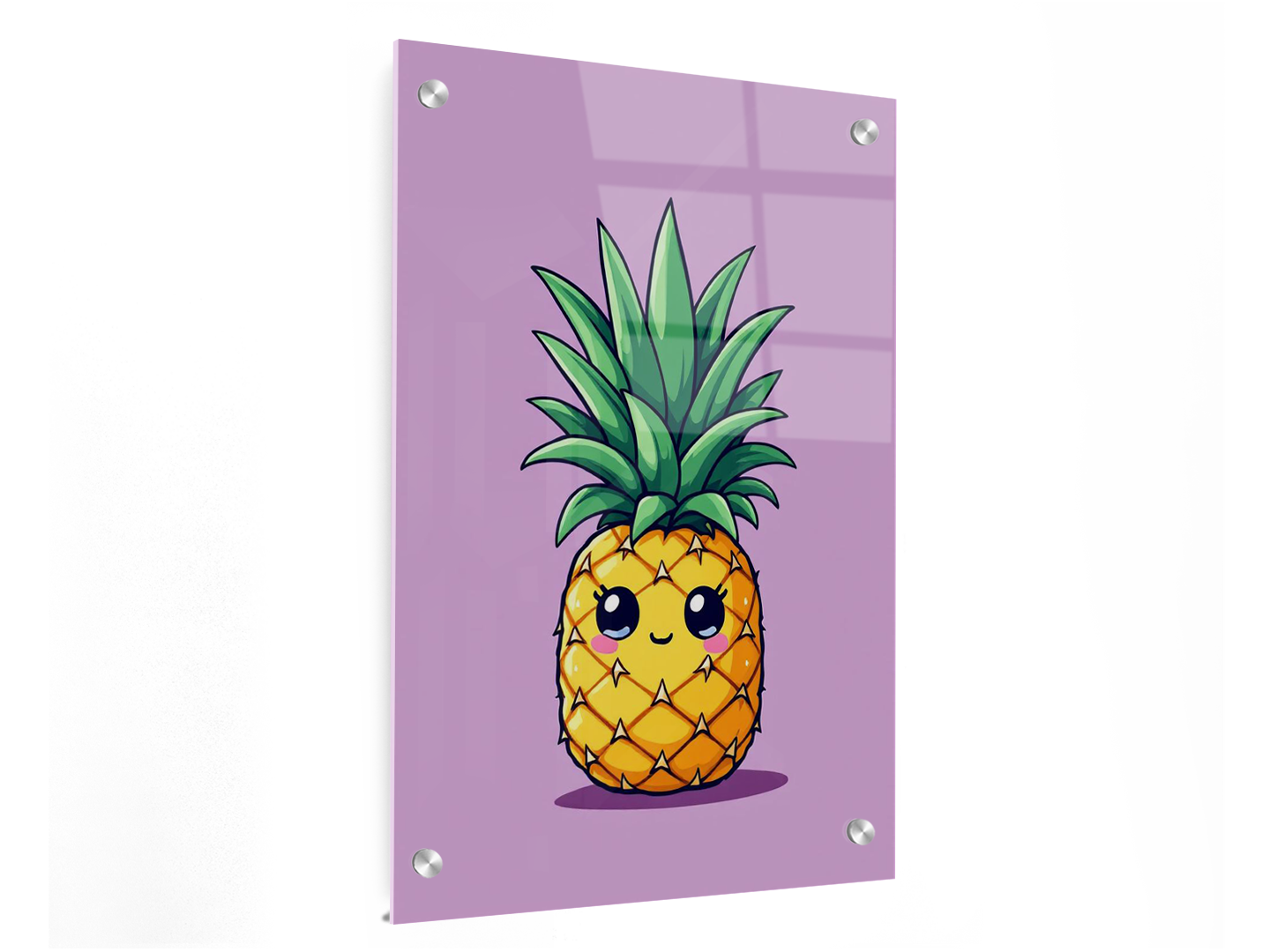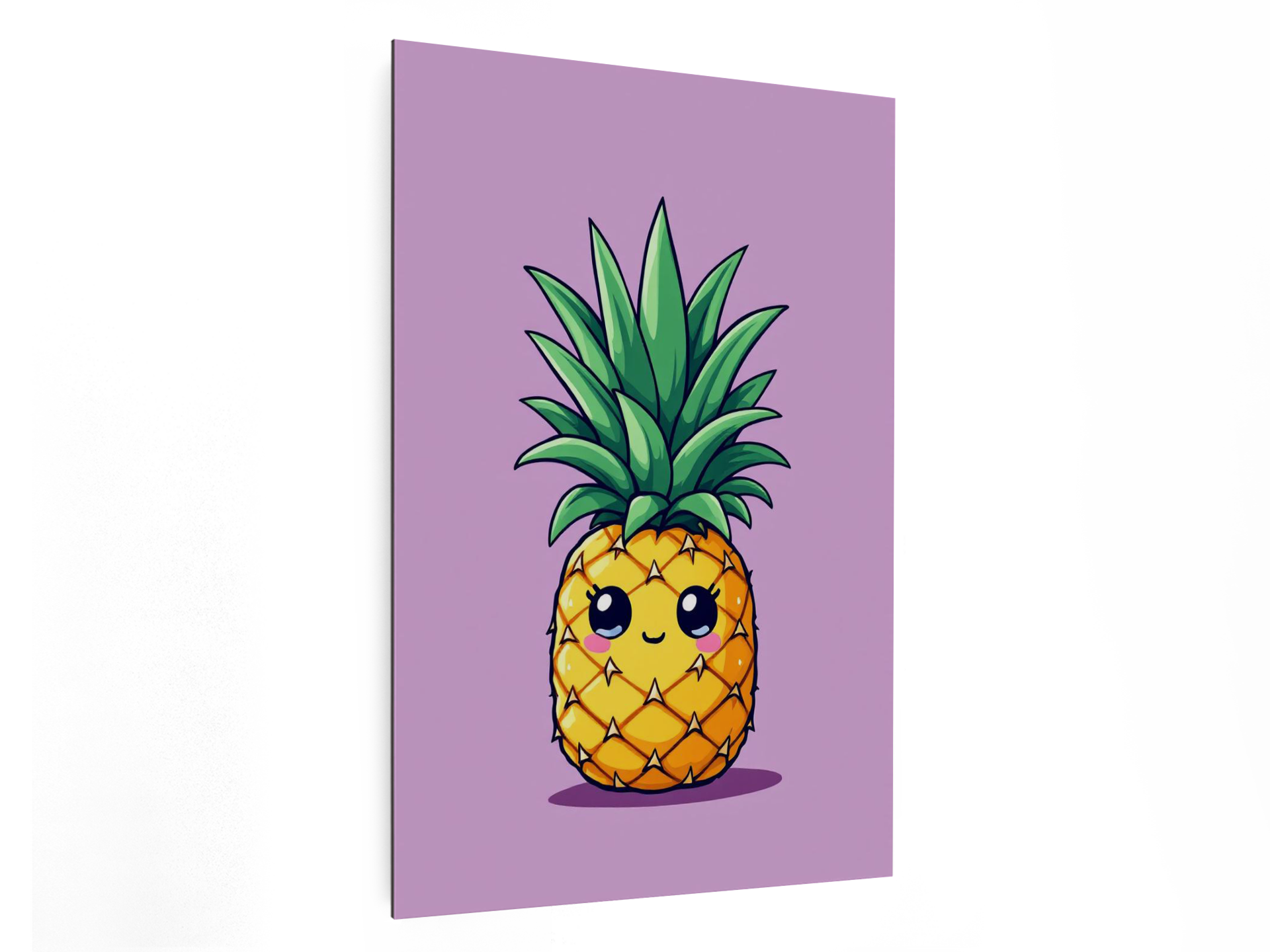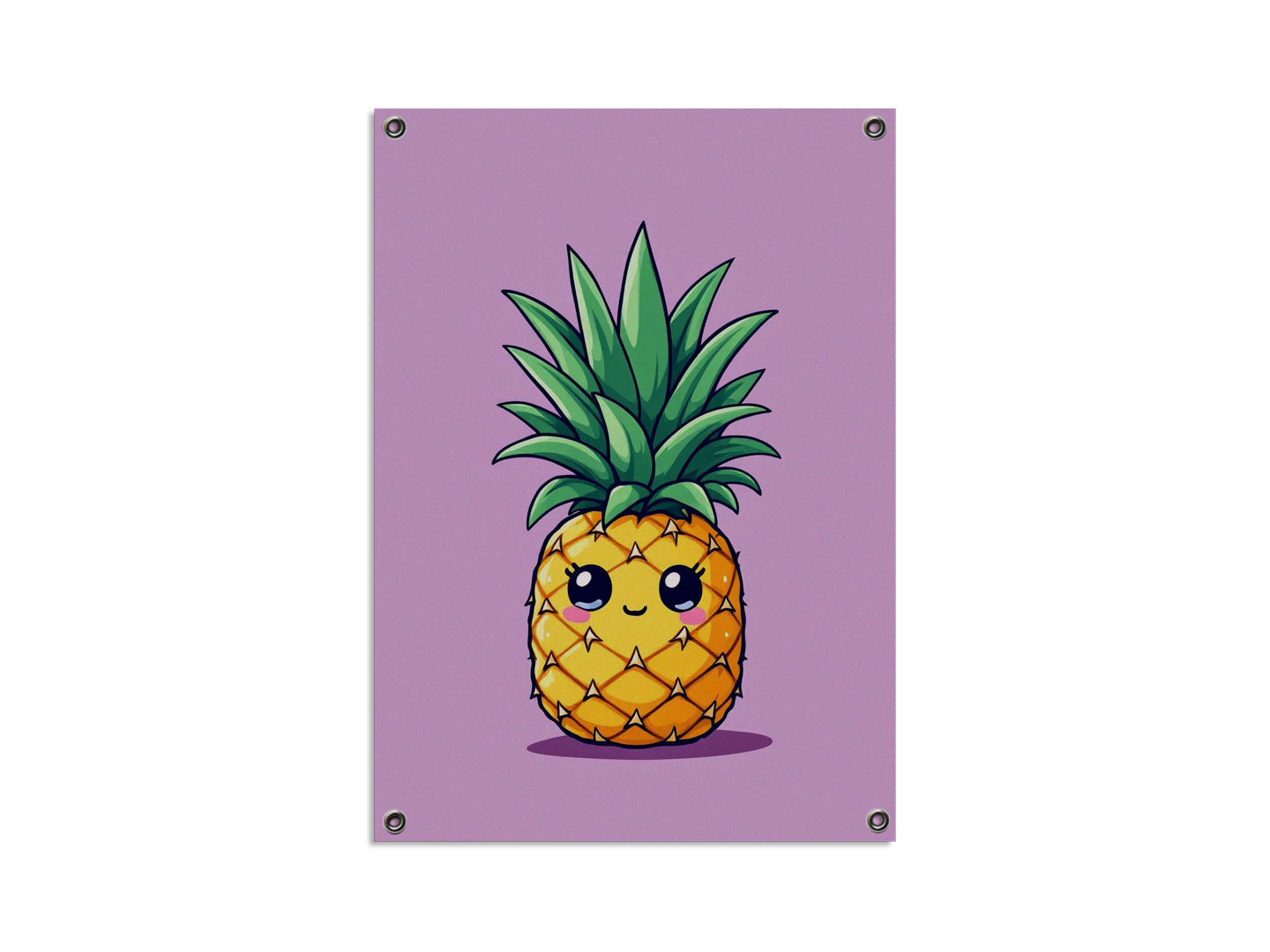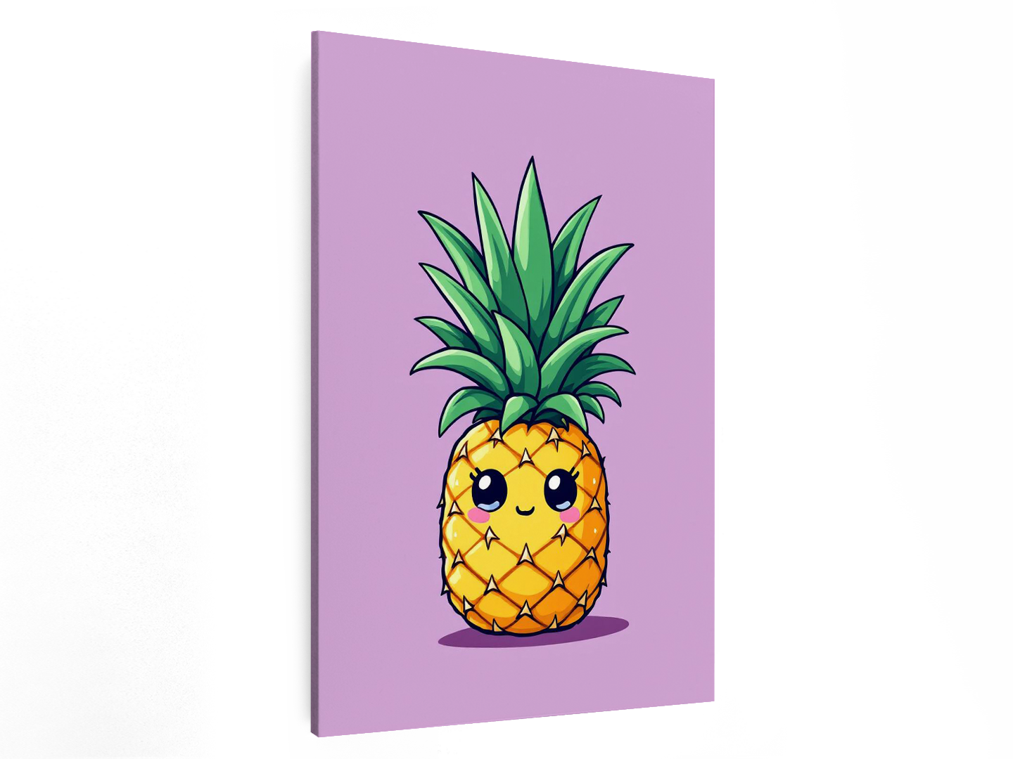 Een modern minimalistische kawaii cartoon illustratie van een ananas, met een pastel paarse achtergrond.