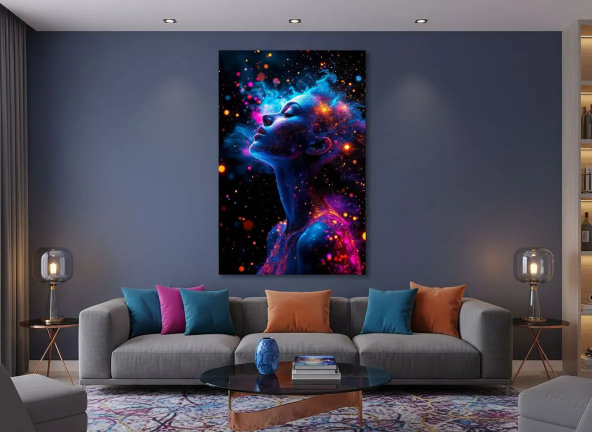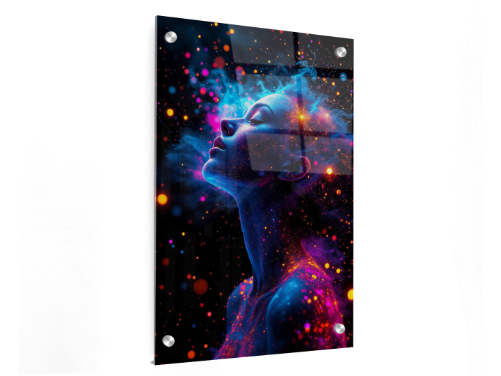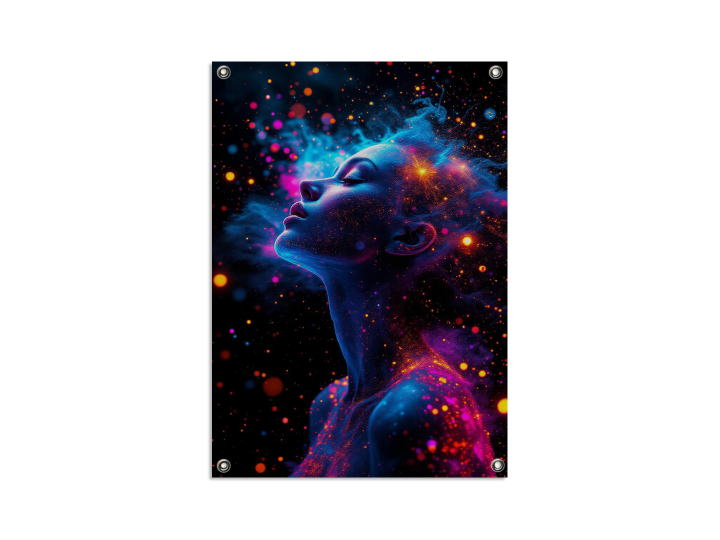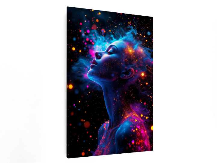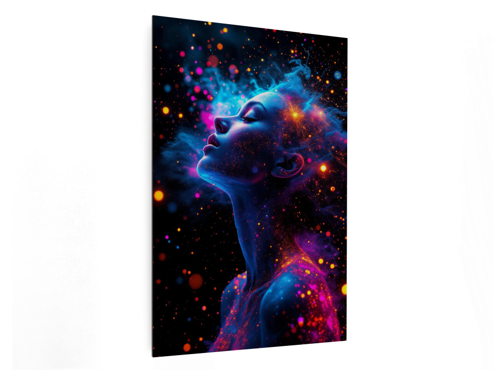 Een epische en dynamisch portret van een prachtige dame, die geheel opgebouwd is uit kleurrijk poeder en lasers, met een donkere achtergrond.