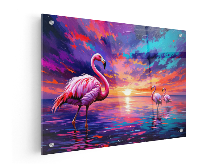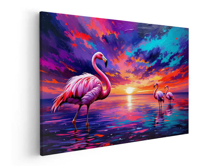 Een episch en levendig olieverfschilderij, met rommelige penseelstreken en verfspatten, van meerdere flamingo's die in ondiep water staan, met een prachtige zonsondergang en paarse, rode en blauwe kleuren in de lucht. De dikke impasto-verf textuur, de verbazingwekkende details en de kwaliteit, en de correcte anatomie van elke flamingo zijn indrukwekkend.