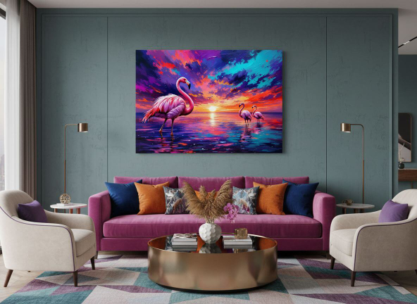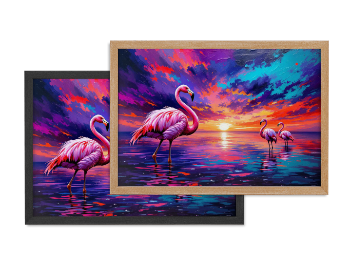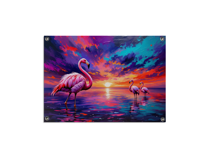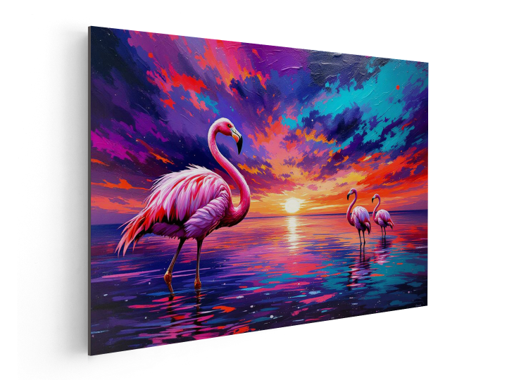 Een episch en levendig olieverfschilderij, met rommelige penseelstreken en verfspatten, van meerdere flamingo’s die in ondiep water staan, met een prachtige zonsondergang en paarse, rode en blauwe kleuren in de lucht. De dikke impasto-verf textuur, de verbazingwekkende details en de kwaliteit, en de correcte anatomie van elke flamingo zijn indrukwekkend.
