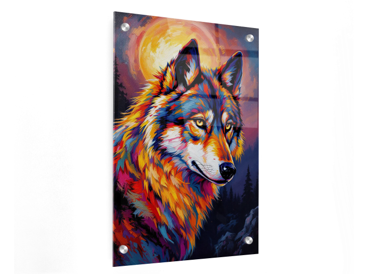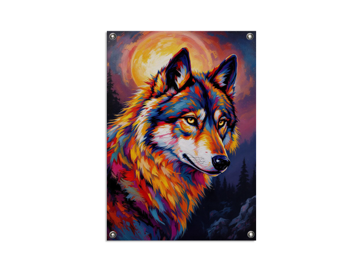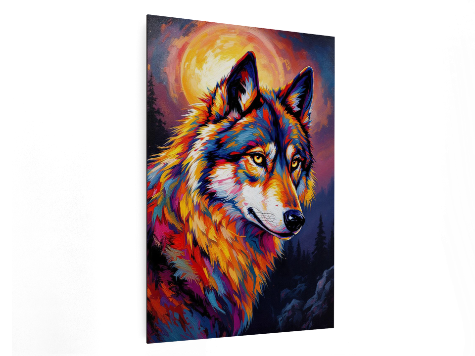 Een episch, levendig en dynamisch olieverfschilderij van een wolf, met een volle maan op de achtergrond, geschilderd met dikke, gelaagde impasto-verf.