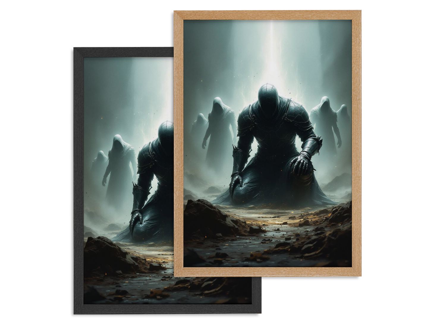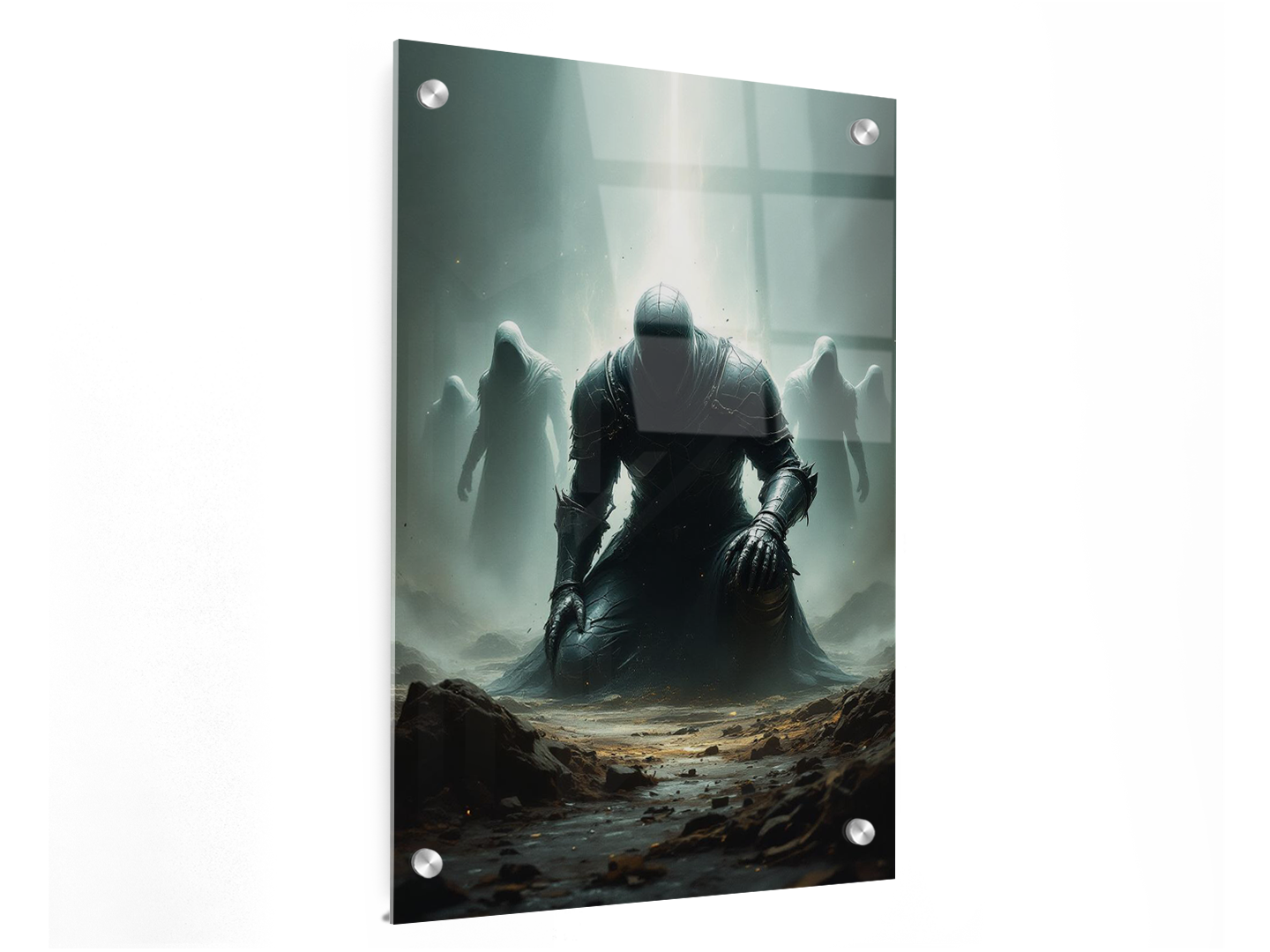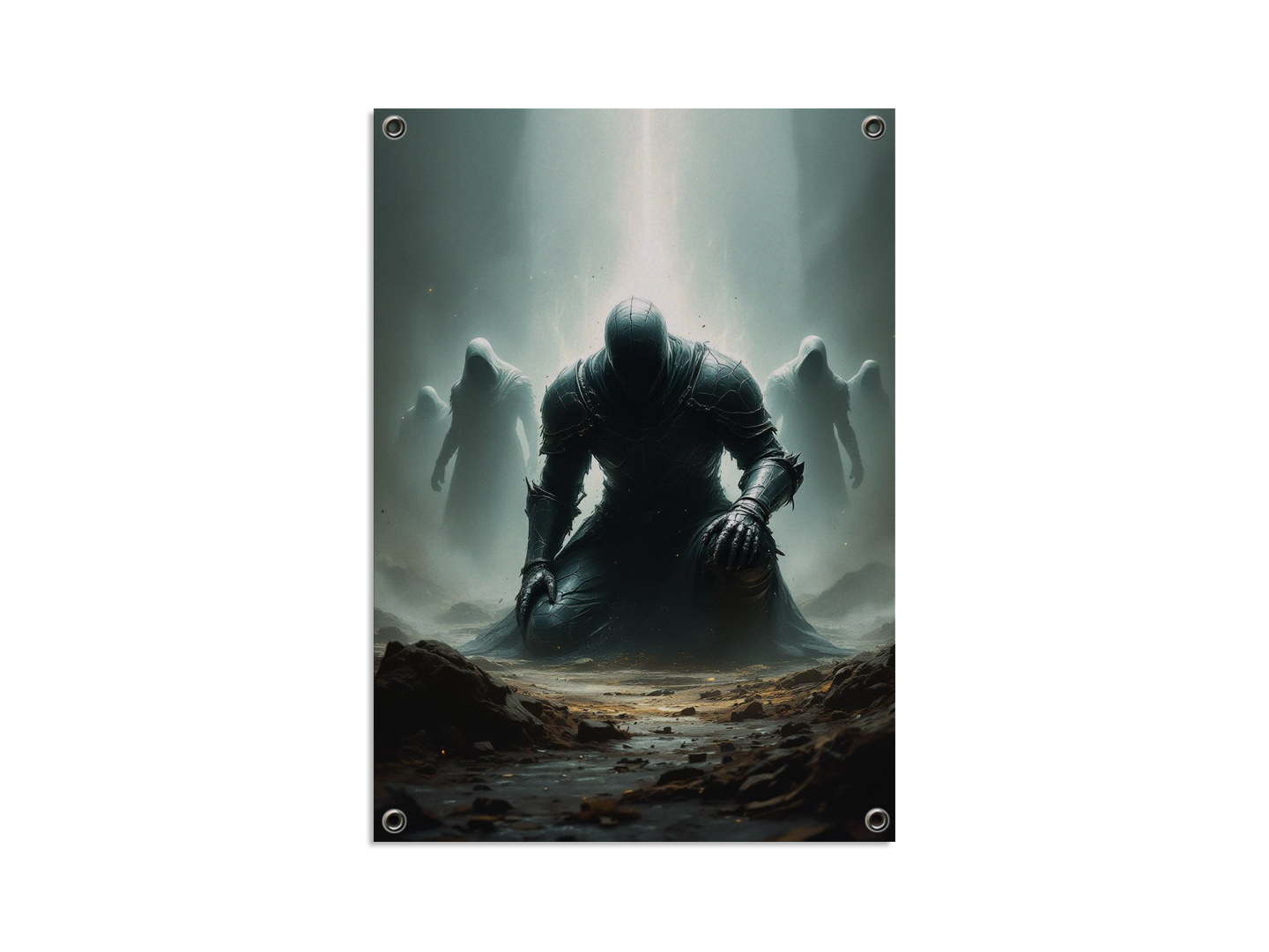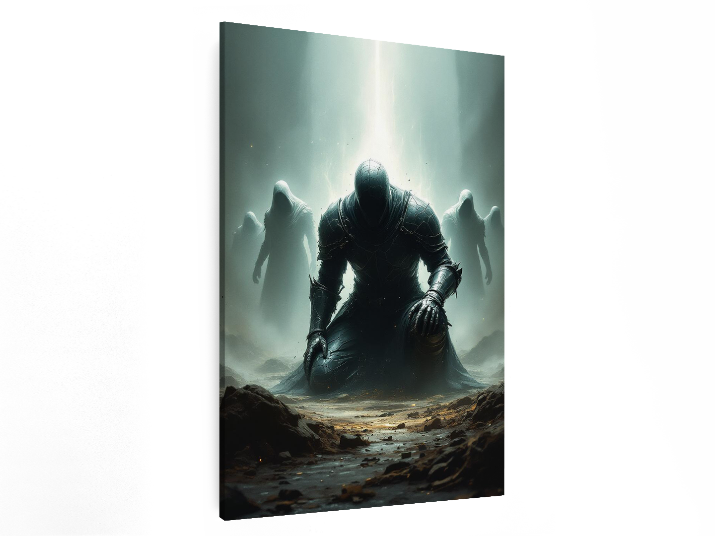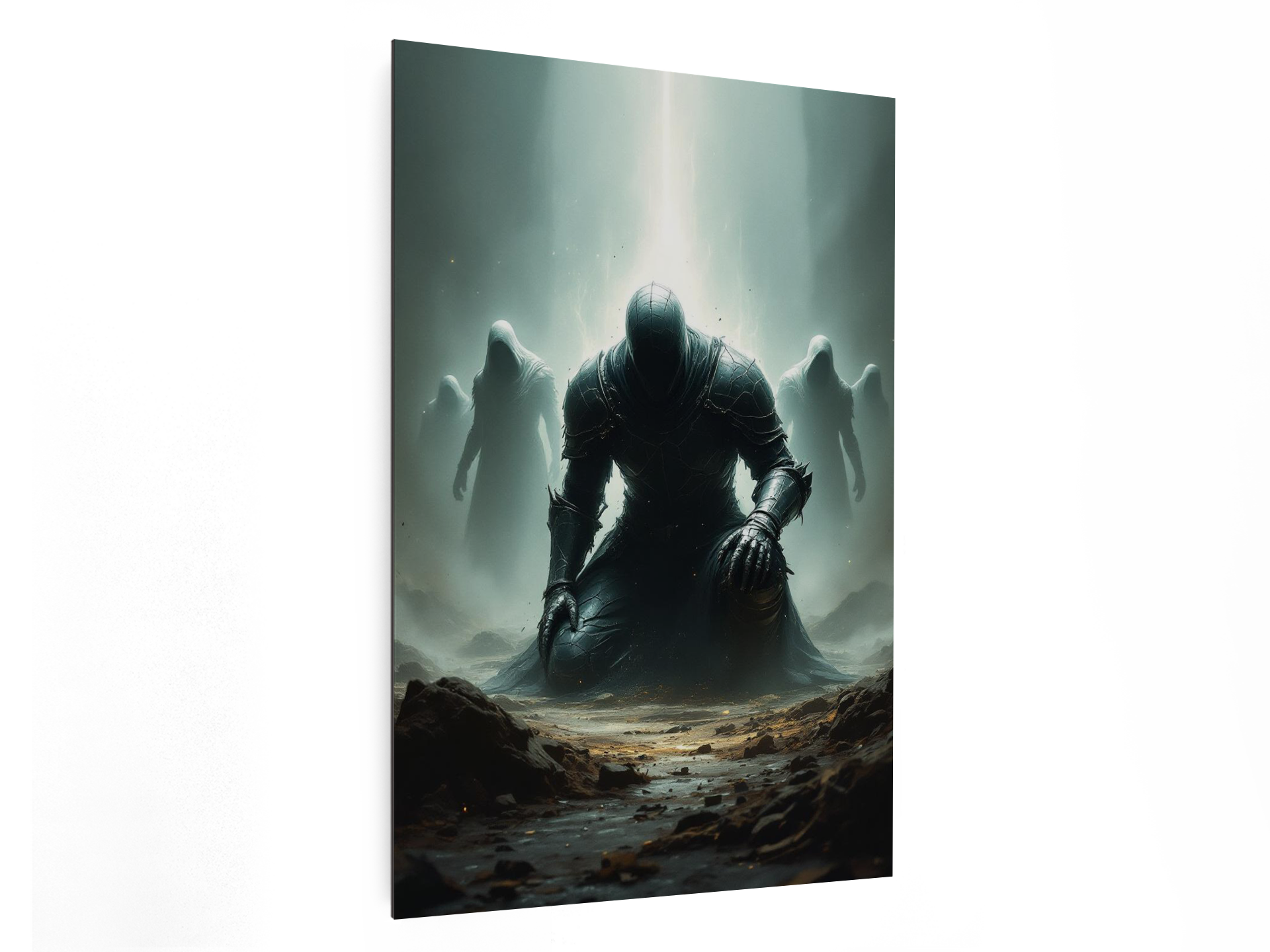 Een gevallen held knielt in een gebarsten harnas, omringd door spookachtige silhouetten, dramatische belichting van bovenaf, een subtiele energie-aura, zwevende deeltjes, schaduwen met hoog contrast, een epische, gecentreerde poster compositie.