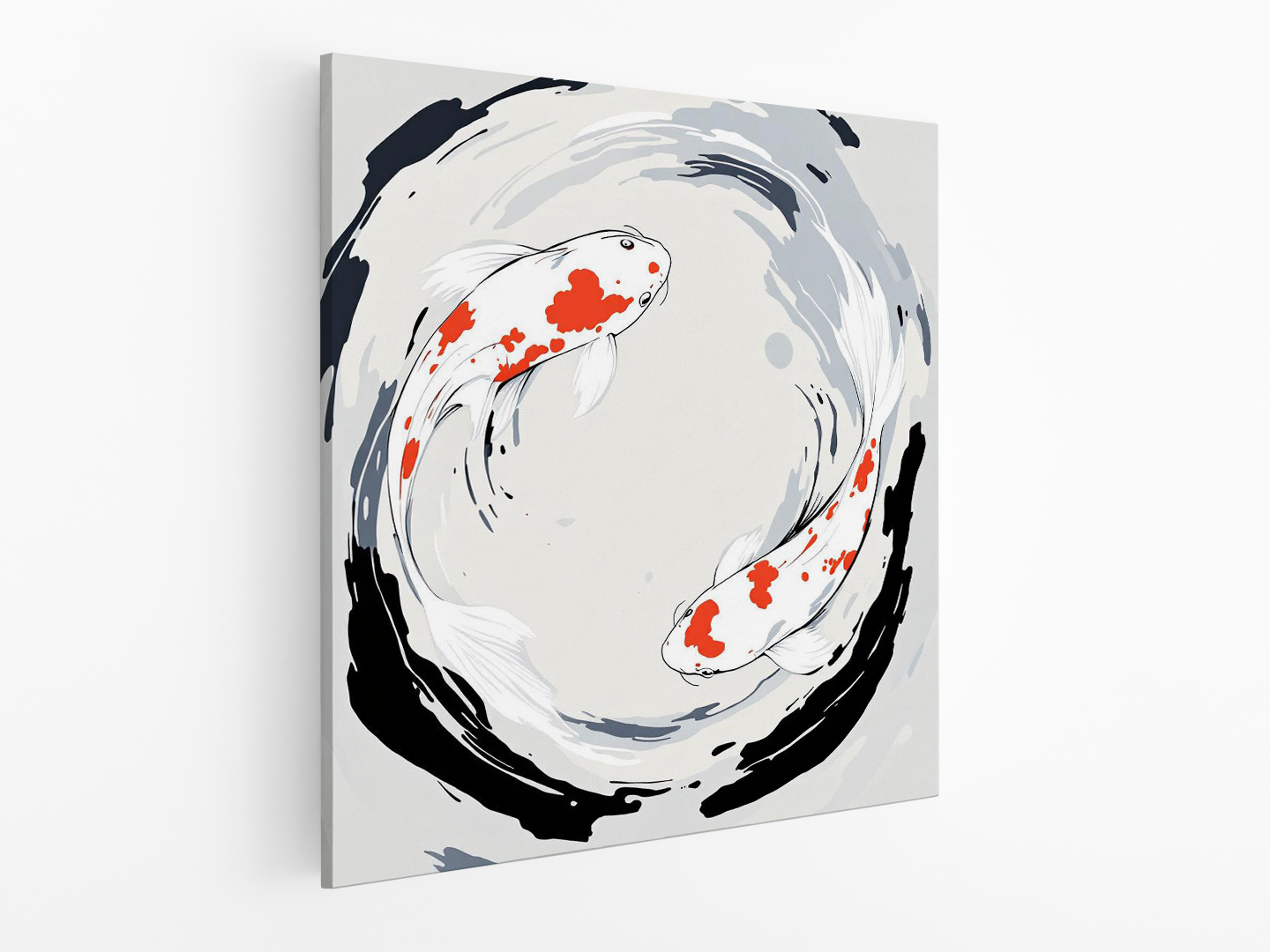 Minimalistische sumi-e inkt illustratie van twee elegante koi karpers die cirkelen in rustig water, expressieve penseelstreken, veel witruimte, zen-achtige sfeer, monochroom zwart en grijs, geen tekst of symbolen, tijdloze Japanse esthetiek.