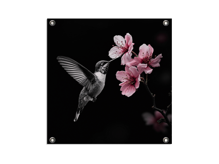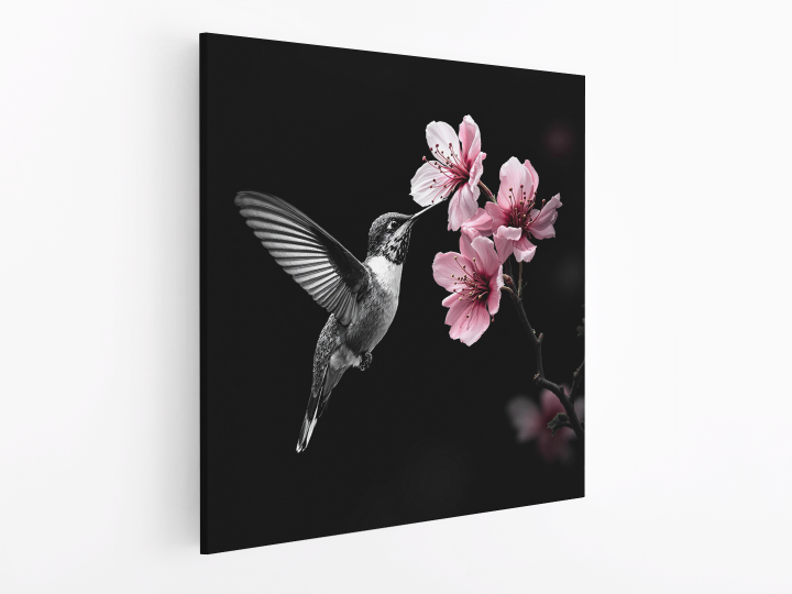 Een foto realistische close-up van een kolibrie die een kersenbloesembloem benaderd, alleen de bloemen in een prachtige roze kleur, met een donkere achtergrond.