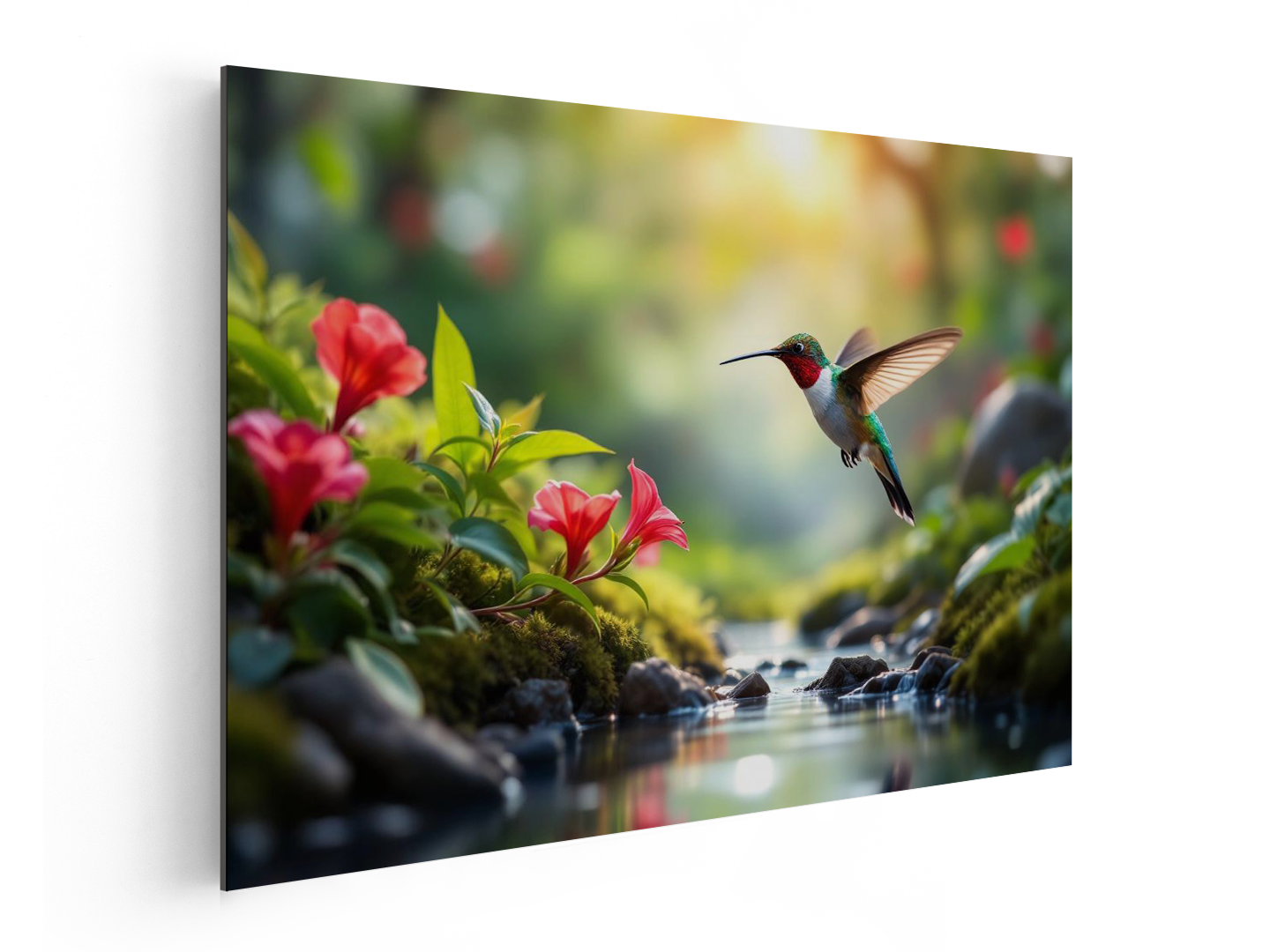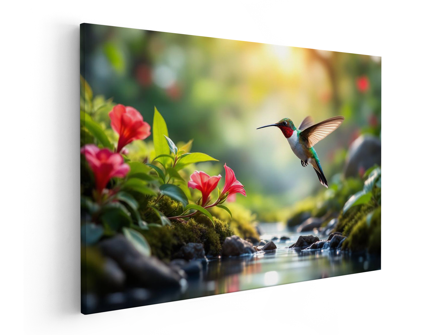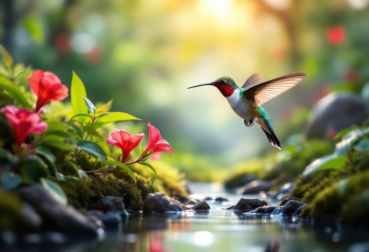Een prachtige kolibrie die over een beekje vliegt tussen twee bloemenvelden in, met prachtige bloemen, hoge resolutie fotografie, met uitmuntende kwaliteit en details.