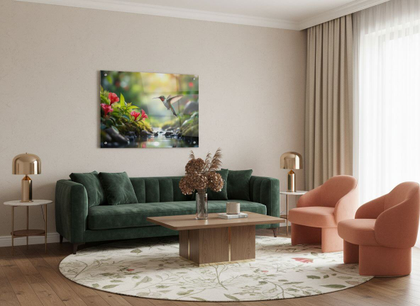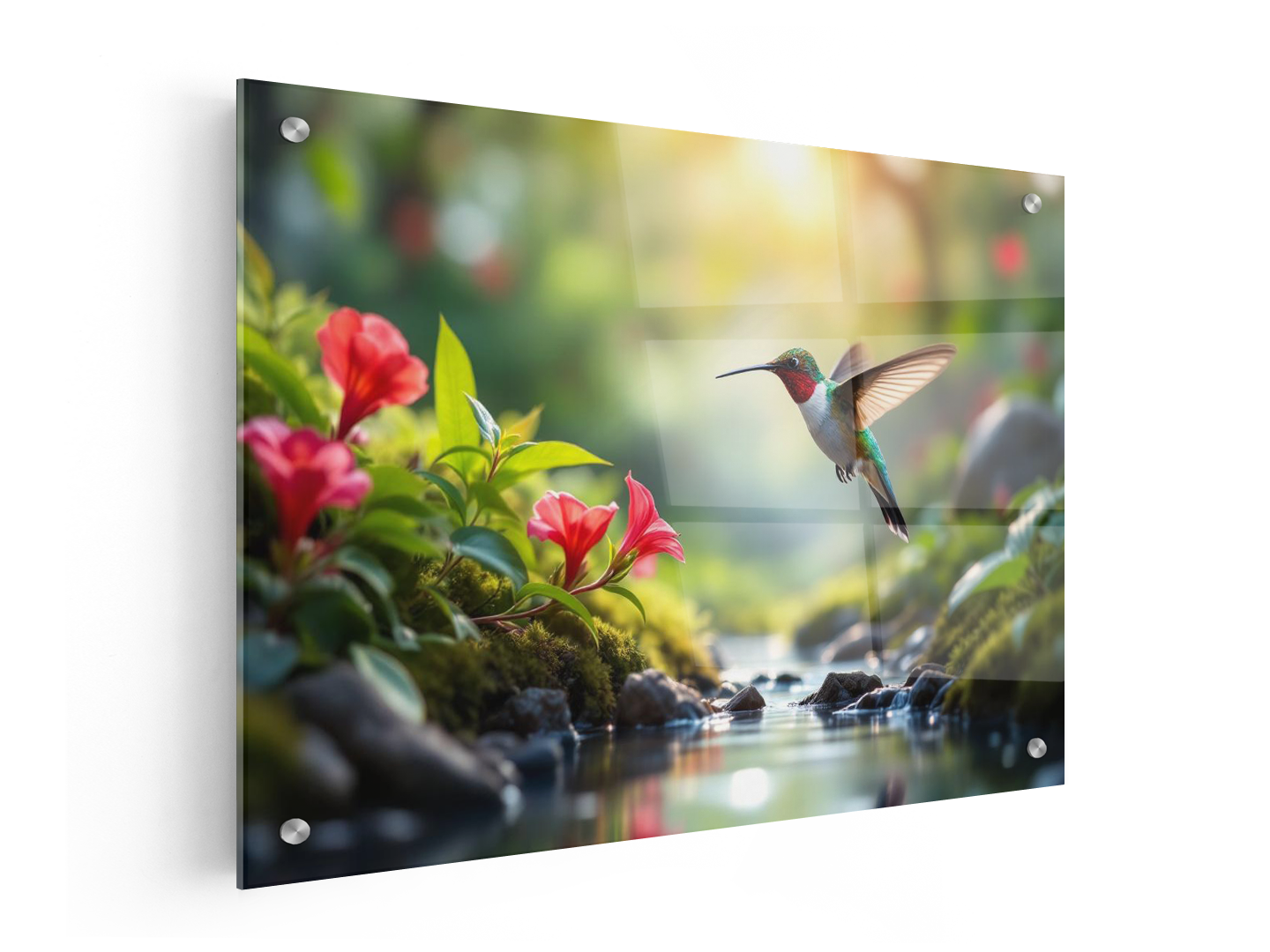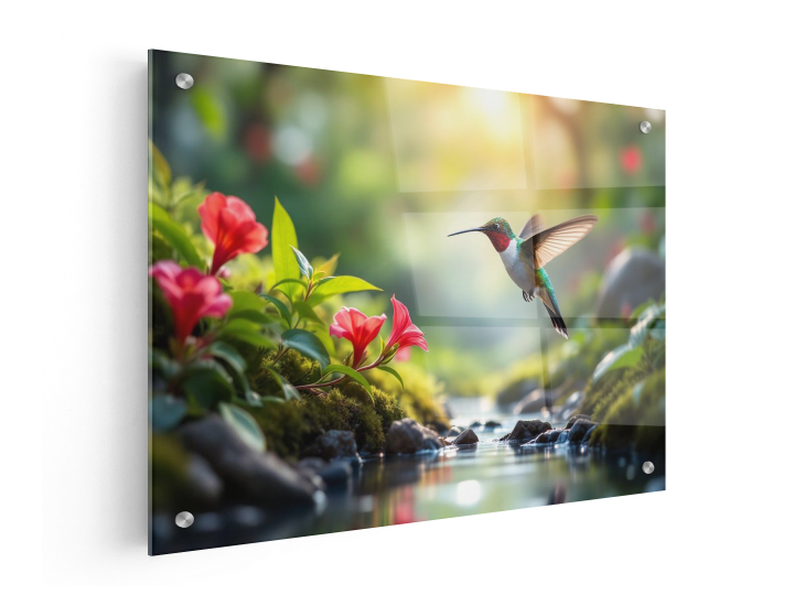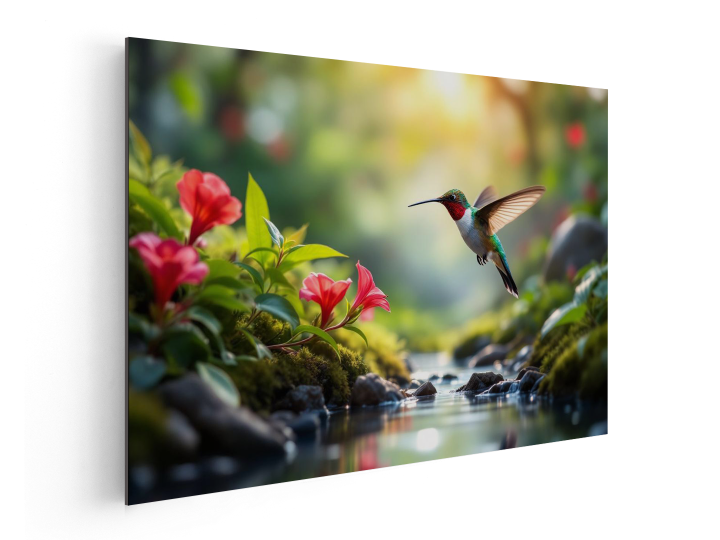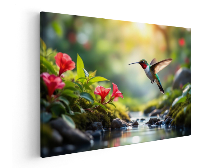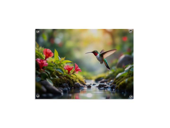 Een prachtige kolibrie die over een beekje vliegt tussen twee bloemenvelden in, met prachtige bloemen, hoge resolutie fotografie, met uitmuntende kwaliteit en details.