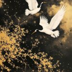 Japanse sumi-e schildering van twee kraanvogels in vlucht, minimalistische inktlijnen gecombineerd met subtiele gouden accenten, symbolisch en elegant, rustige compositie, geen tekst of handtekeningen.
