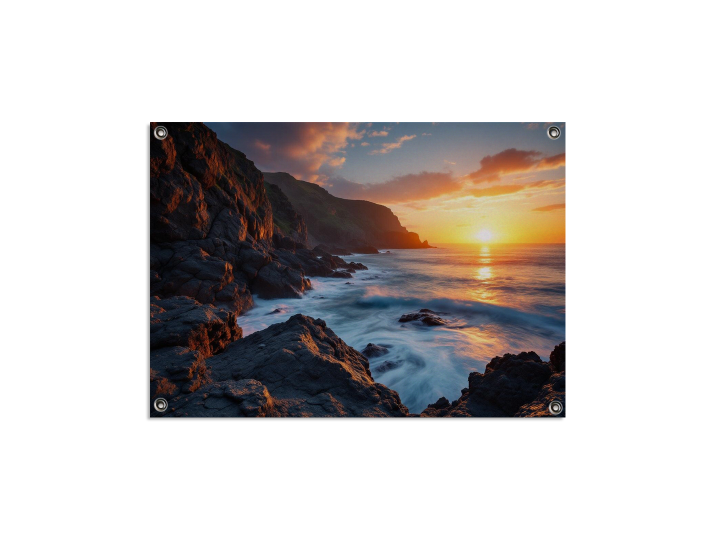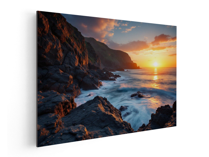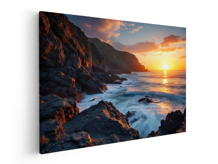 Dramatische rotsachtige kustlijn bij zonsondergang, lange belichtingstijd, oceaan golven, glad, zijdezacht water, warm tegenlicht, subtiele lens flare, filmisch contrast, ultragroothoeklens, hoge detailweergave, professionele landschapsfotografie.