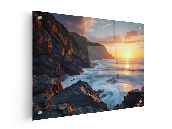 Plexiglas zorgt voor een mooie weerspiegeling, maar is niet transparant door de witte folie aan de achterzijde. Deze folie hoef je dus niet te verwijderen bij het ophangen. Bij fotorealistische prints geeft dit een bijzonder fraai effect, maar uiteraard staat het luxe en modern bij al onze designs -- ook bij de designs die je zelf hebt gemaakt.