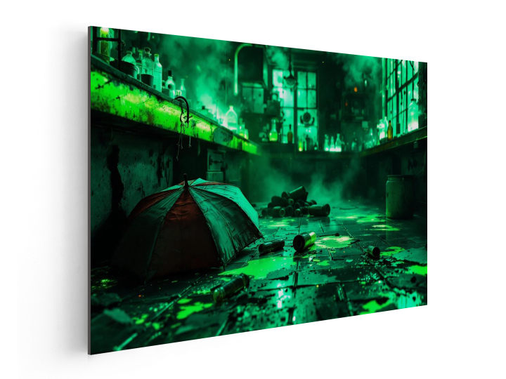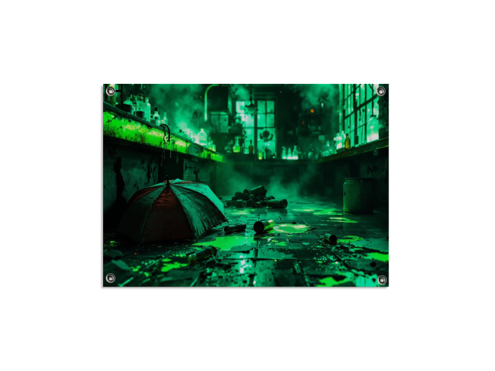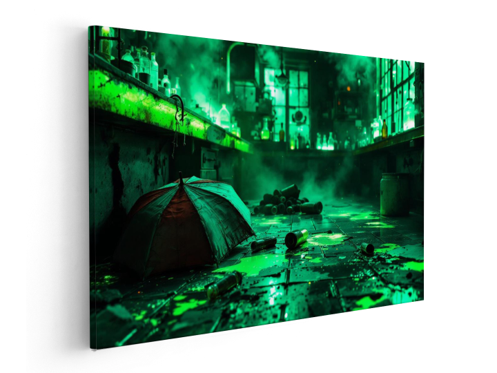 Een schimmig laboratorium met gebroken glazen buizen en een griezelige groene gloed, atmosferische nevel, gloeiende vloeistof reflecties, subtiele filmkorrel, een bio-horror film poster-esthetiek.