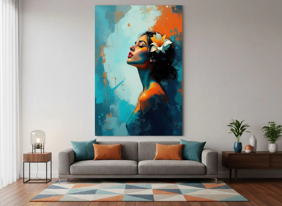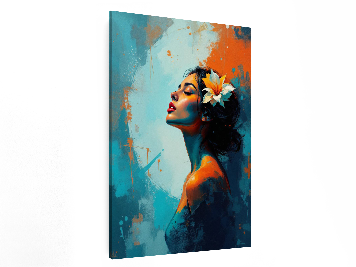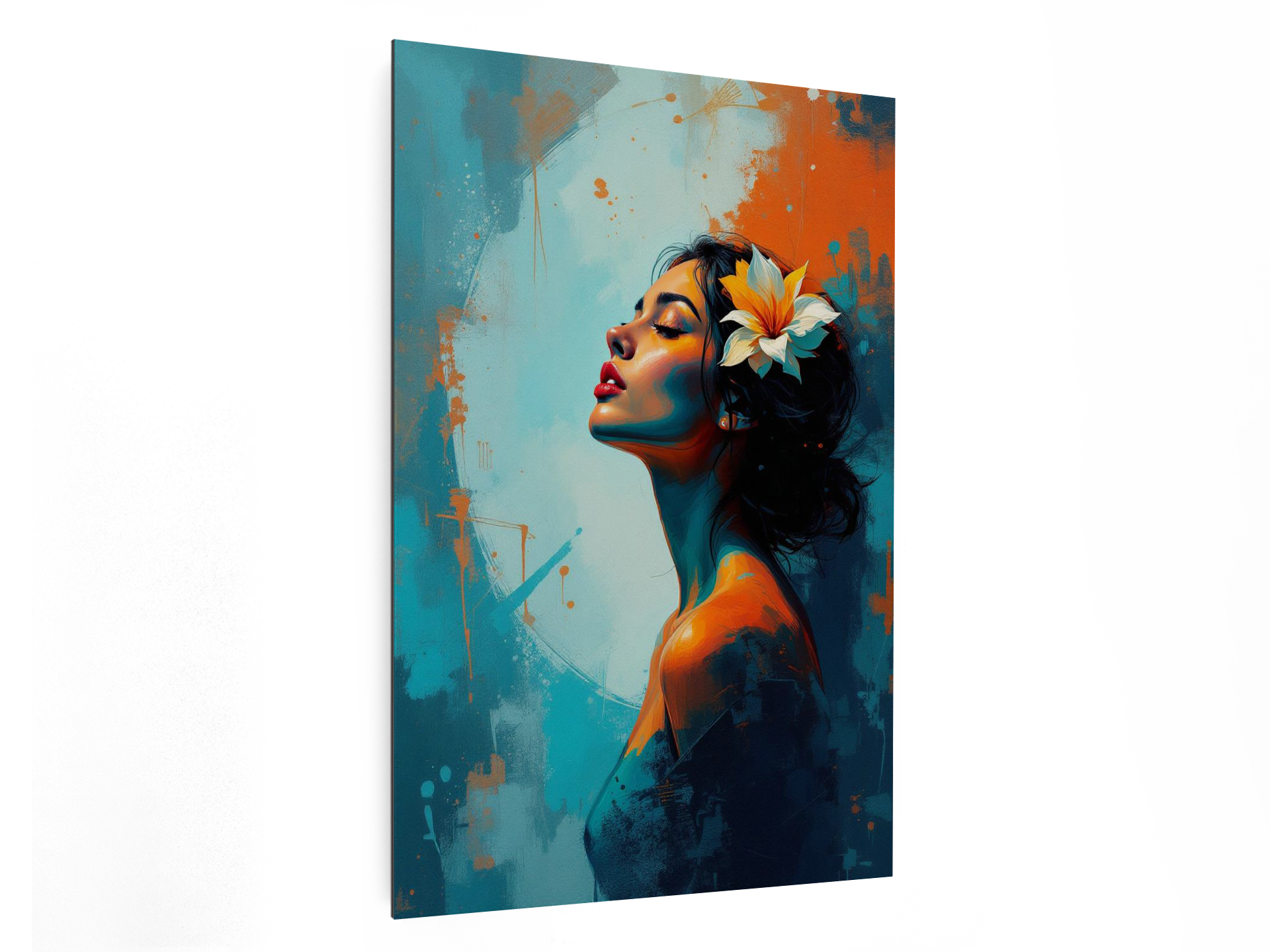 Een krachtig semi-abstract digitaal schilderij van een mooie vrouw in zij aanzicht, de vrouw heeft een prachtige bloem opgestoken in haar haren, ze kijkt omhoog met waardigheid en kracht. De stijl combineert expressieve penseelstreken, gedurfde texturen en een levendig contrast tussen vurige rood / oranje highlights op de huid en diepe turquoise blauwe schaduwen op de achtergrond. De kleding is losjes geschilderd met abstracte penseelstreken, wat een moderne artistieke sfeer creëert, terwijl de figuur zelfvertrouwen en aanwezigheid uitstraalt. De achtergrond is abstract met gelaagde verf effecten, spatten en texturen, en doet denken aan een canvas van galeriekwaliteit. Filmische belichting, een sterke uitstraling van kracht en sereniteit, eigentijdse kunststijl. Minimalistisch grafisch ontwerp.