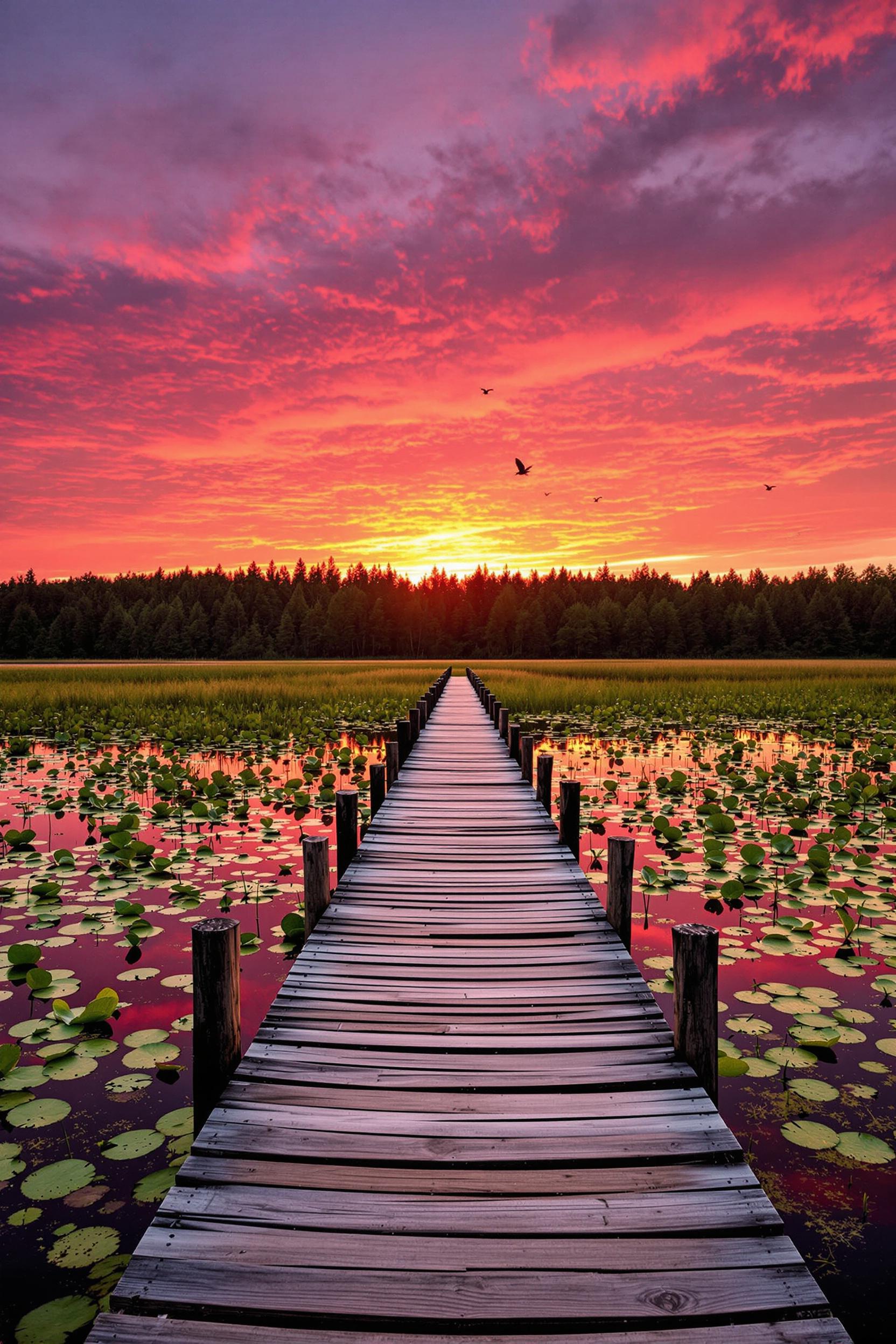 een lange steiger, die zich uitstrekt over een moerasgebied, met waterlelies die drijven op het troebele water, in de verte is een prachtig bos, met een mooie rode zonsondergang achter de boomgrens die de hele lucht in een rode gloed en paarse wolken kleurt