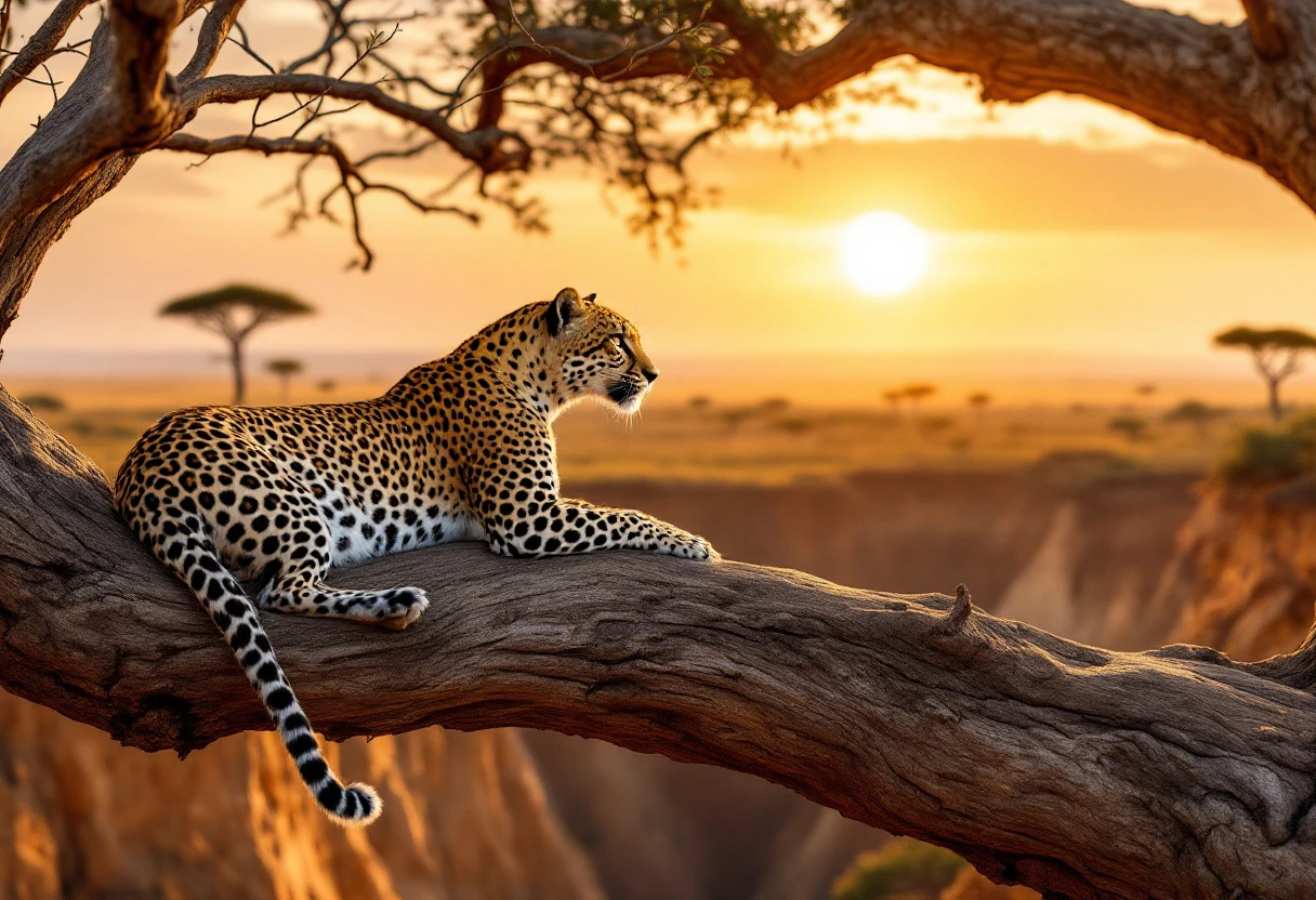 Een luipaard ligt op een dikke tak en kijkt uit over een ravijn met een safari-achtig landschap en een laagstaande zon.