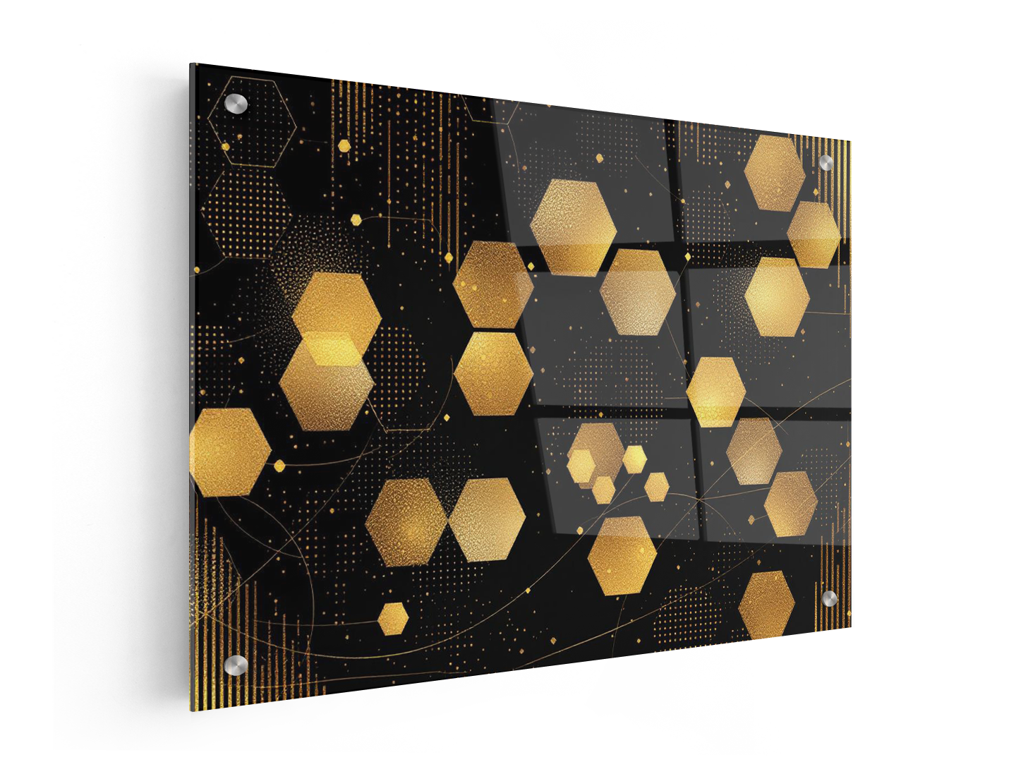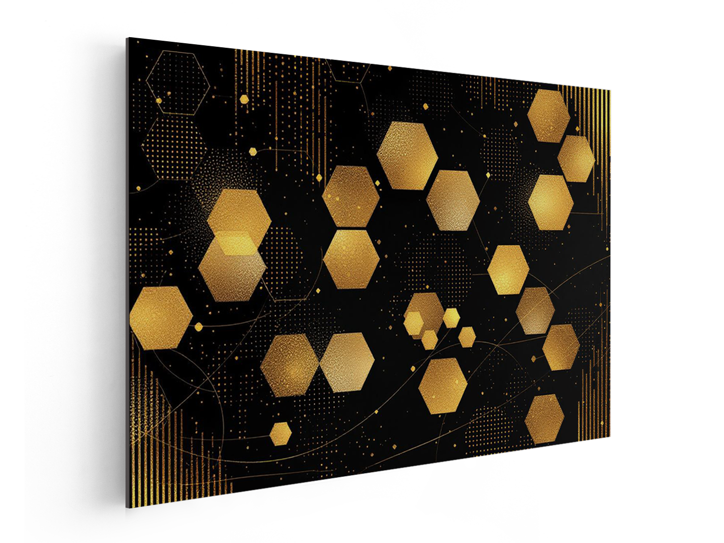 Een abstract, luxe kunstontwerp in zwart en goud, met een bijenkorfpatroon, gouden zeshoeken tegen een donkere achtergrond, met enkele zilveren stippen en strepen op de achtergrond.