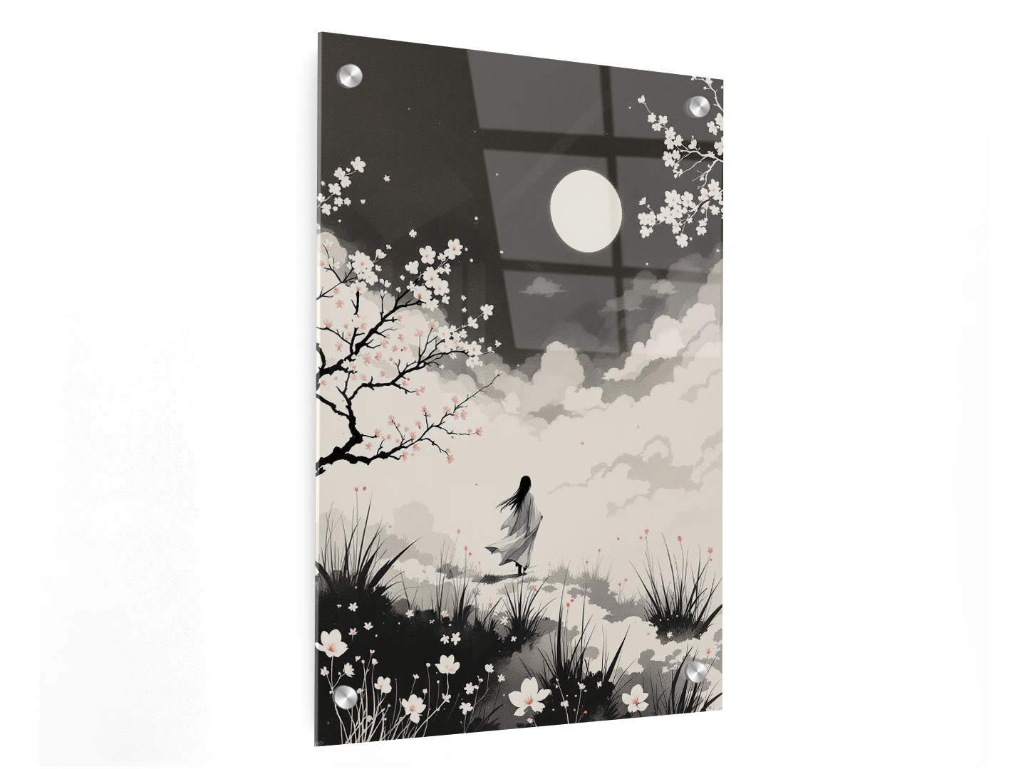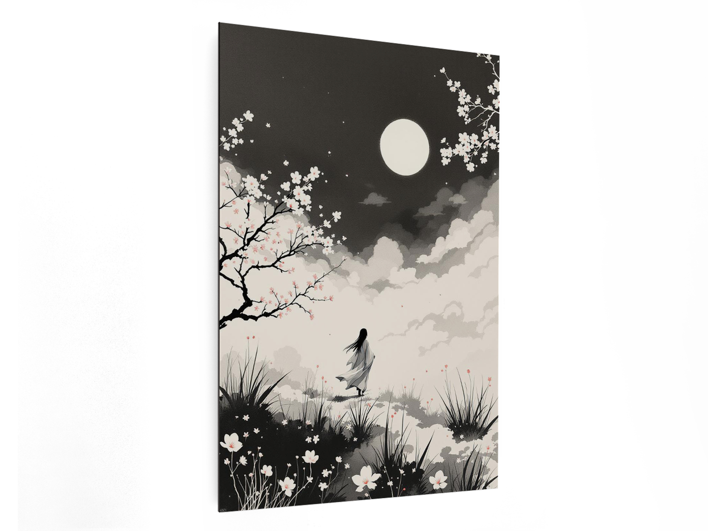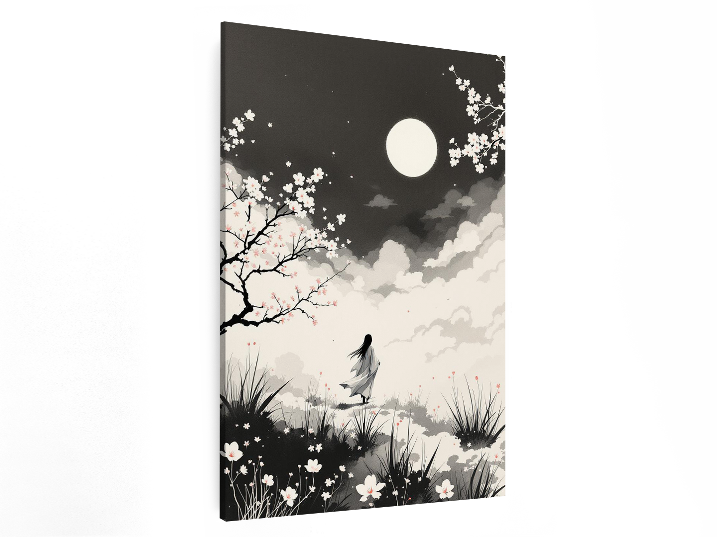Utagawa Kuniyoshi-stijl, shin hanga, ukiyoe-klassiekers heruitgevonden in minimalistische vormen, vergankelijke schoonheid, vloeiende gewaden, kersenbloesems, zen-monochromie, inktvlekken, arcering, kruisarcering, vloeiend, vergankelijk, gewaad stof, zachtheid van bloemblaadjes, viscositeit van inkt, moderne herinterpretatie, inktzwart, maanlicht door wolken, vergankelijke schoonheid, klassieke ukiyoe, vergankelijkheid, nostalgie.