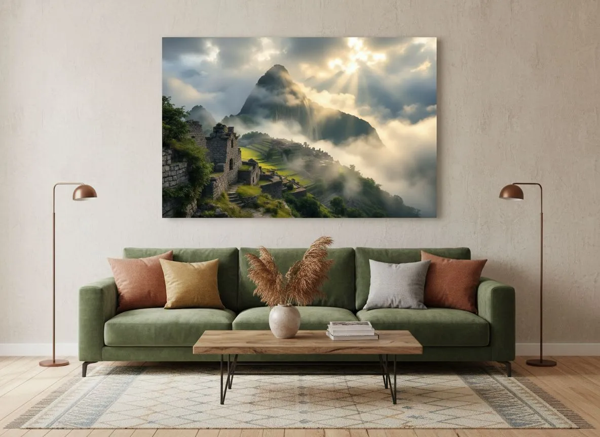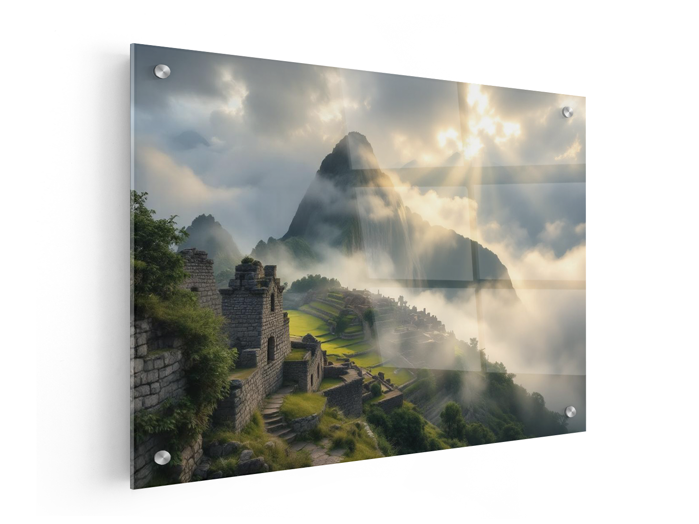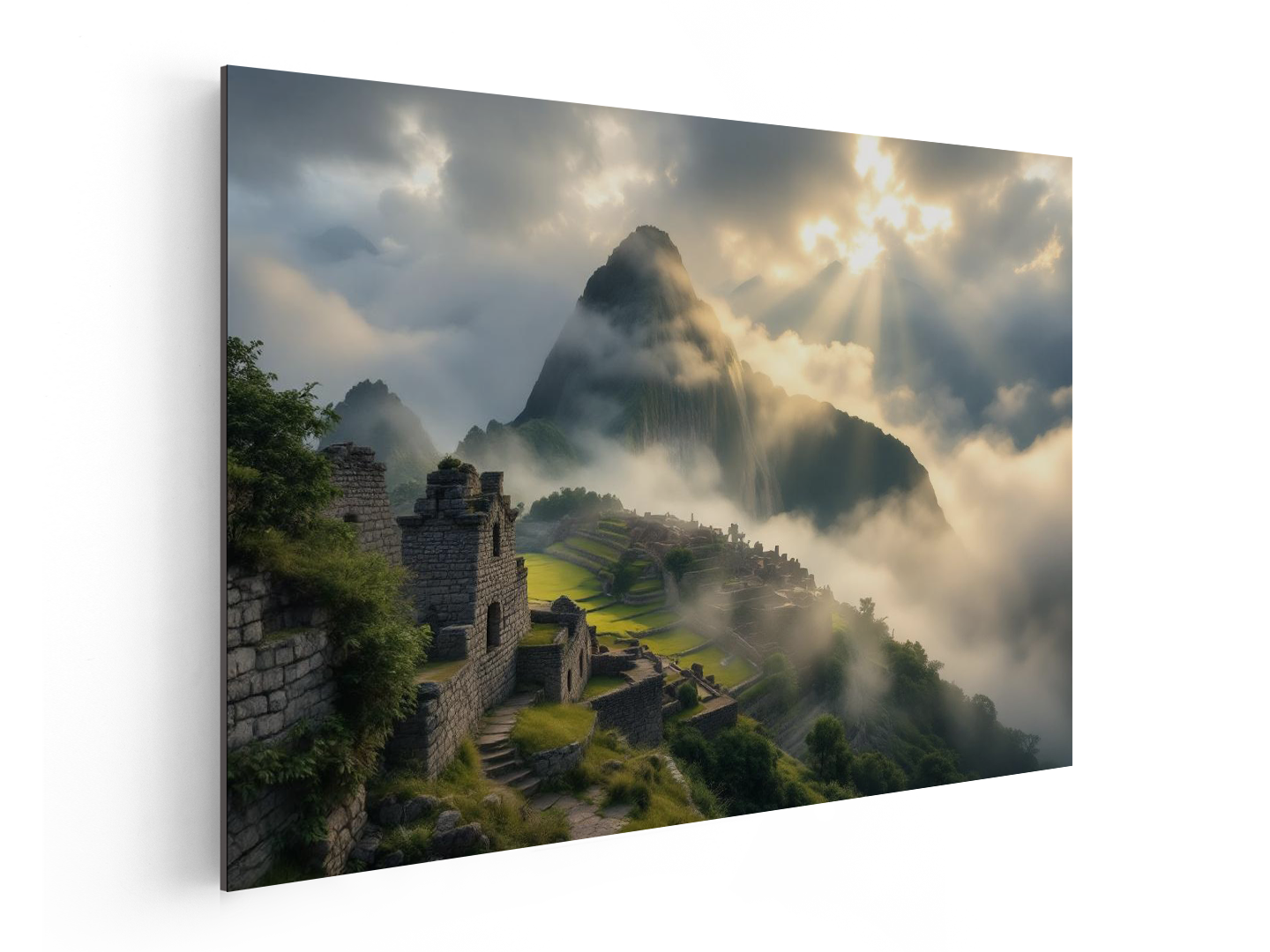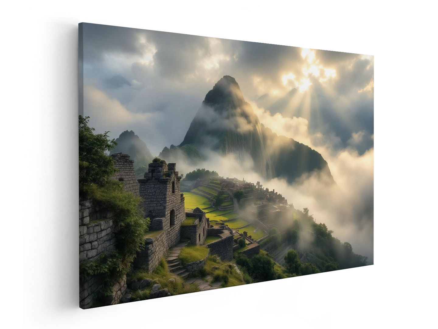 Epische, cinematografische weergave van Machu Picchu bij zonsopkomst, oude ruïnes omringd door rollende wolken en mist, bergtoppen die verdwijnen in nevel, zachte zonnestralen door de bewolking, sfeervol en mystiek, ultra-gedetailleerde texturen, groothoeklens, foto realistisch, 8K fine art landschap print.