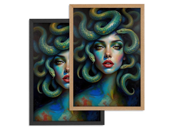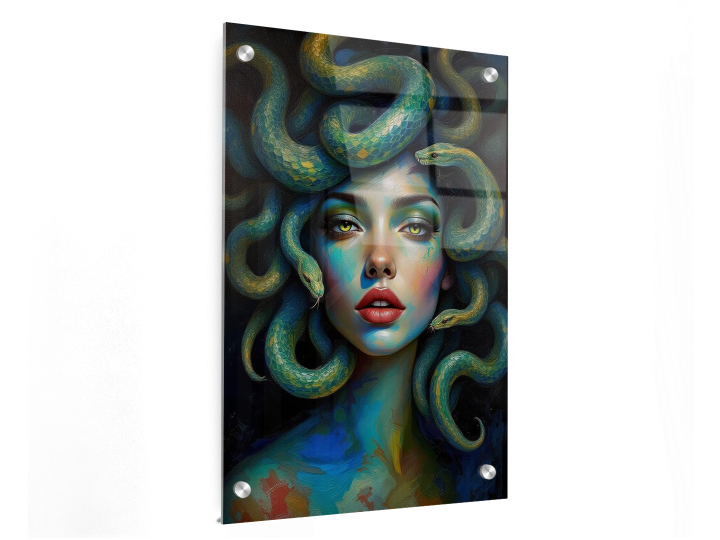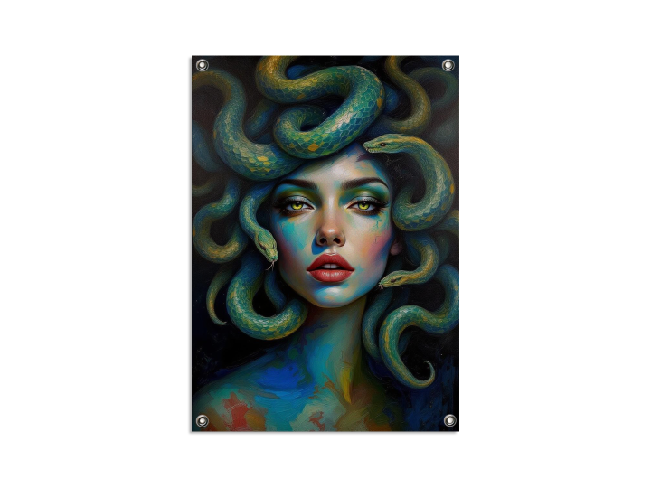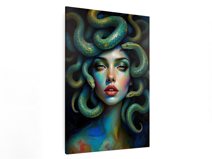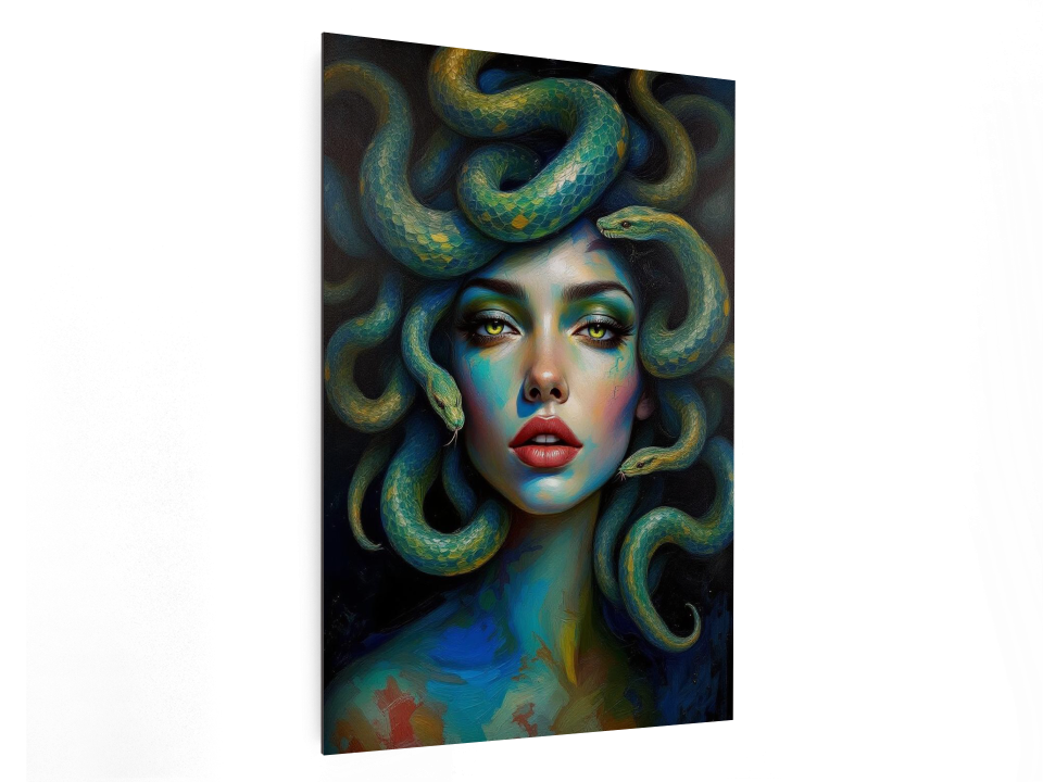 Een episch en levendig impasto-portret van het gezicht van Medusa, een prachtige vrouw met slangen als haar, met een geweldige vloeiende beweging door het kunstwerk en dikke, gelaagde verftexturen, verbluffend uitziende slangen, ongelooflijke details en een hoge kwaliteit.