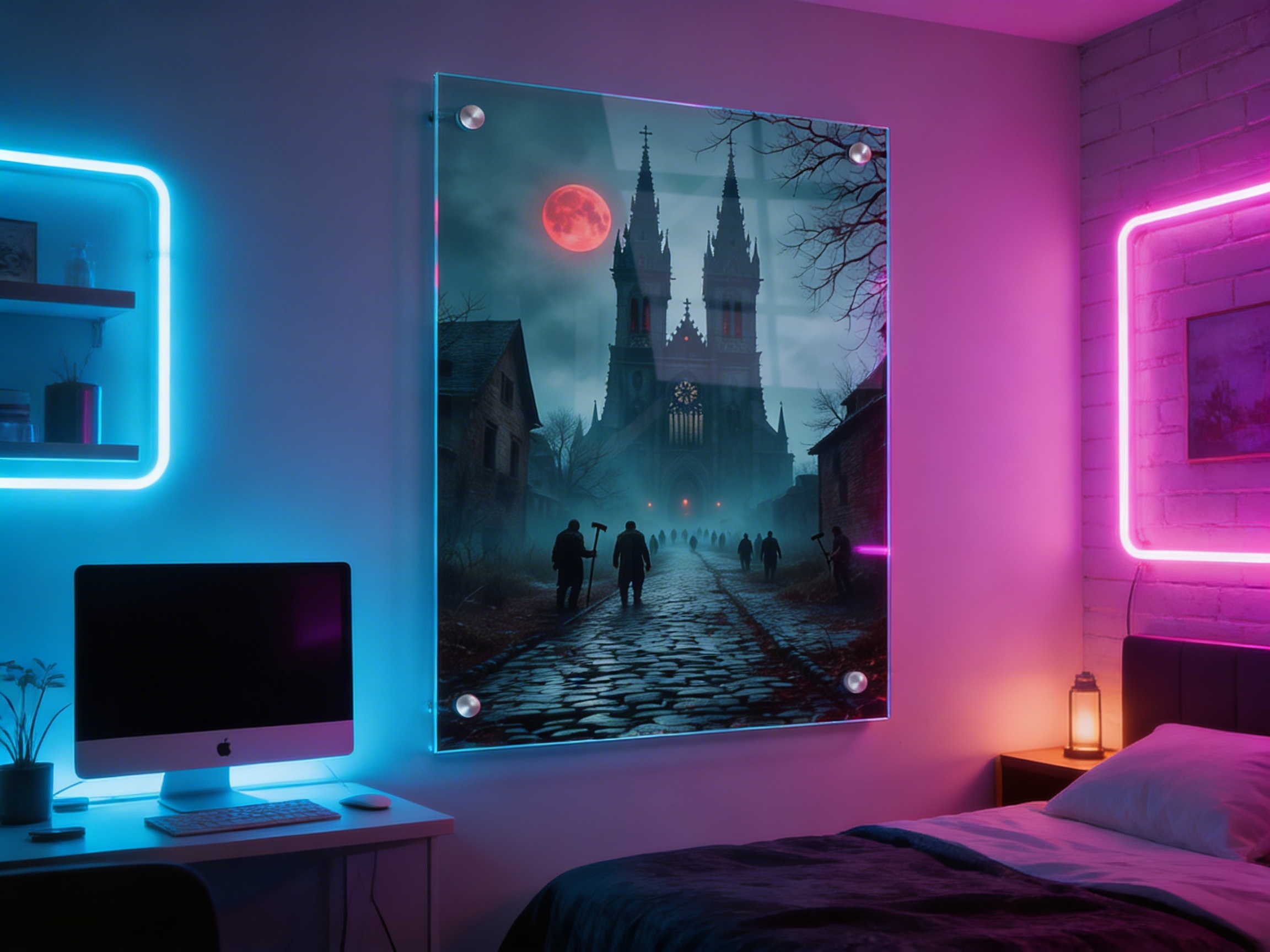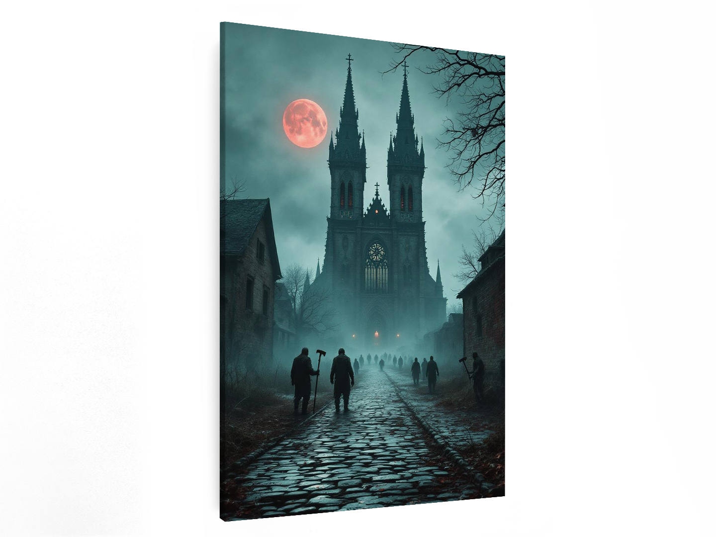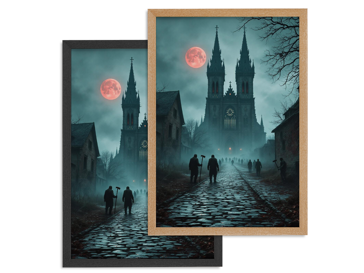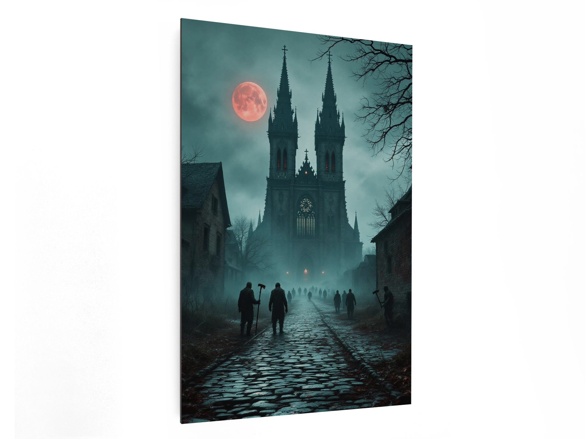 Een smal pad leidt naar een oud Oost-Europees dorpsplein, met een kerk in het midden. Mistige en onheilspellende weersomstandigheden, in de verte zijn silhouetten te zien van slanke boeren met houwelen en/of schoppen. Een griezelige, filmische compositie, vervormde lichteffecten, een hoogwaardig ontwerp voor een horror-actie poster.