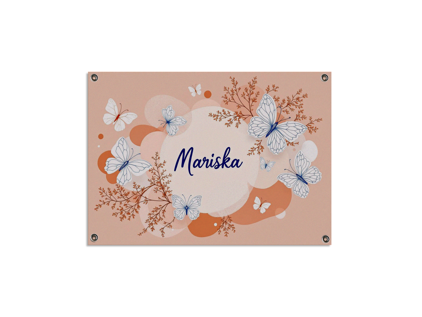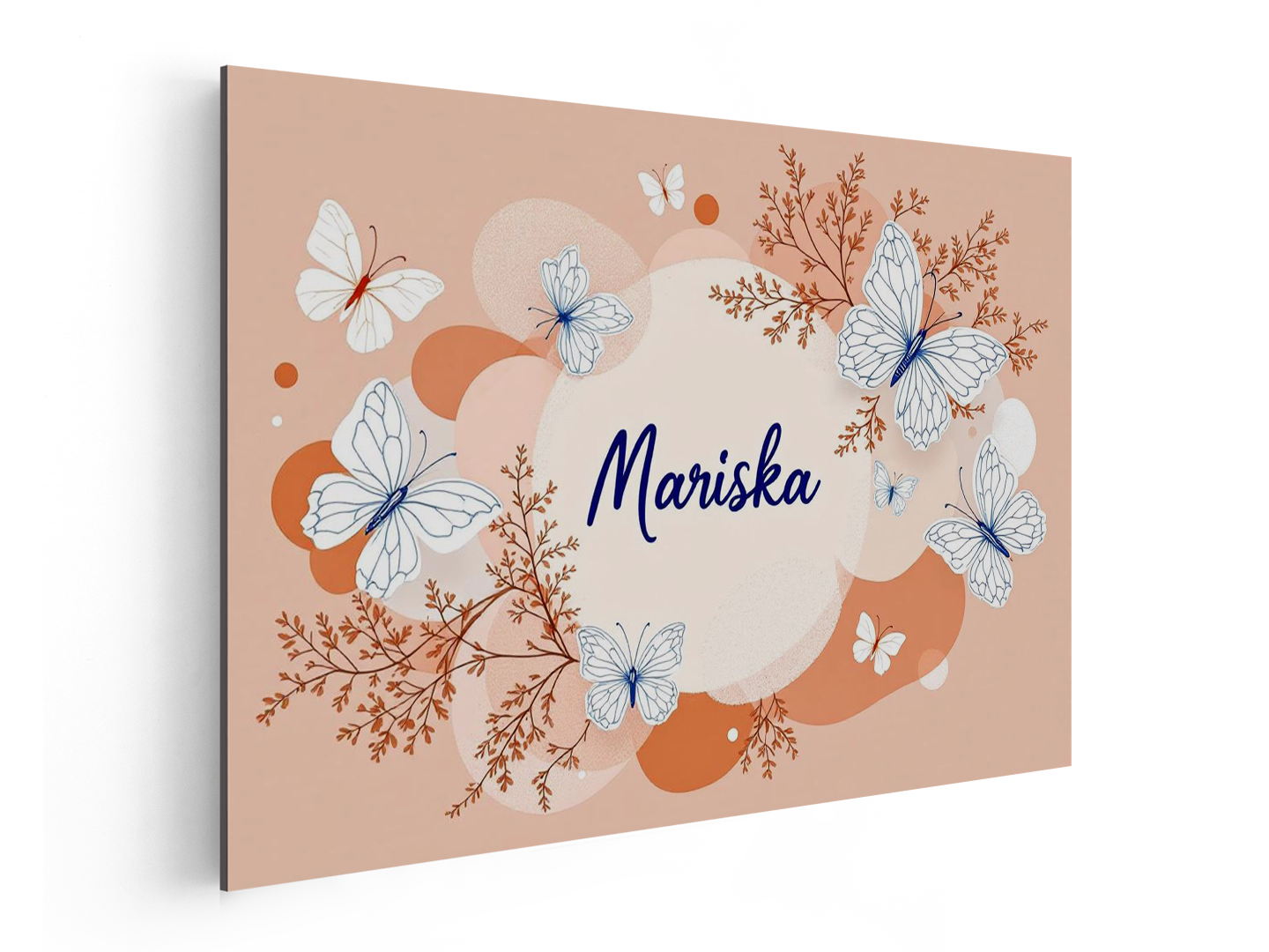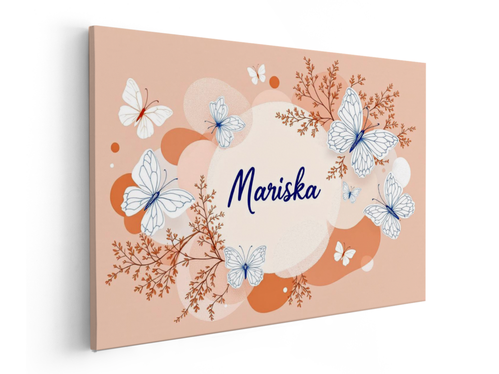 Een nursery art design met prachtige lijntekeningen van vlinders, met een terracotta achtergrond met zachte pastel kleurige abstracte vormen, met in het midden de naam: “Mariska” in sierlijke dunne letters.