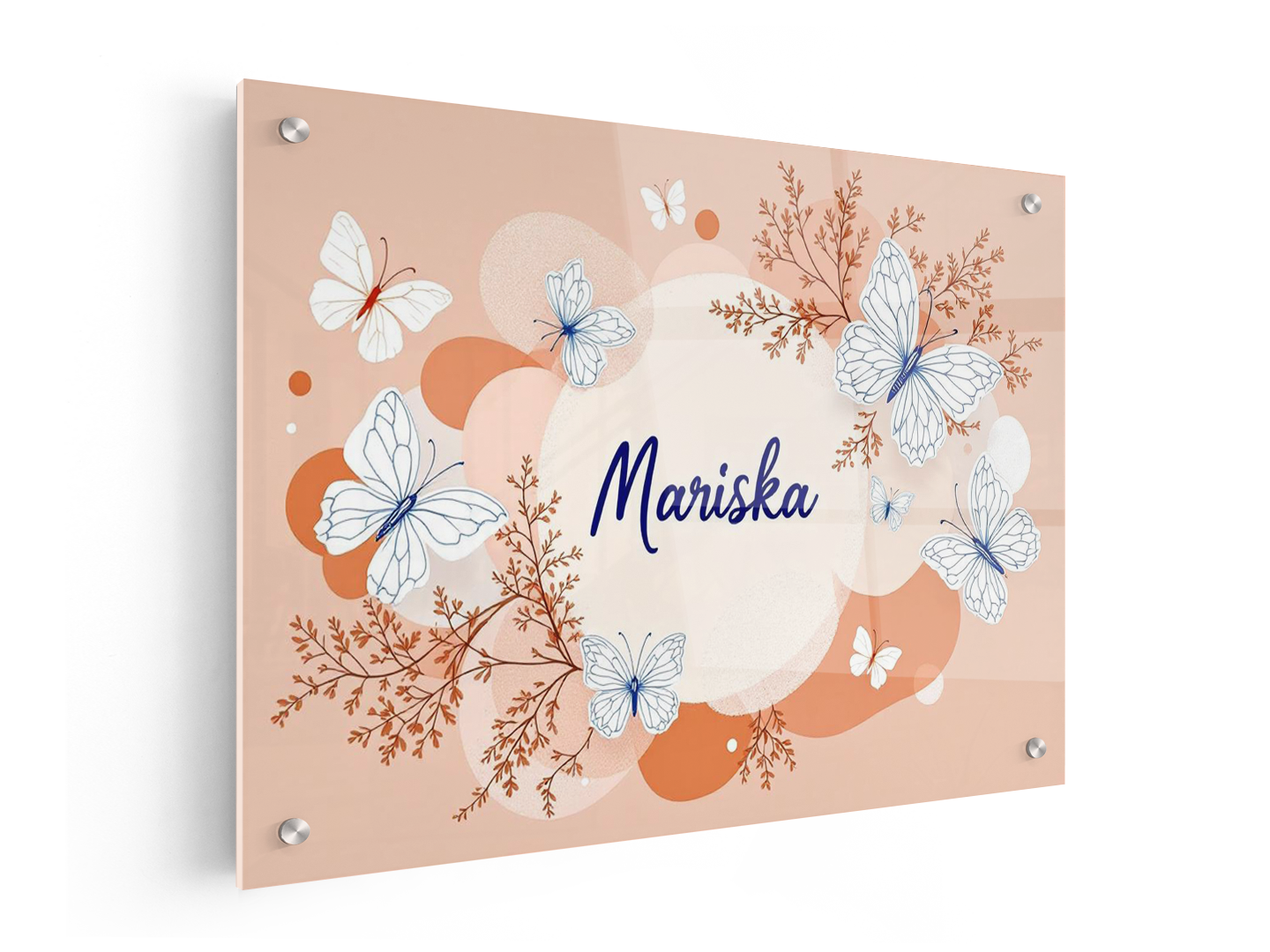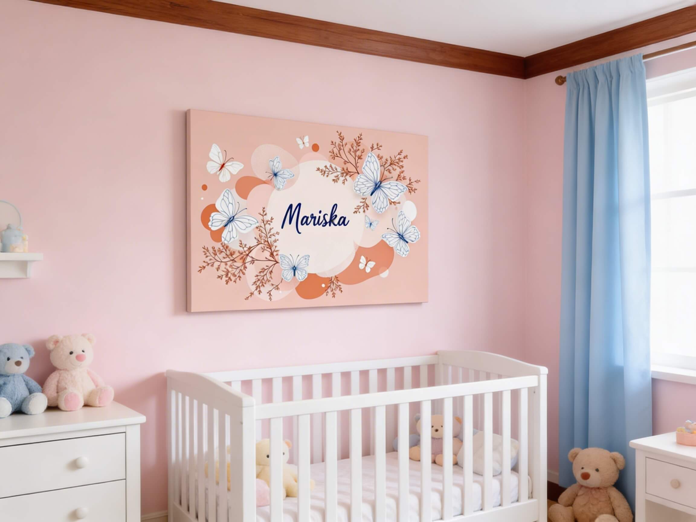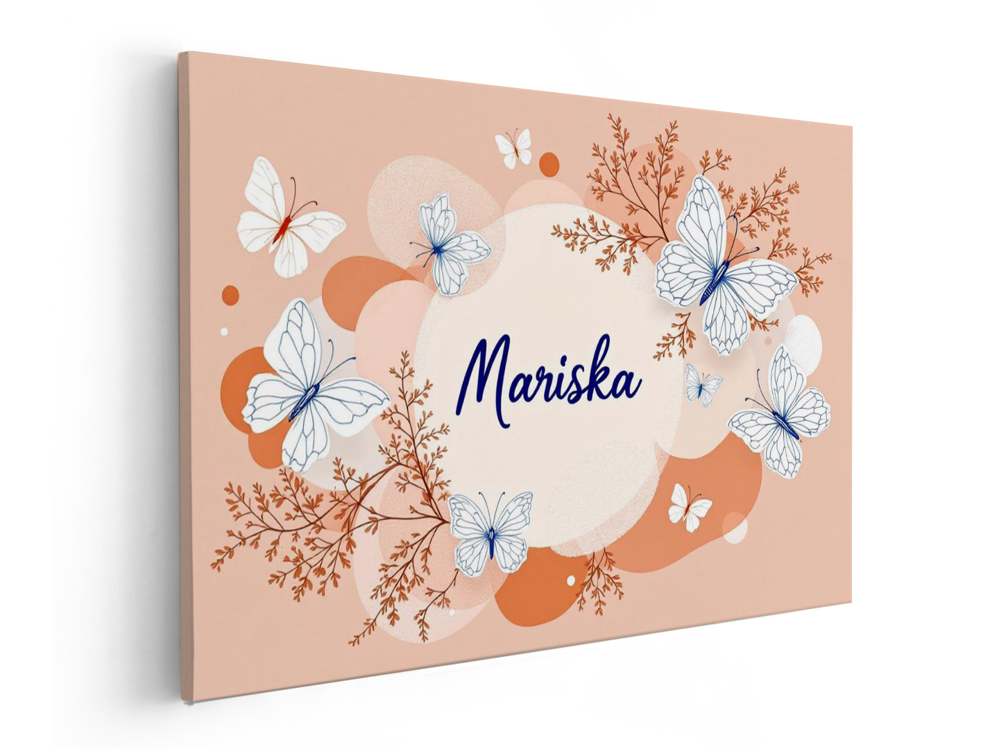 Een nursery art design met prachtige lijntekeningen van vlinders, met een terracotta achtergrond met zachte pastel kleurige abstracte vormen, met in het midden de naam: “Mariska” in sierlijke dunne letters.