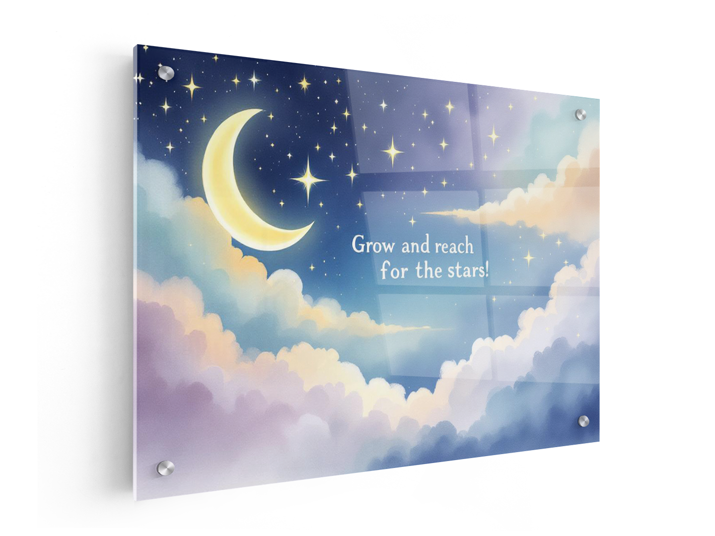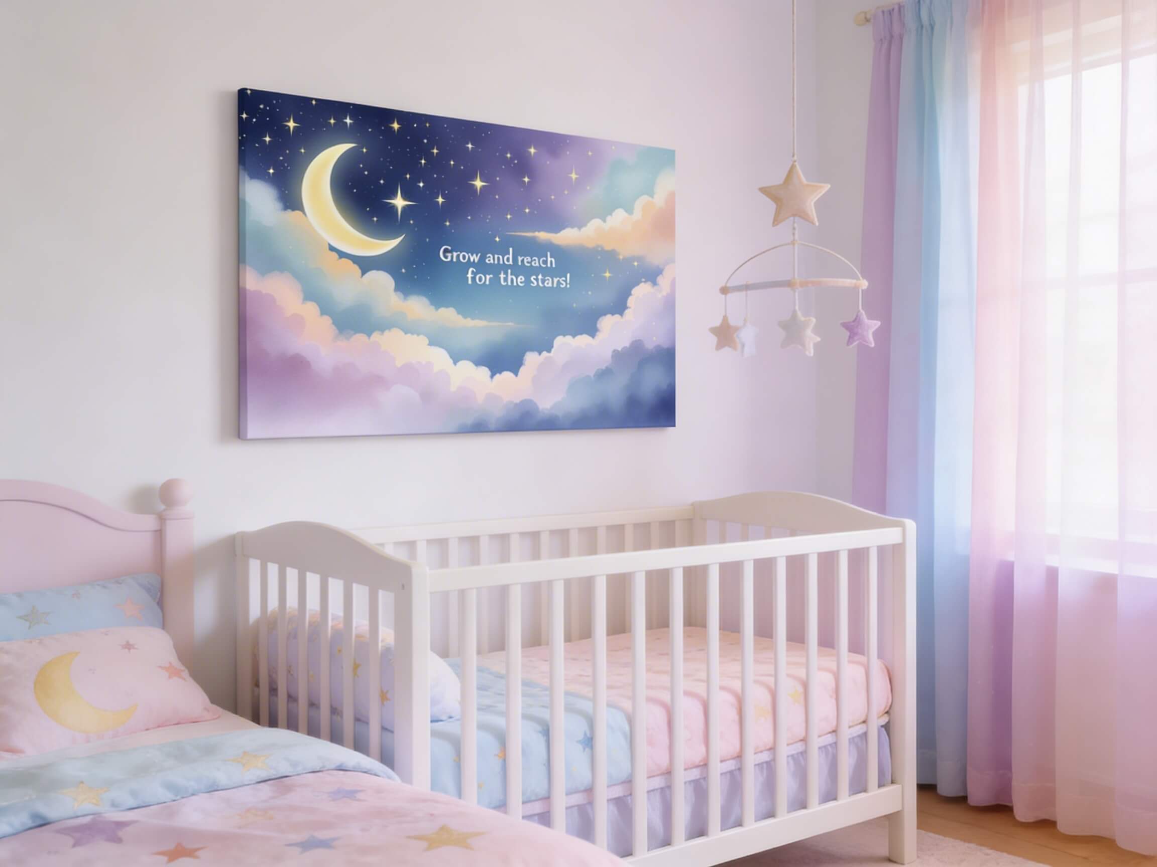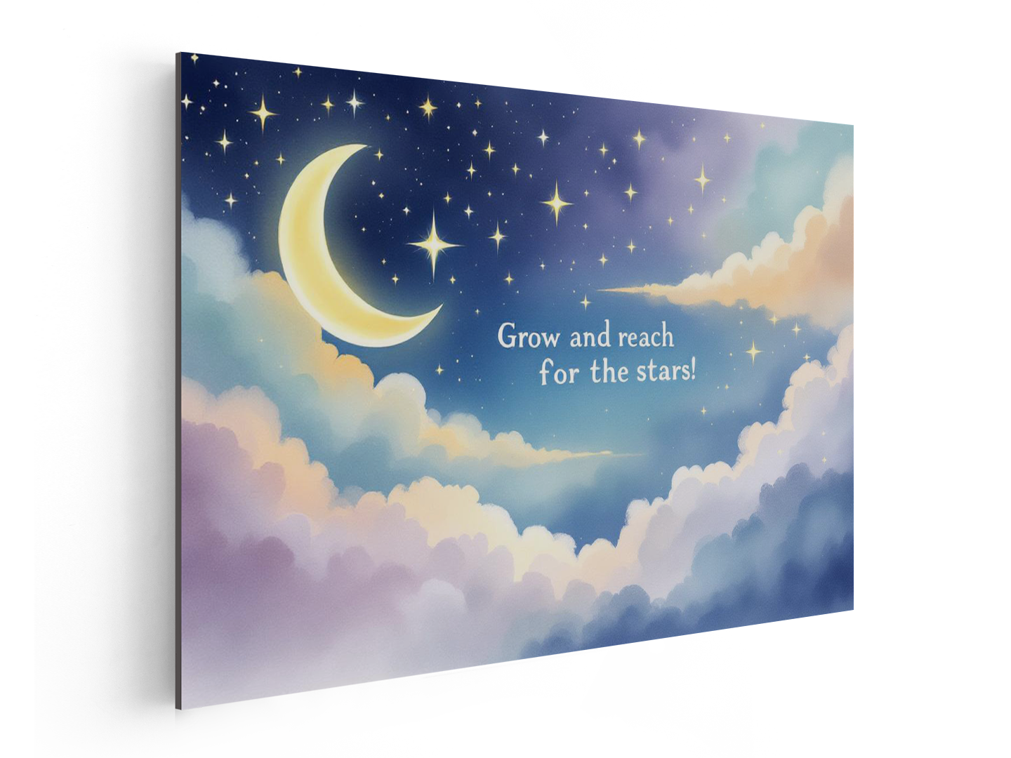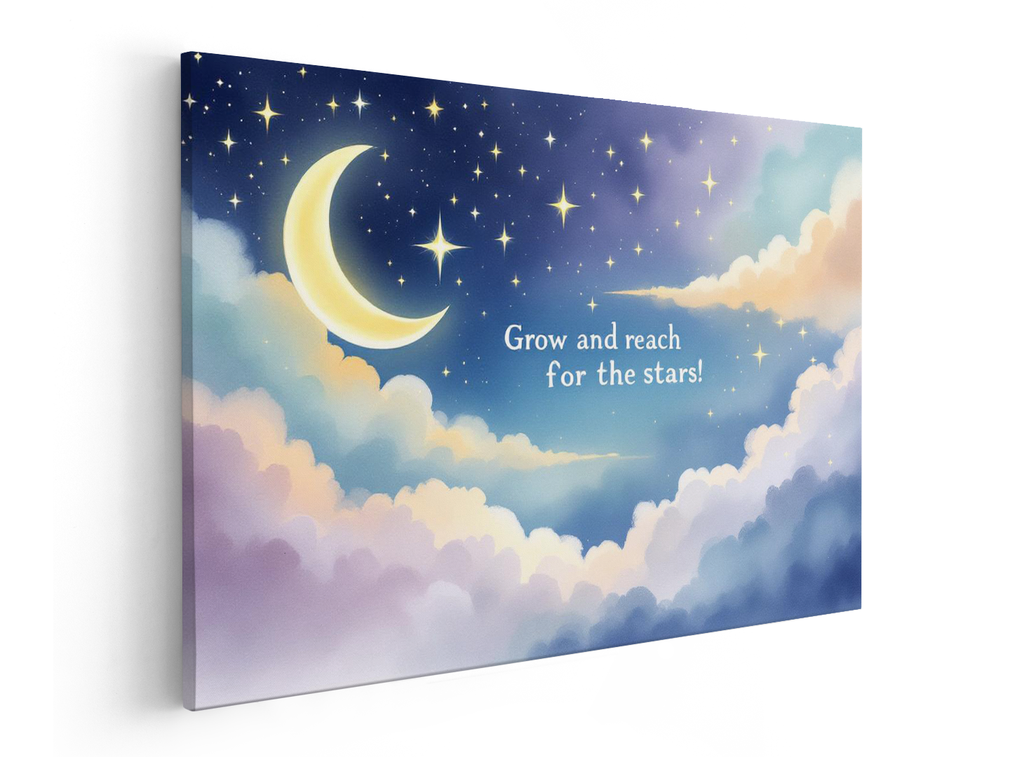 Een prachtig waterverf schilderij van een sterrenhemel met een maan, in een kinderboeken prent stijl, prachtige pastel kleuren, met de tekst: “Grow and reach for the stars!” In een dromerig lettertype, met geweldige kwaliteit en details.