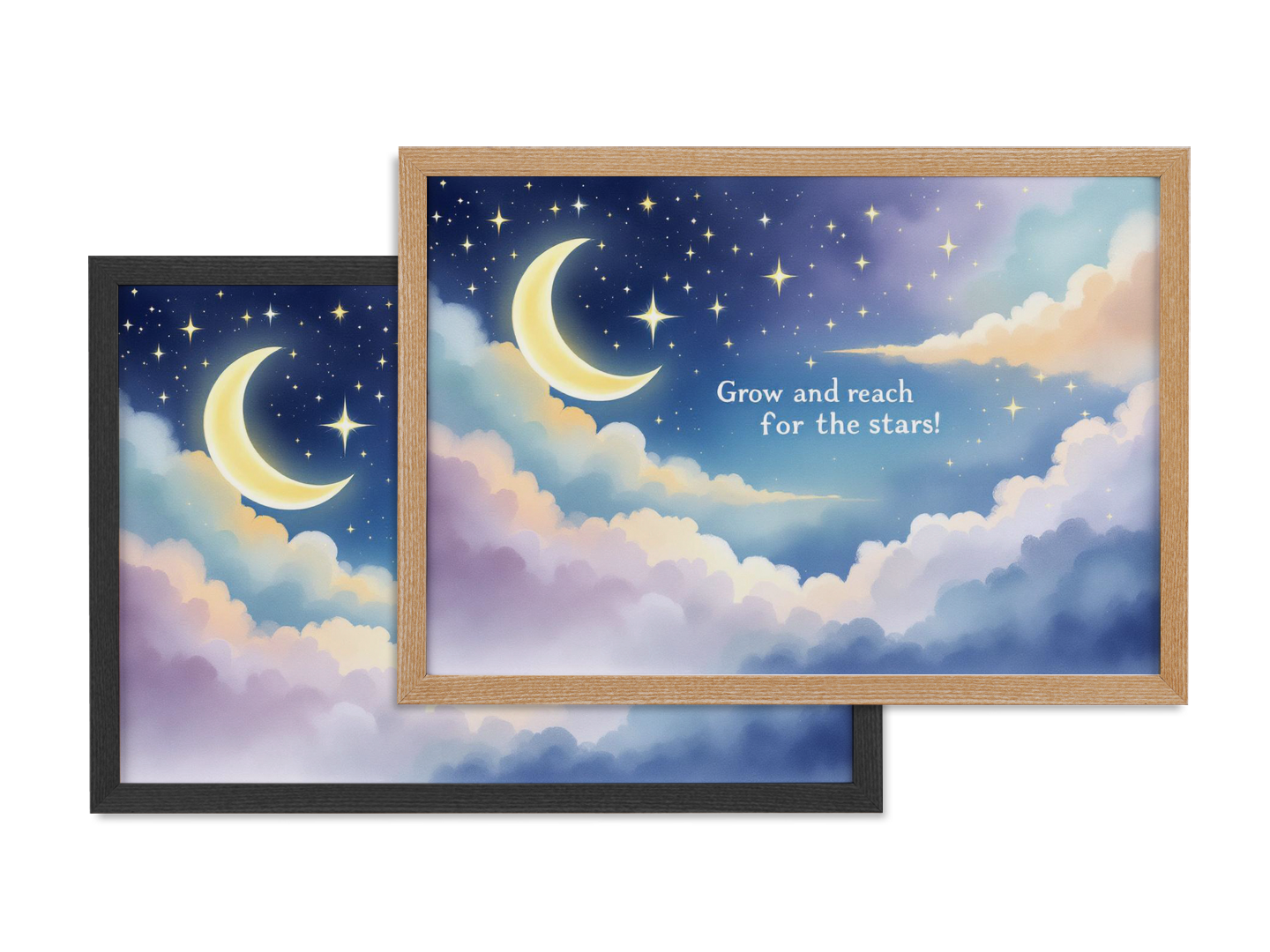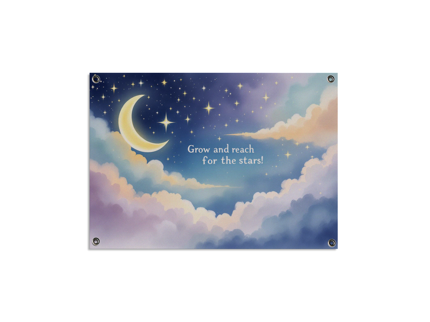 Een prachtig waterverf schilderij van een sterrenhemel met een maan, in een kinderboeken prent stijl, prachtige pastel kleuren, met de tekst: "Grow and reach for the stars!" In een dromerig lettertype, met geweldige kwaliteit en details.