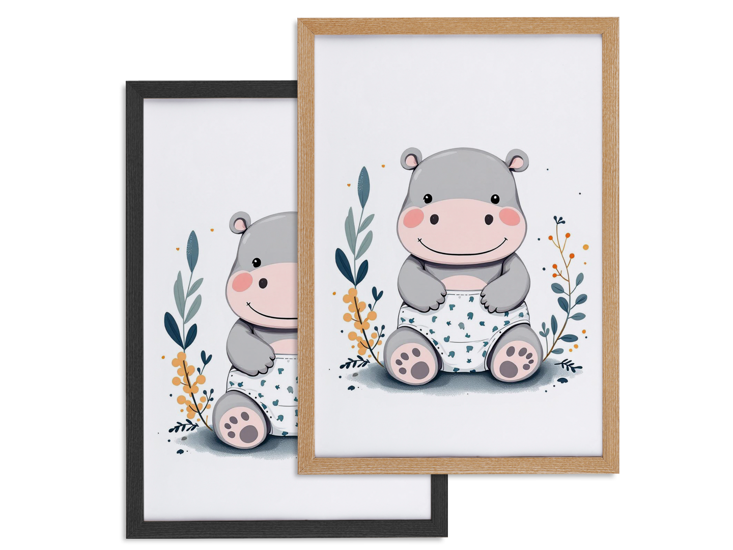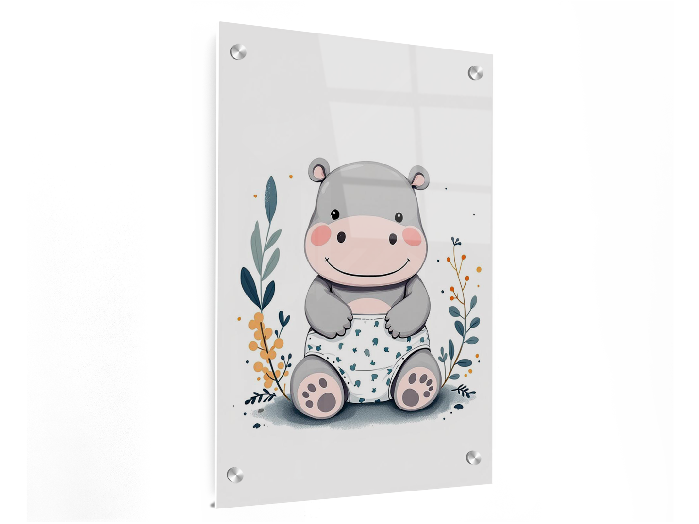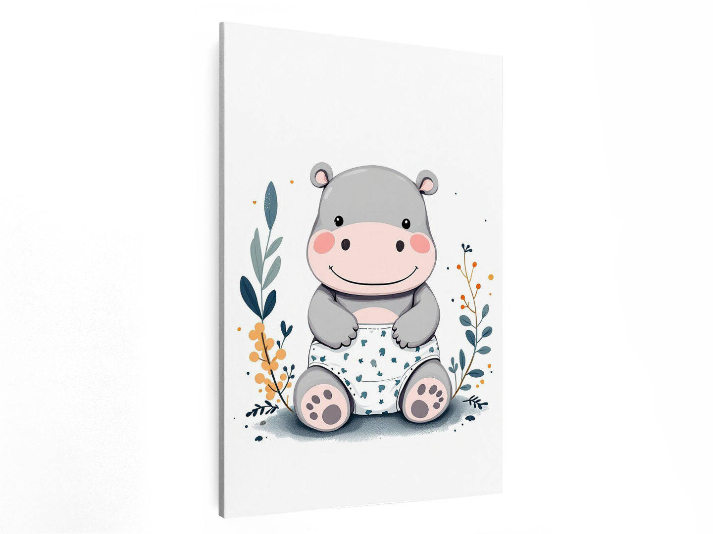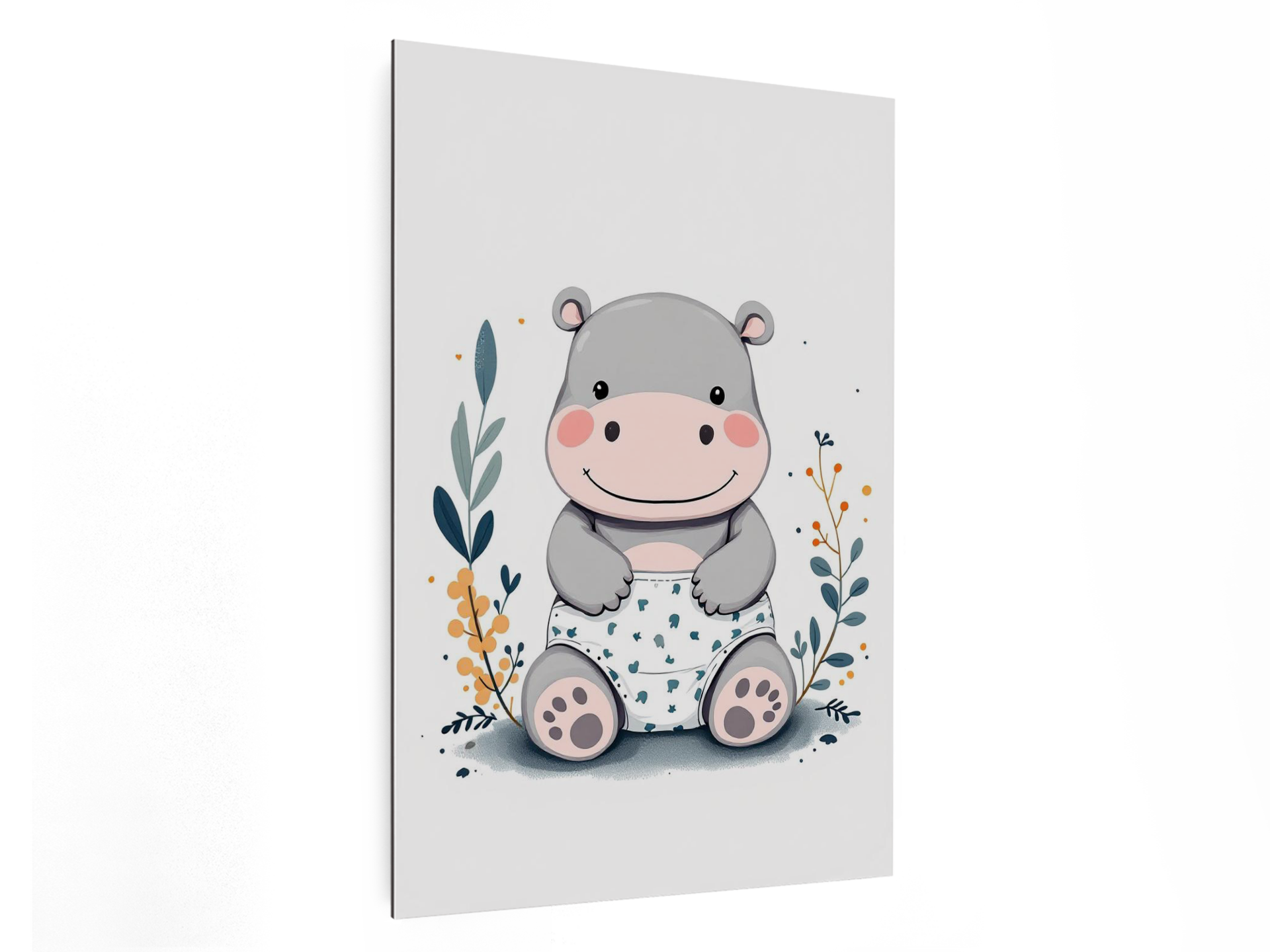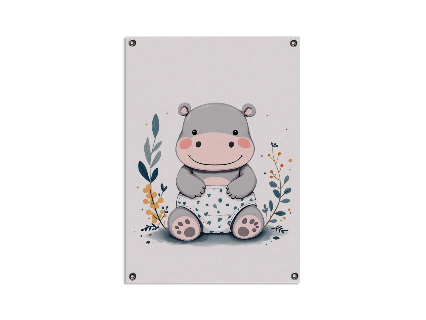 Een modern minimalistische illustratie van een schattige nijlpaard baby, met een rammelaar, een luier en een speen, in een minimalistische boho stijl.