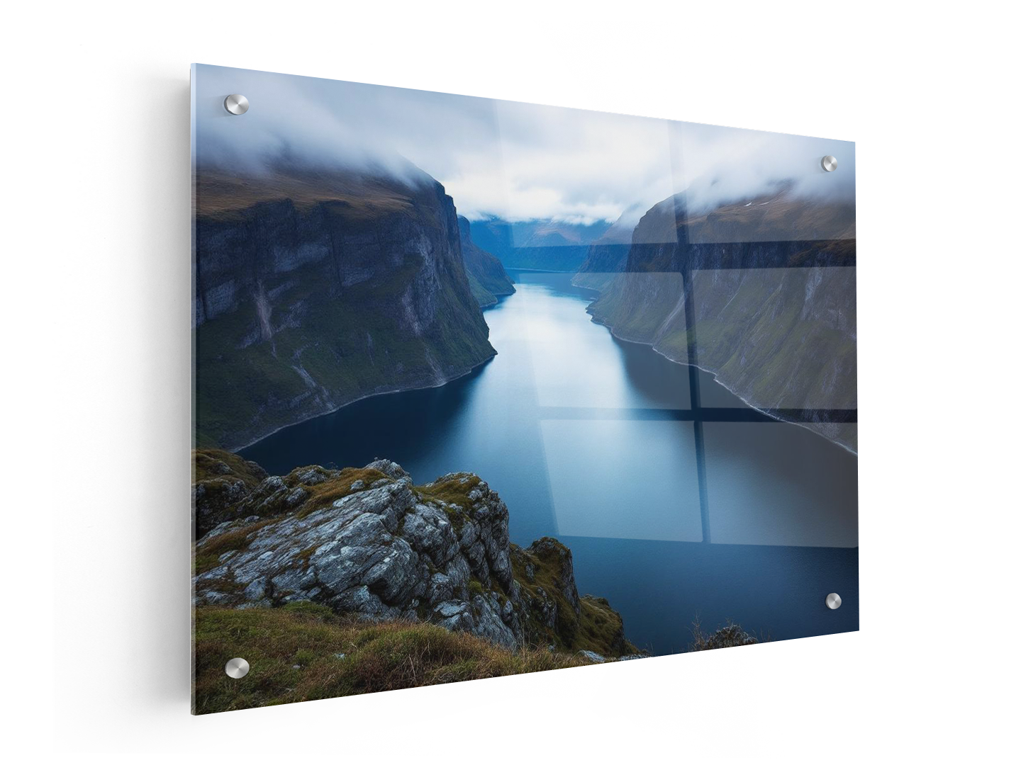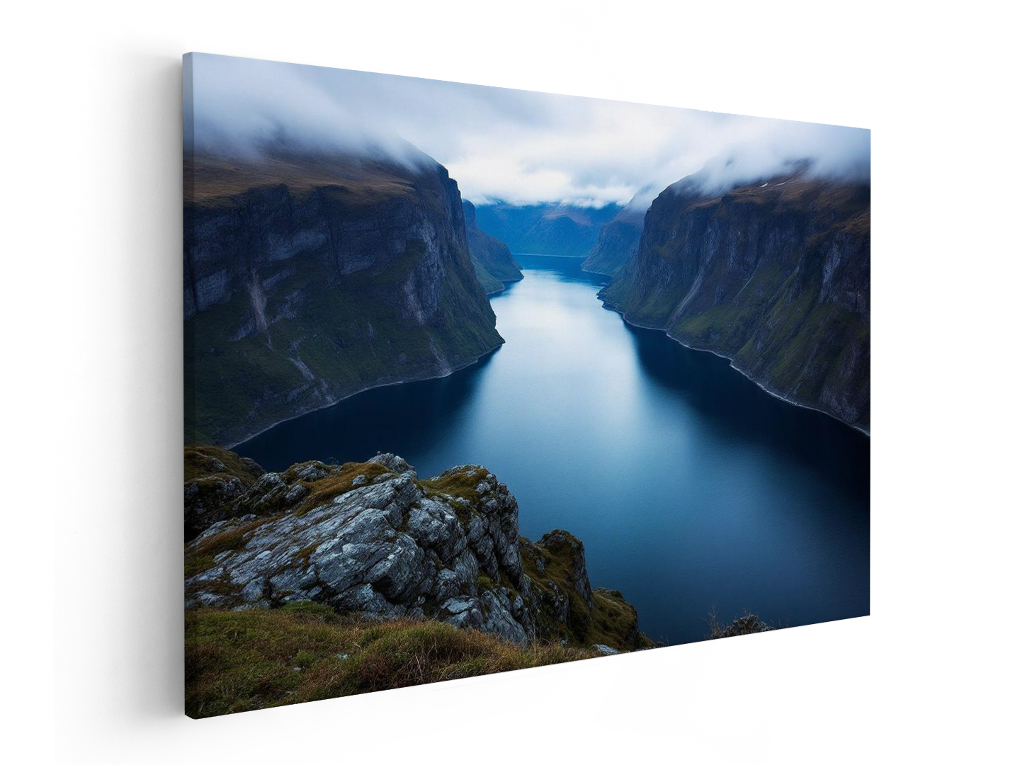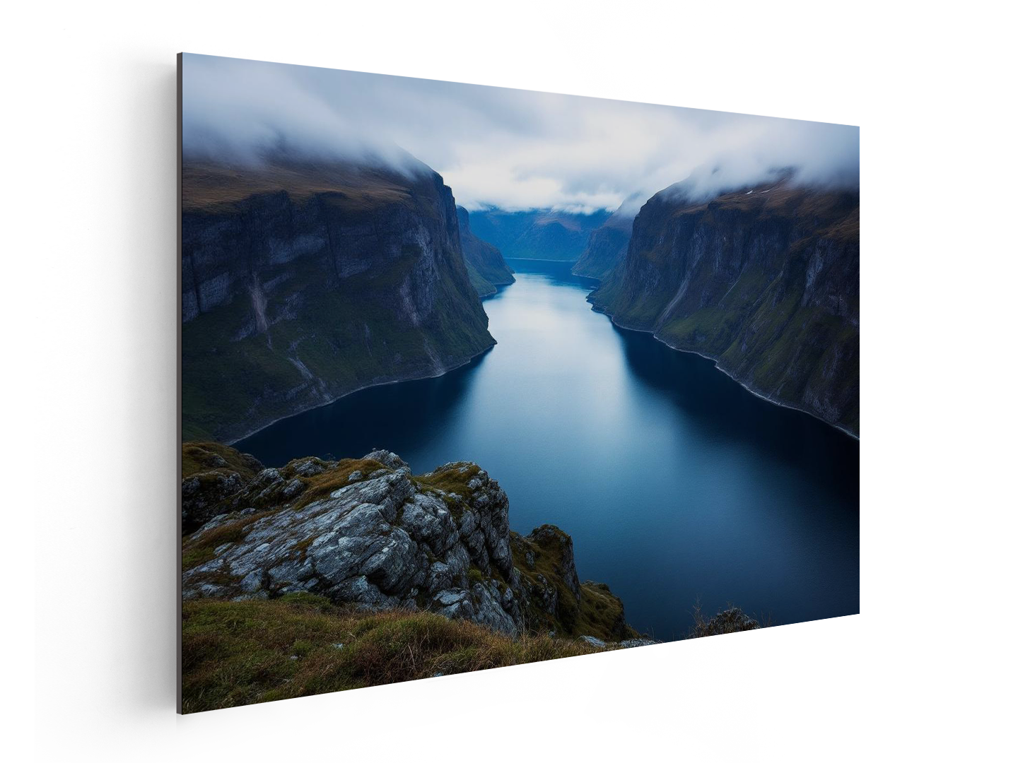 Adembenemend uitzicht op de Noorse fjorden met steile rotswanden en diepblauw water, lage bewolking die tussen de bergen hangt, koel kleurpalet, zacht diffuus licht, lange sluitertijd voor spiegelend water, serene en minimalistische compositie.