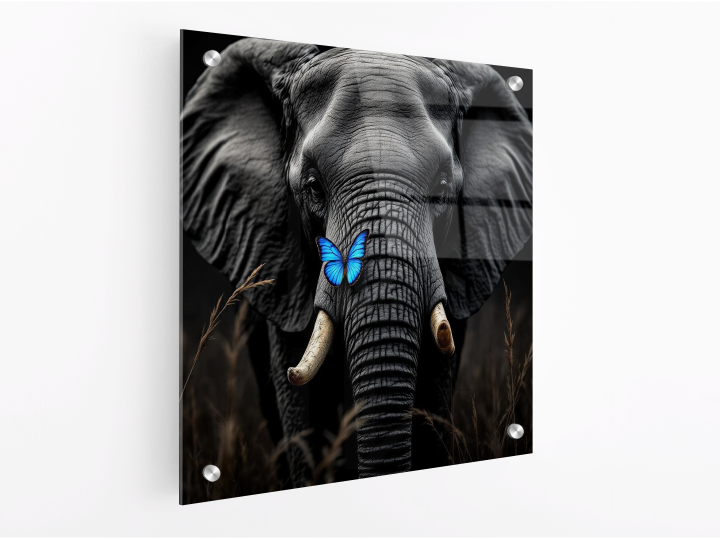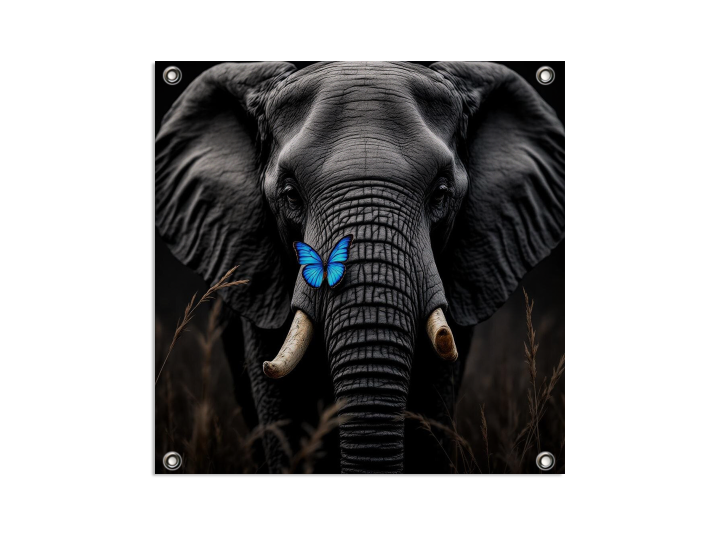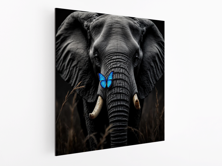 Een zwart/wit foto realistische close-up van een olifant met een blauwe vlinder op zijn slurf, met een donkere achtergrond met hoog gras.