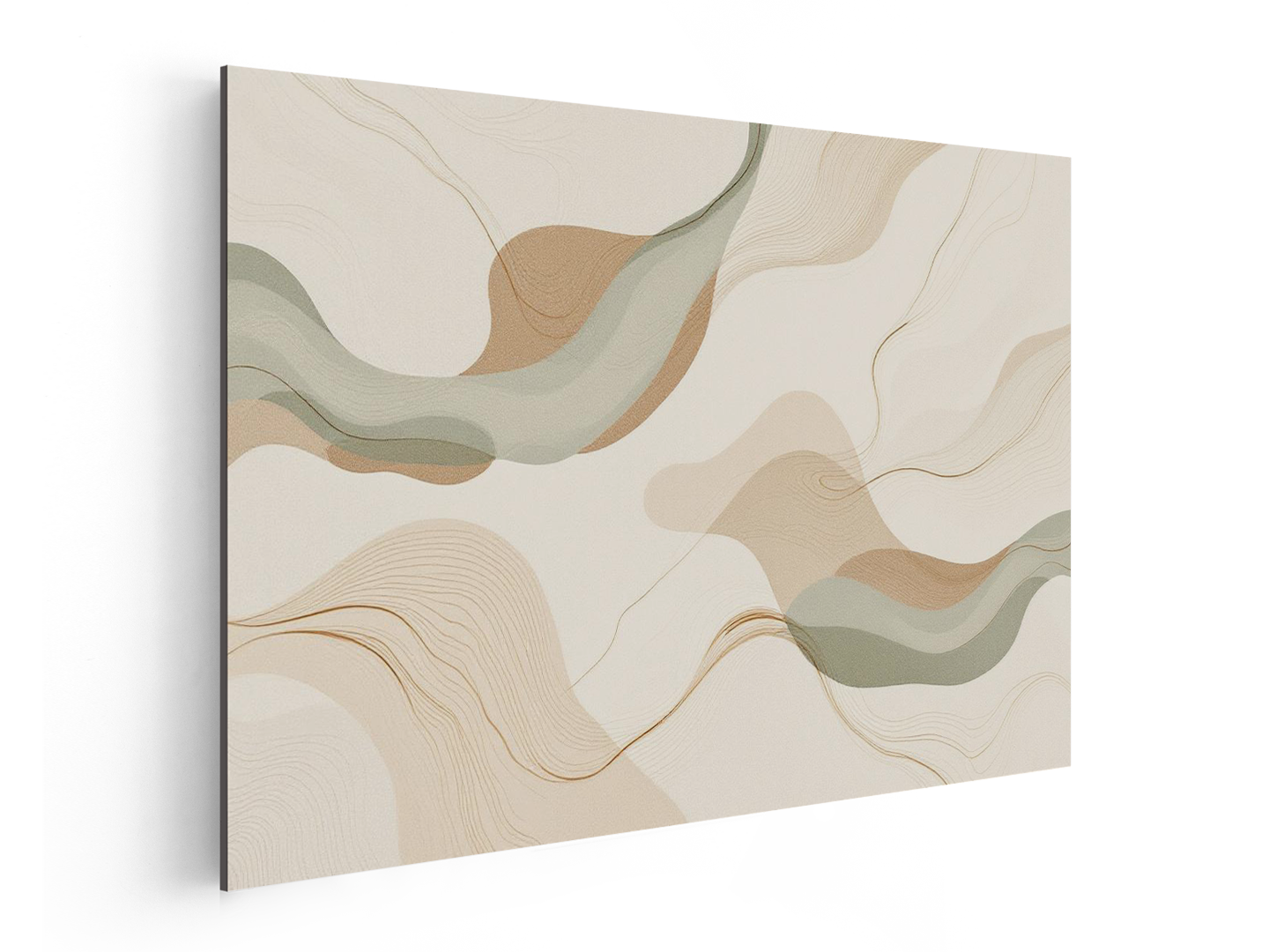 Organische abstracte vormen met subtiele nerven, geïnspireerd op berkenhout. Kleuren: zandkleur, warm wit, saliegroen.