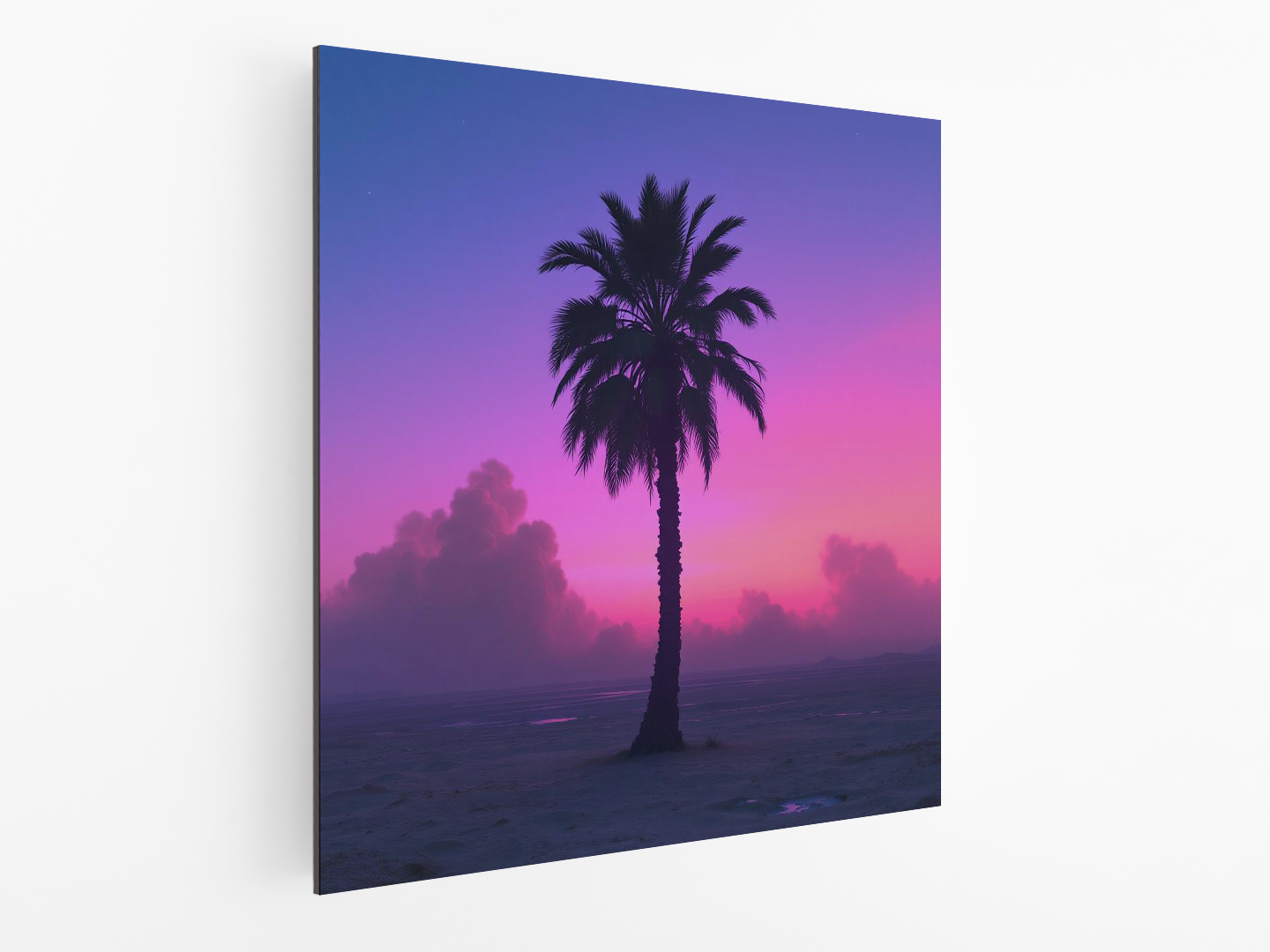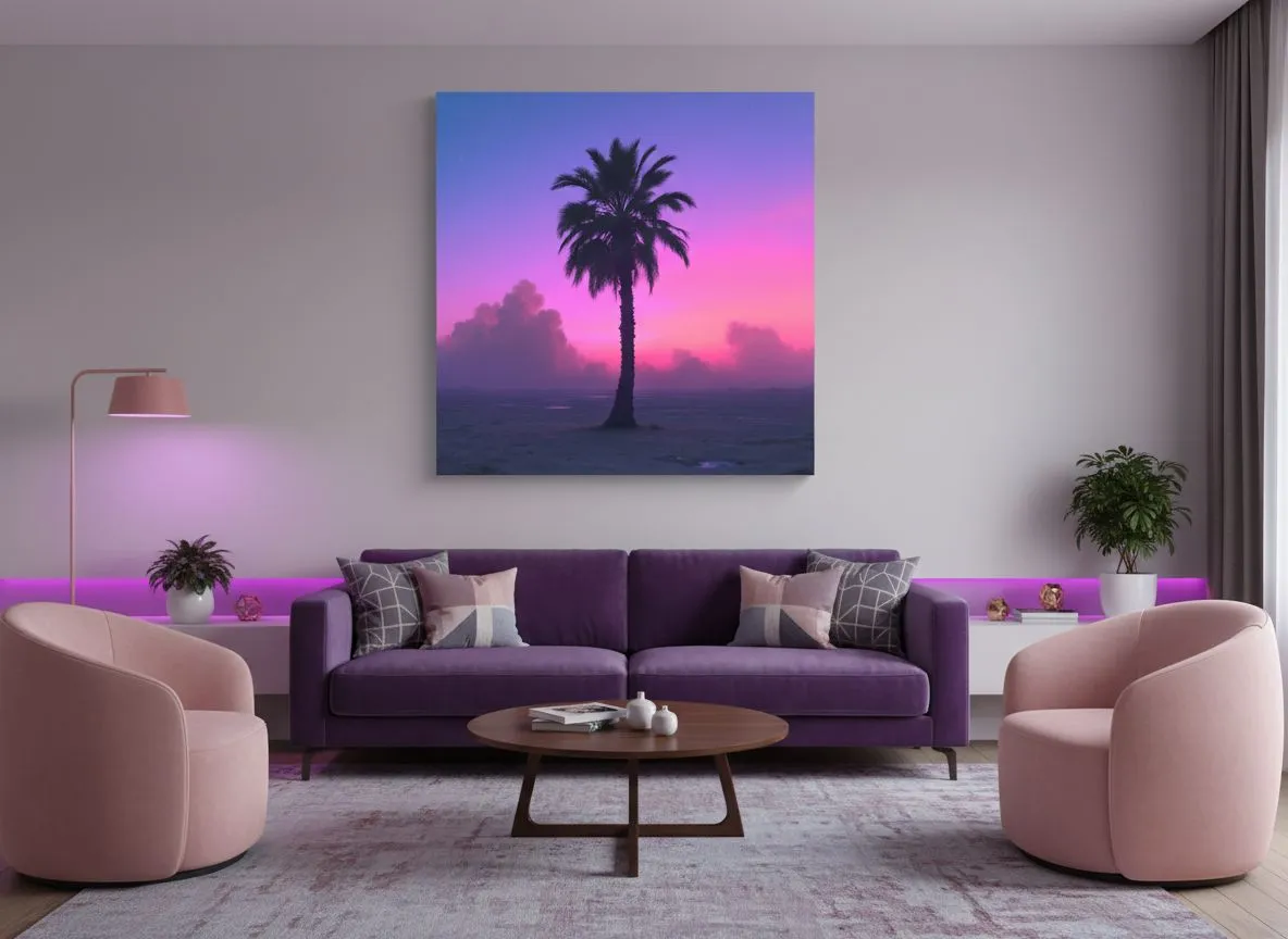 Een palmboom met een vaporwave achtergrond.