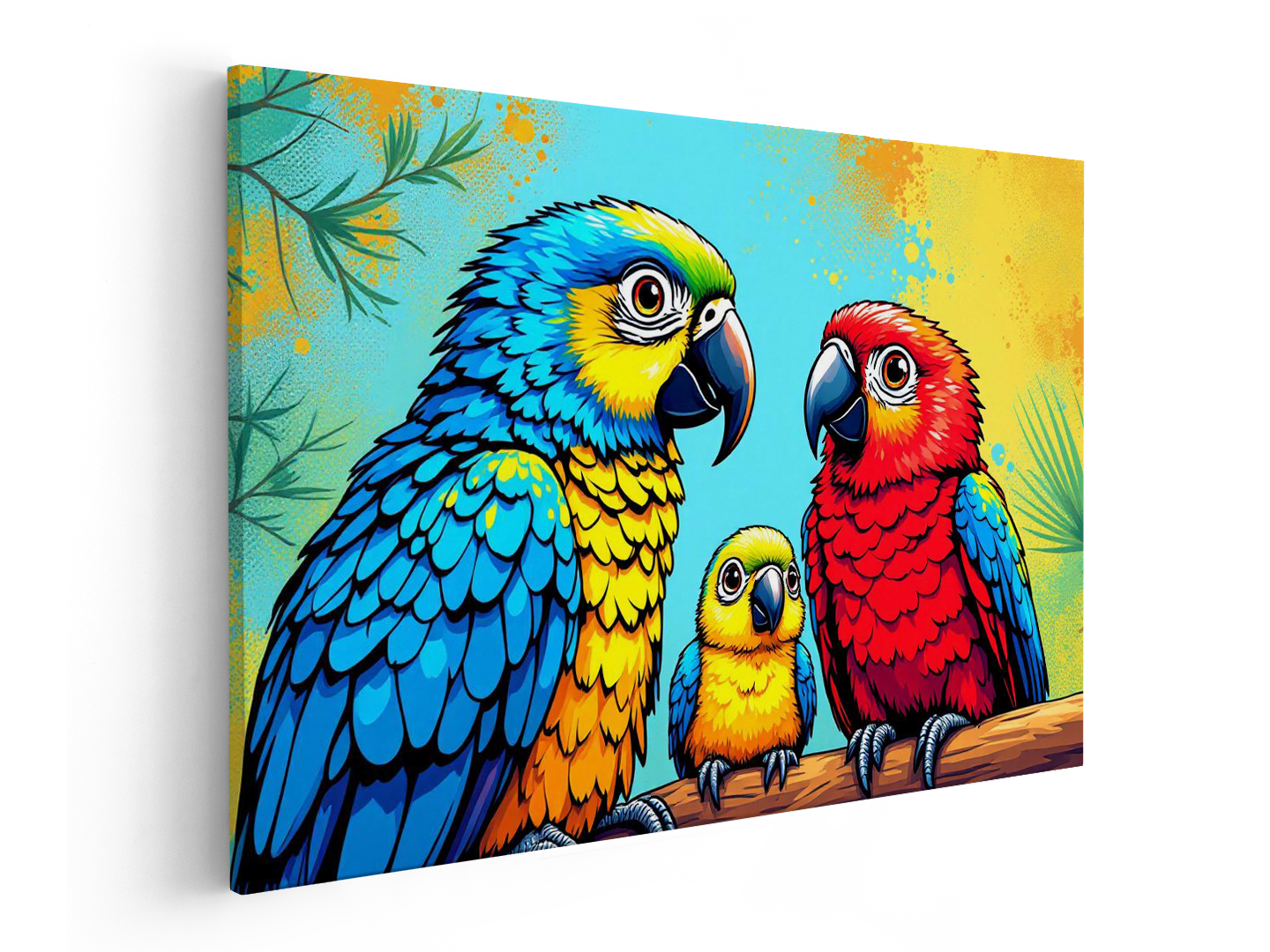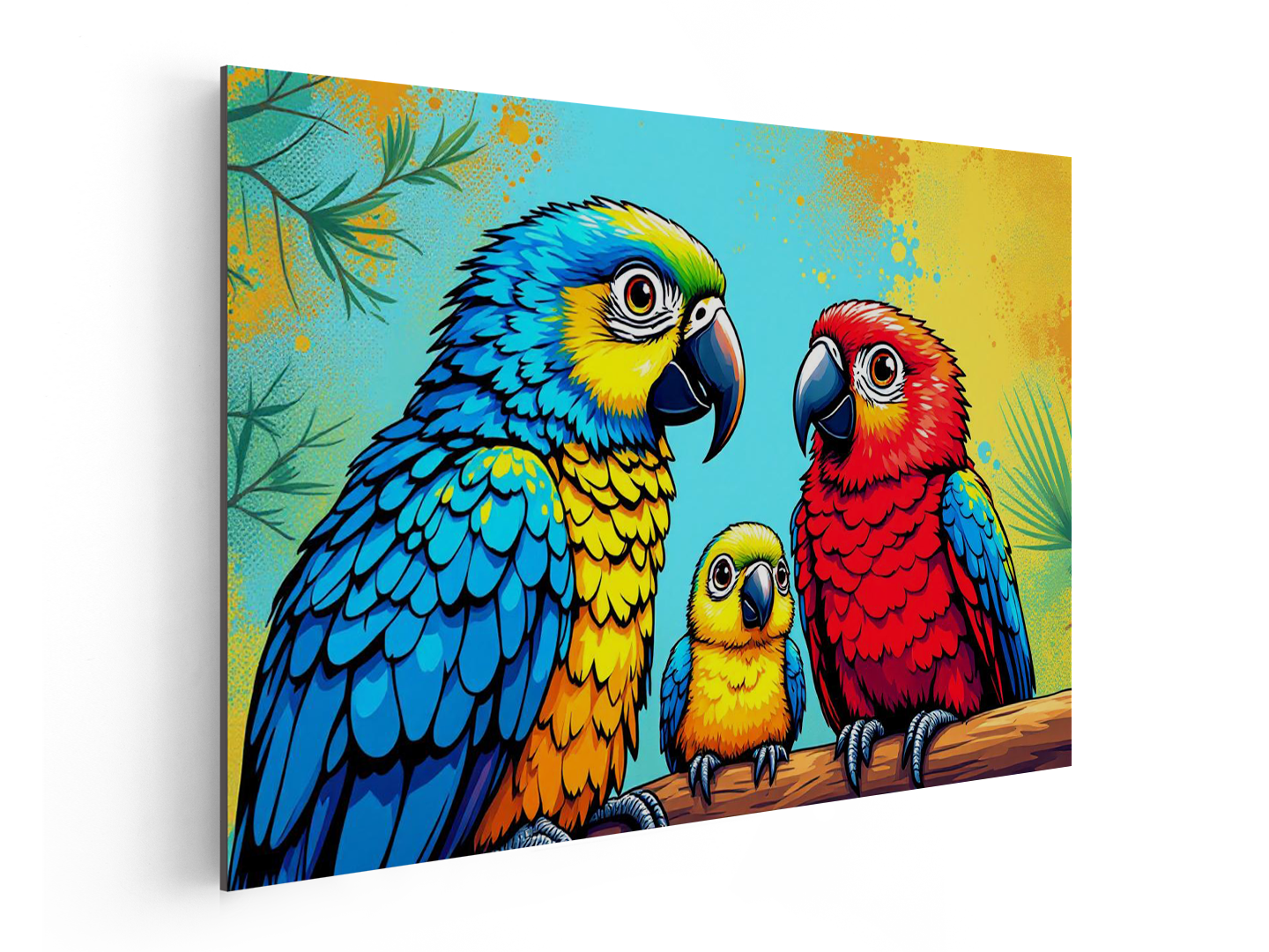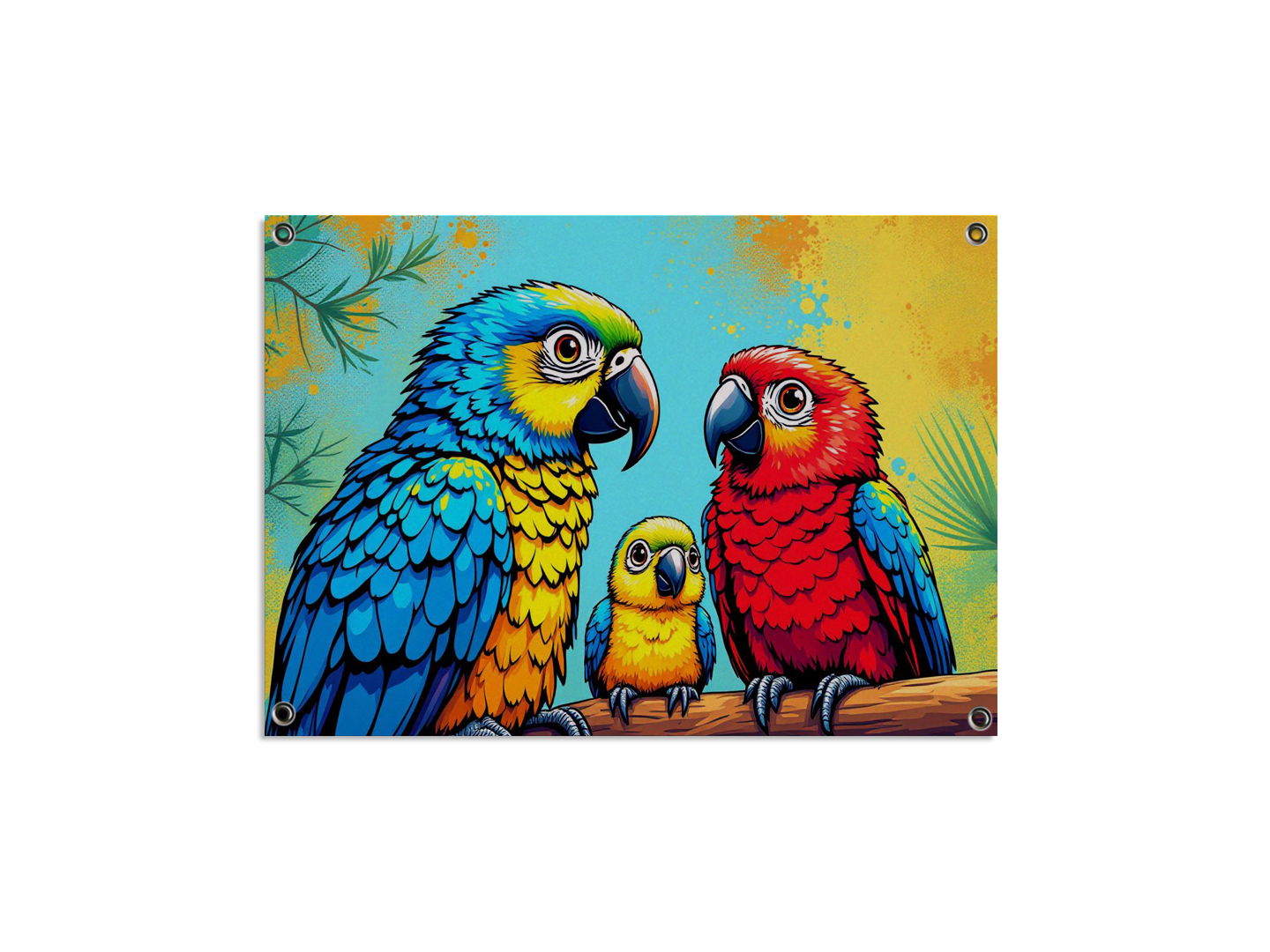 Een kleurrijk pop art portret van een papegaaien gezin, papa, mama en een baby papegaai, schattige kinderlijke illustratie stijl.