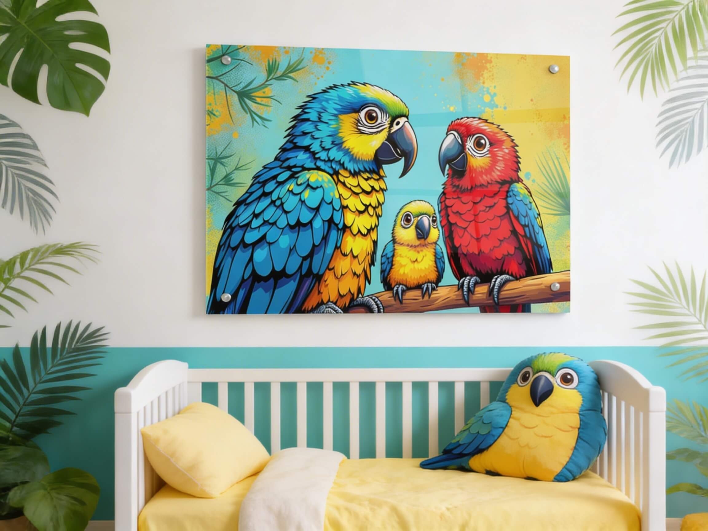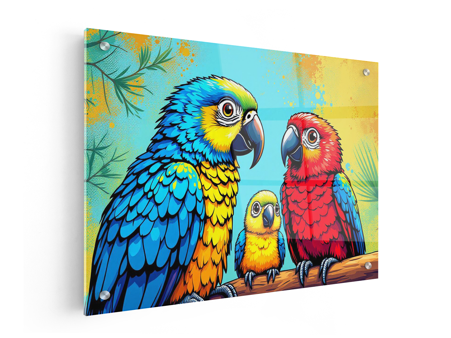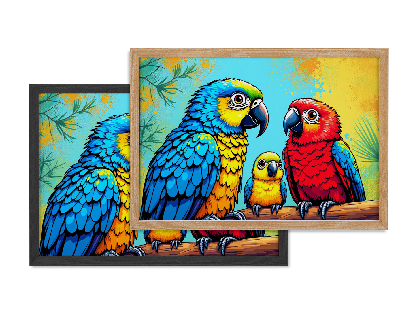 Een kleurrijk pop art portret van een papegaaien gezin, papa, mama en een baby papegaai, schattige kinderlijke illustratie stijl.