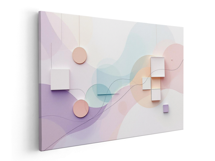Een schilderij van abstracte pixels en lijnen. compositie: Minimalistisch / veel leegte. kleur: Pastelkleuren. stijl: Minimalistisch. sfeer: Rustgevend.