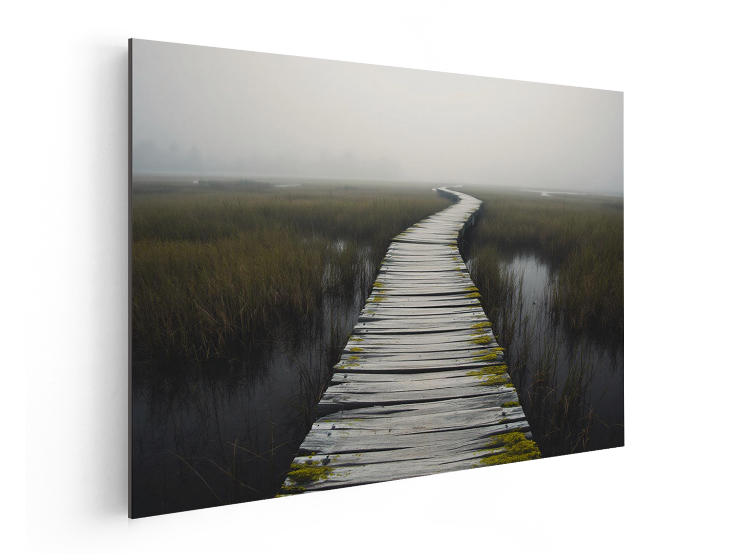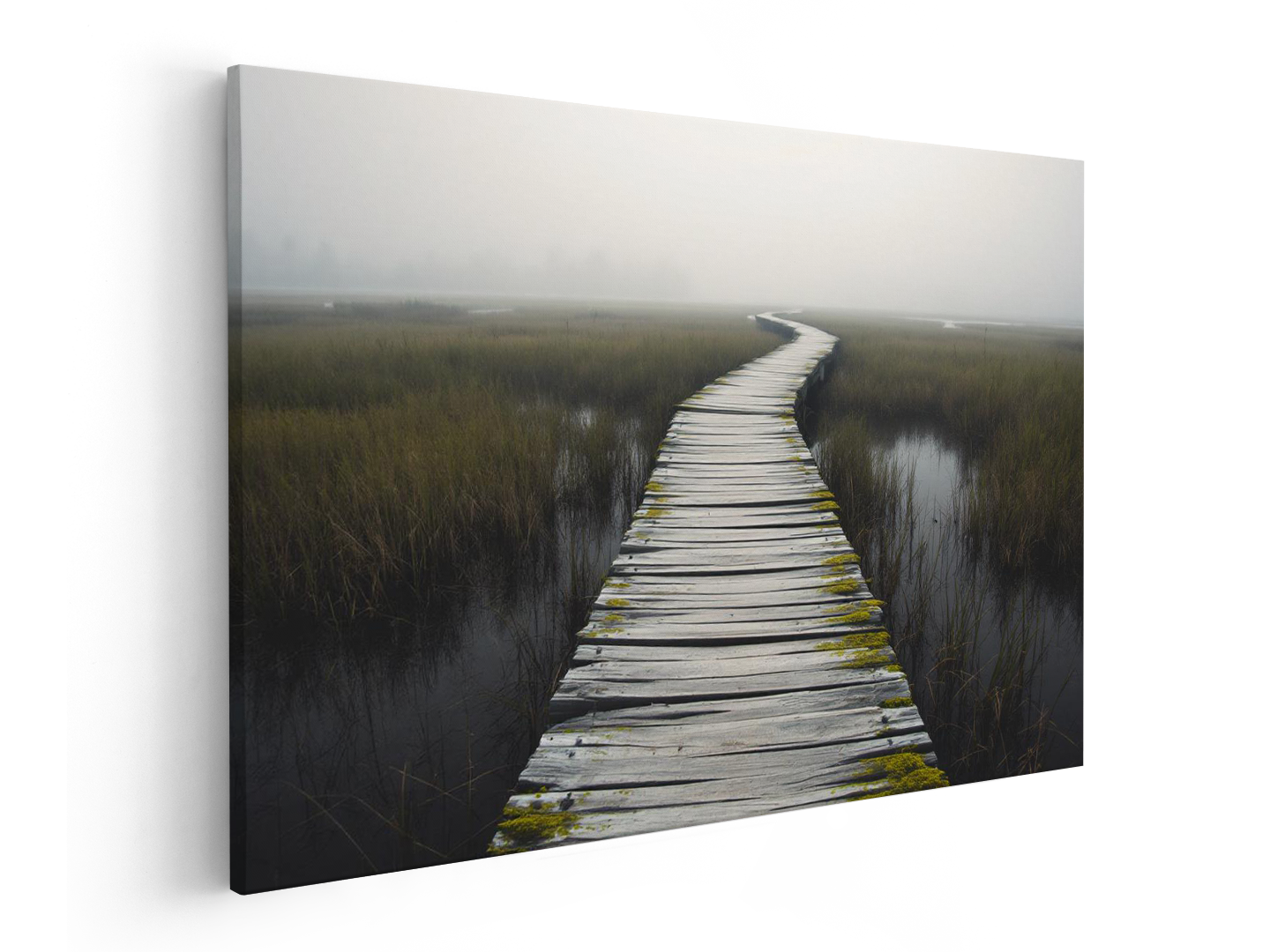 Een smalle houten brug die door een uitgestrekt natuurgebied loopt, omringd door nevel en open ruimte, zachte grijstinten en groen, rustige compositie, het pad verdwijnt in de verte, gevoel van ontdekking en stilte.