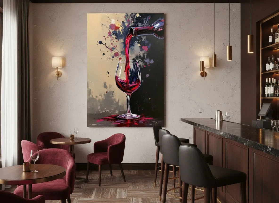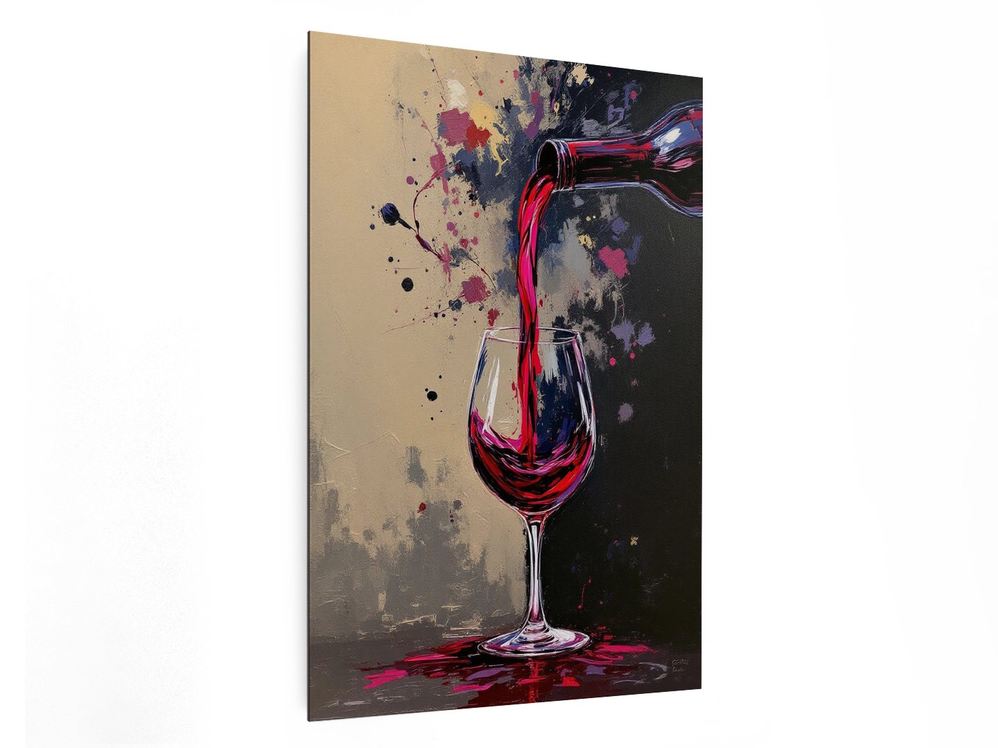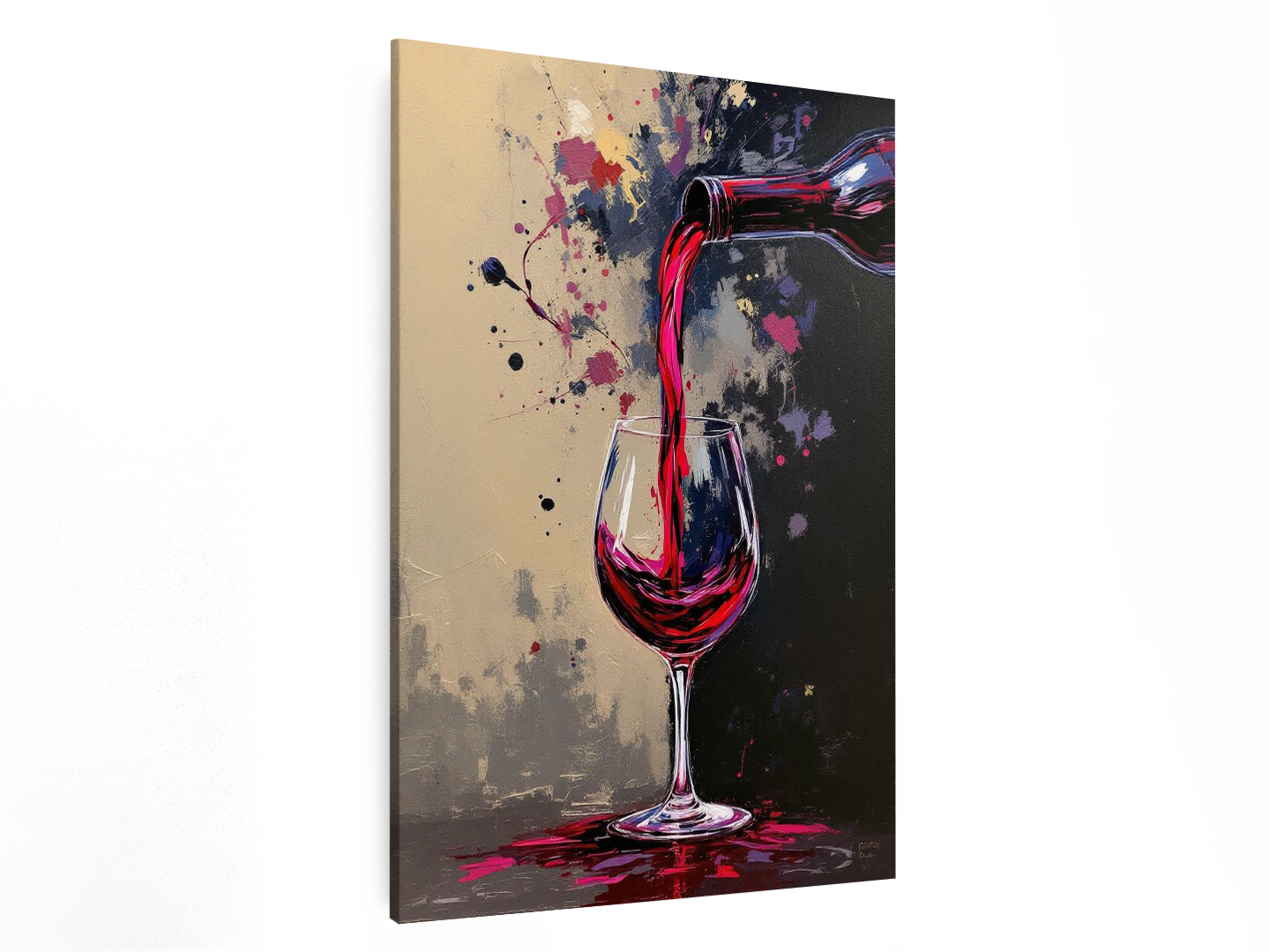 Een abstract schilderij van een fles rode wijn die wijn in een wijnglas schenkt, met prachtige rode en paarse kleuren tegen een beige en zwarte achtergrond, met rijke verf texturen en penseelstreken.