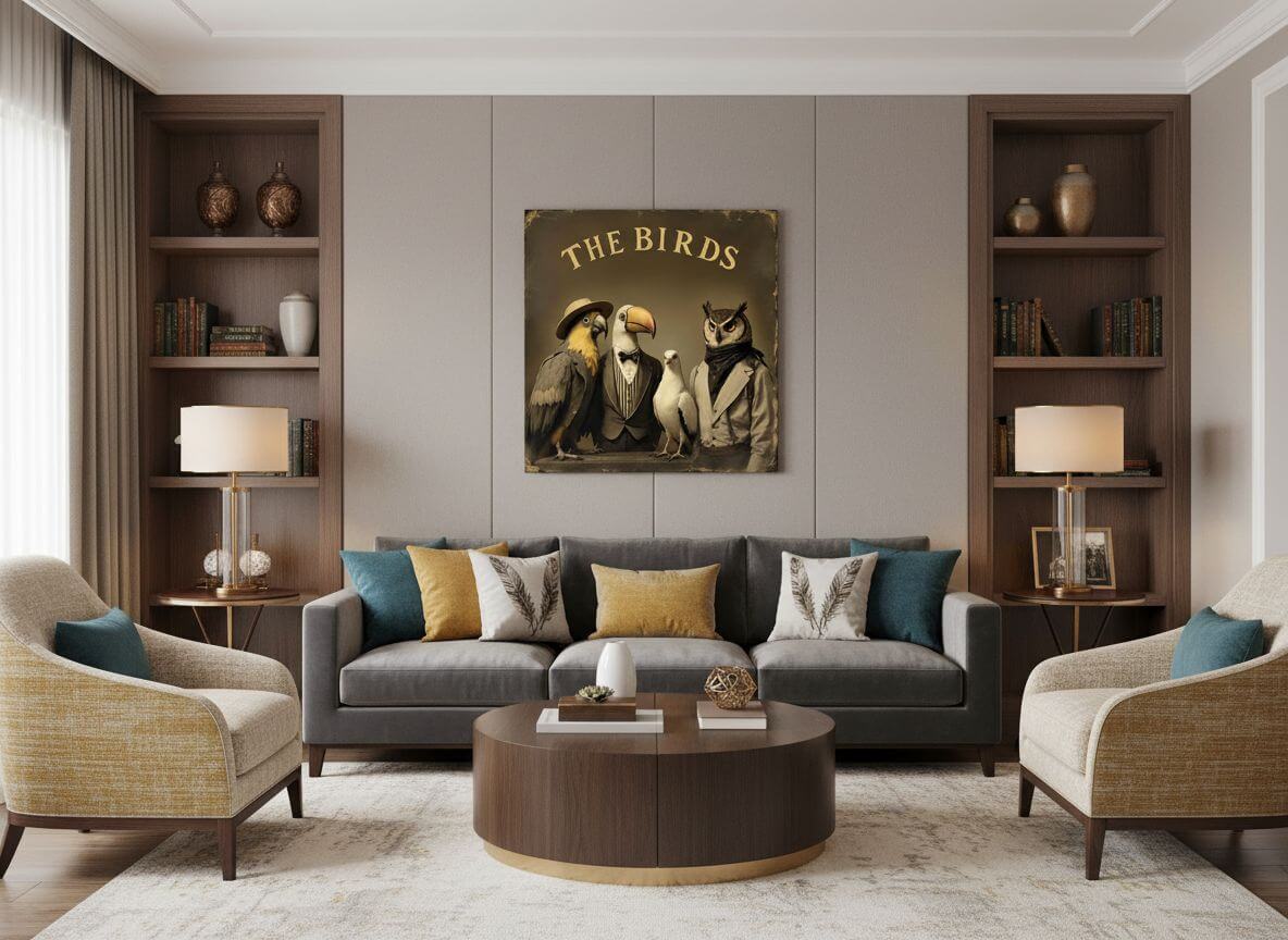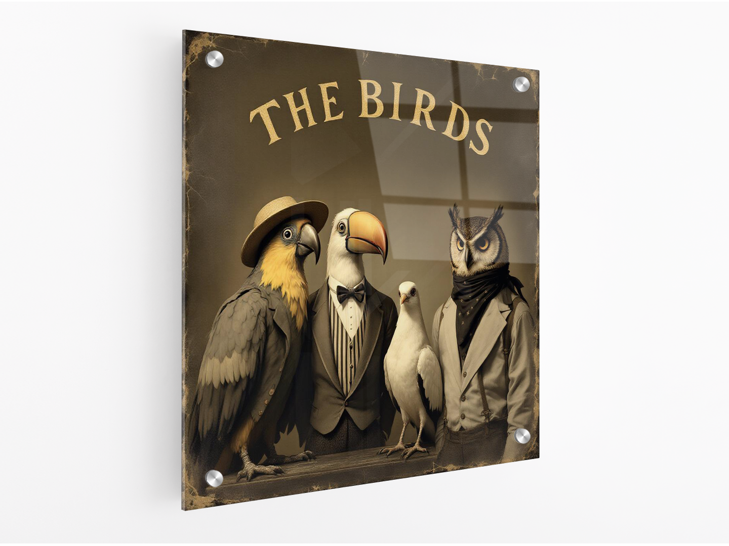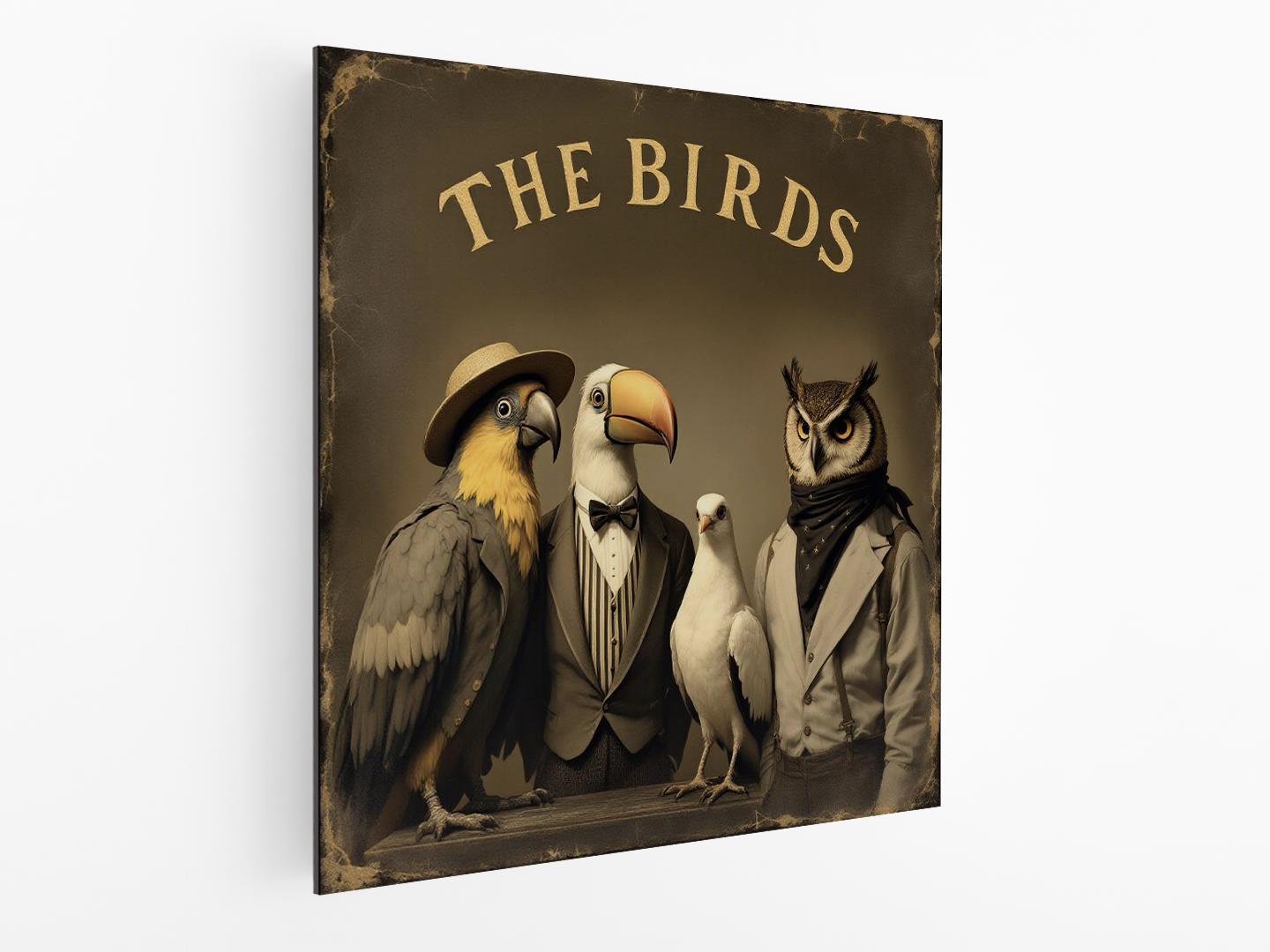 Een vintage albumcover van vier vogels die samen een barbershop quartet vormen, een uil, een toekan, een papegaai en een duif, met bijbehorende strohoeden en gestreepte pakken, het album heeft de titel “the birds”, met geweldige details en kwaliteit.