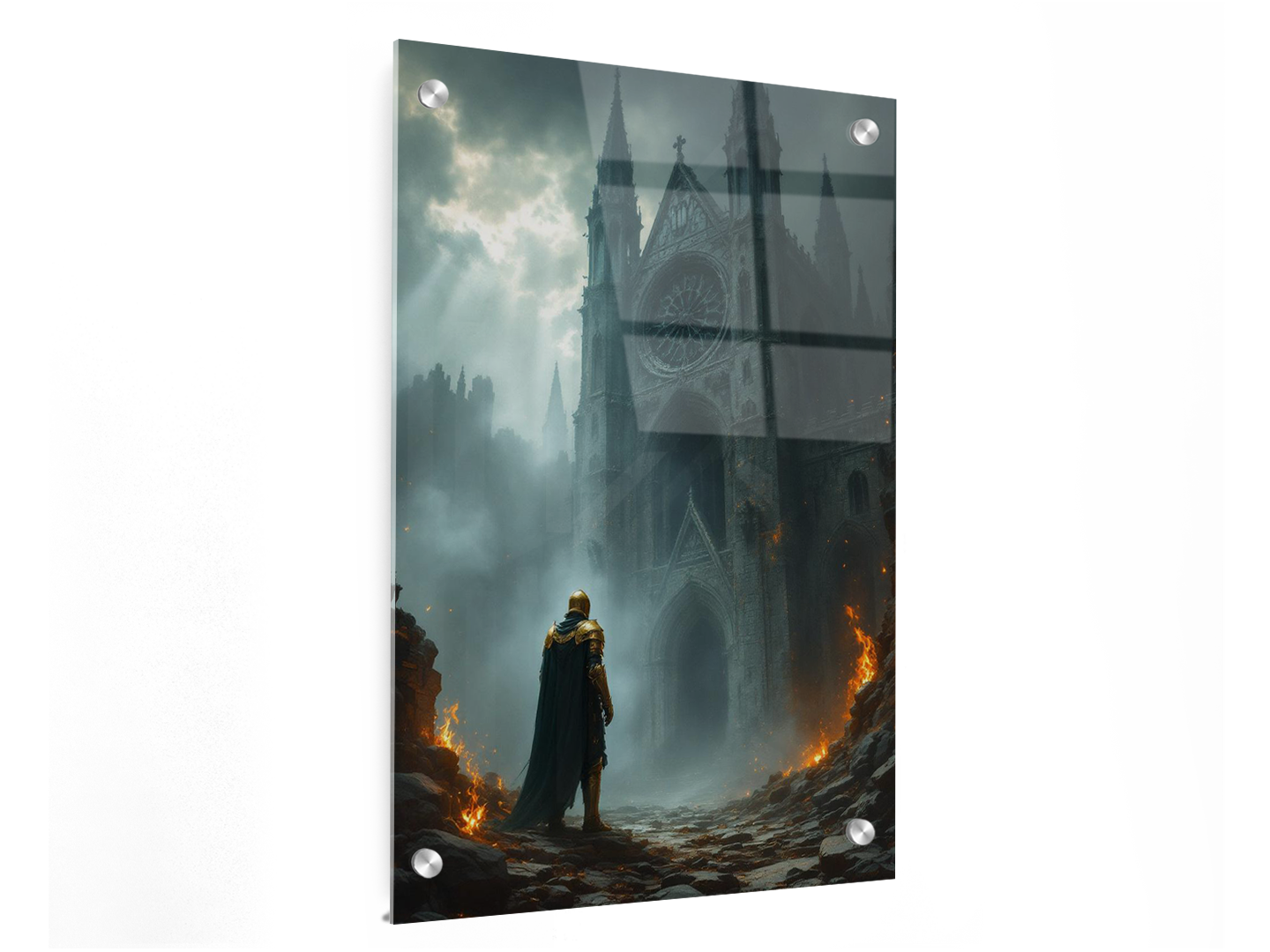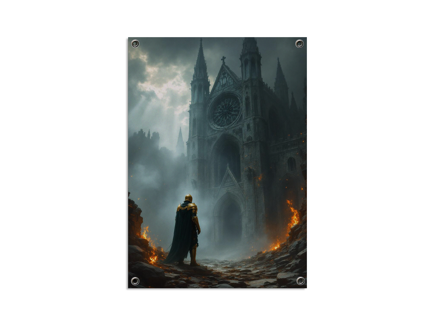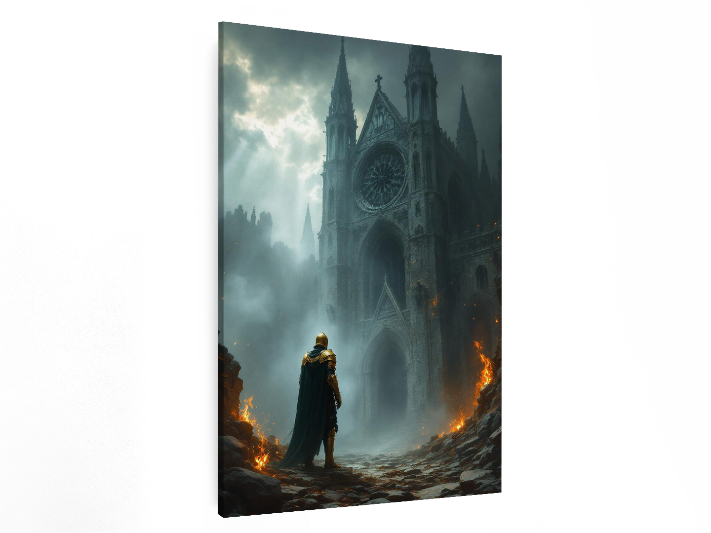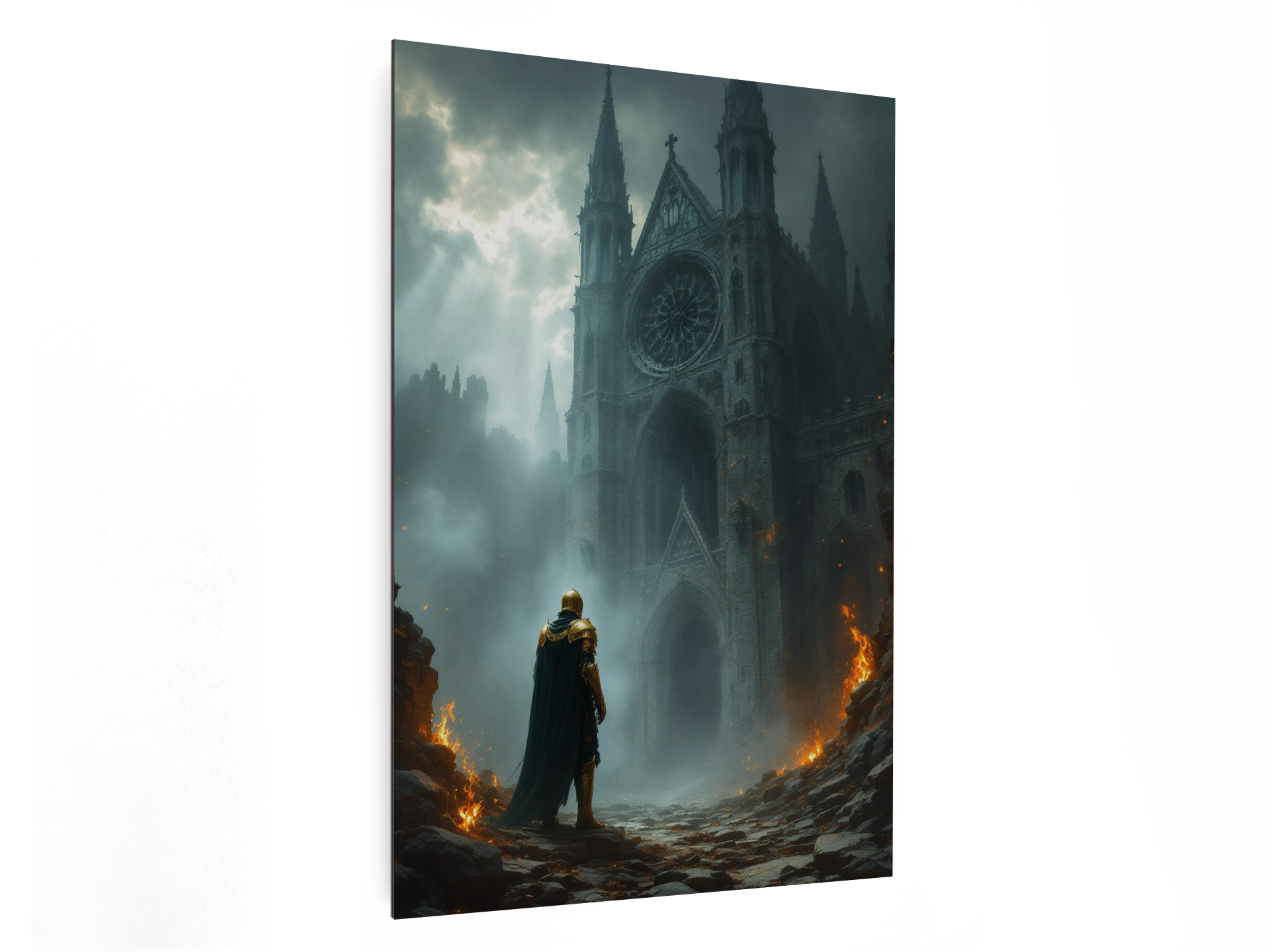 Een eenzame ridder in harnas staat voor een enorme, vervallen gotische kathedraal, dikke, rollende mist, dramatische volumetrische belichting, gloeiende sintels die in de lucht zweven, sterke randverlichting, schilderachtige donkere fantasietextuur, gecentreerde epische postercompositie, hoogwaardige metalen posteruitstraling.