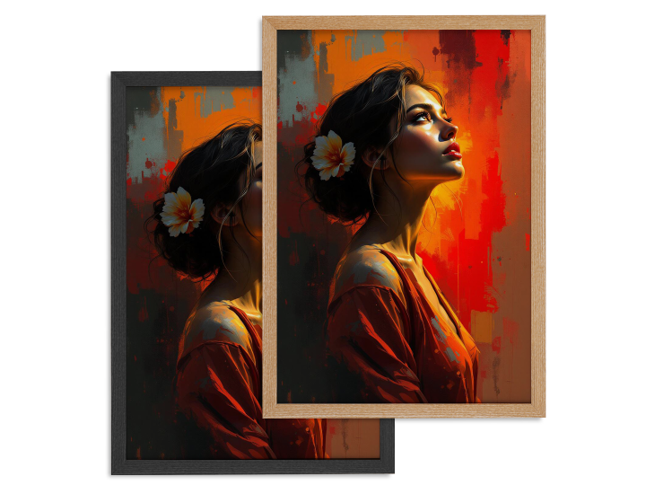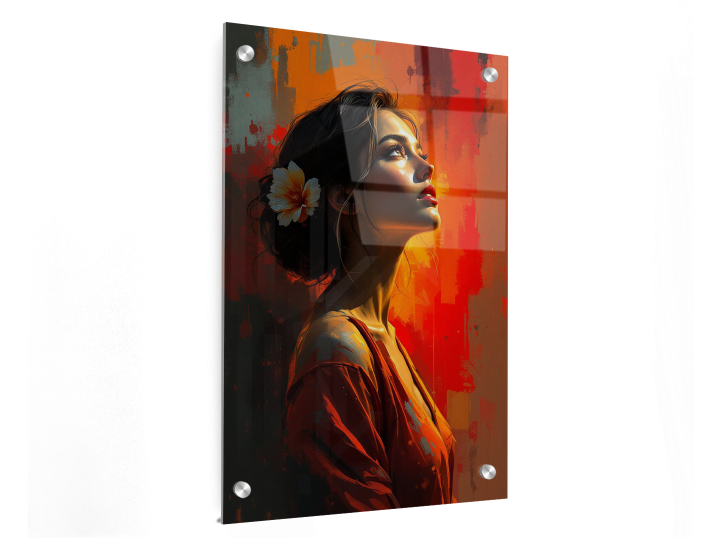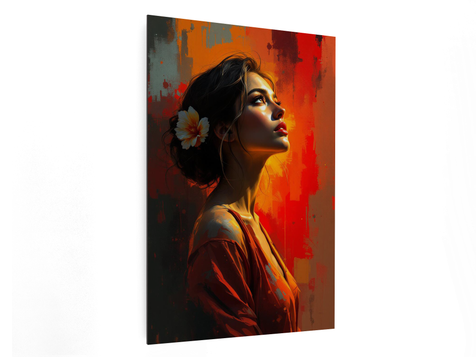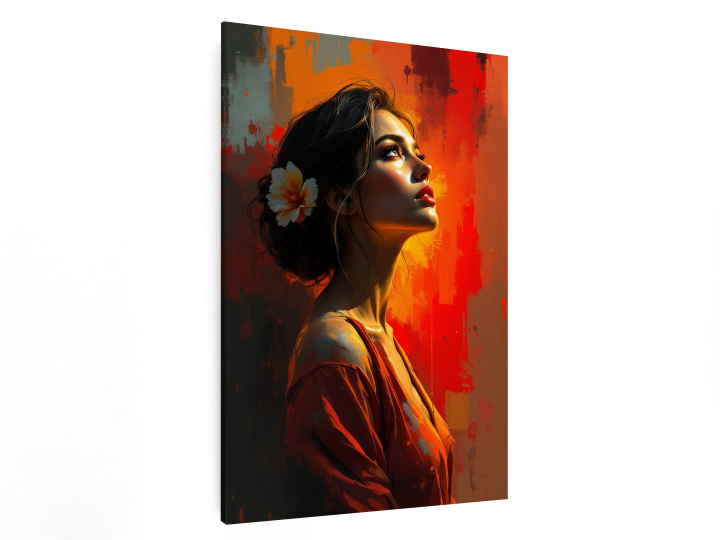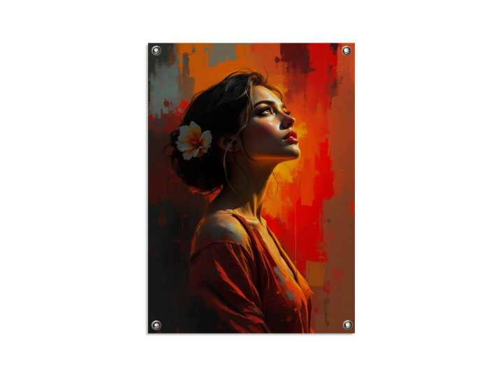 Een krachtig semi-abstract digitaal schilderij van een mooie vrouw in zij aanzicht, de vrouw heeft een prachtige bloem opgestoken in haar haren, ze kijkt omhoog met waardigheid en kracht. De stijl combineert expressieve penseelstreken, gedurfde texturen en een levendig contrast tussen vurige geel / oranje highlights op de huid en diepe vurige rode schaduwen op de achtergrond. De kleding is losjes geschilderd met abstracte penseelstreken, wat een moderne artistieke sfeer creëert, terwijl de figuur zelfvertrouwen en aanwezigheid uitstraalt. De achtergrond is abstract met gelaagde verf effecten, spatten en texturen, en doet denken aan een canvas van galeriekwaliteit. Filmische belichting, een sterke uitstraling van kracht en sereniteit, eigentijdse kunststijl. Minimalistisch grafisch ontwerp.