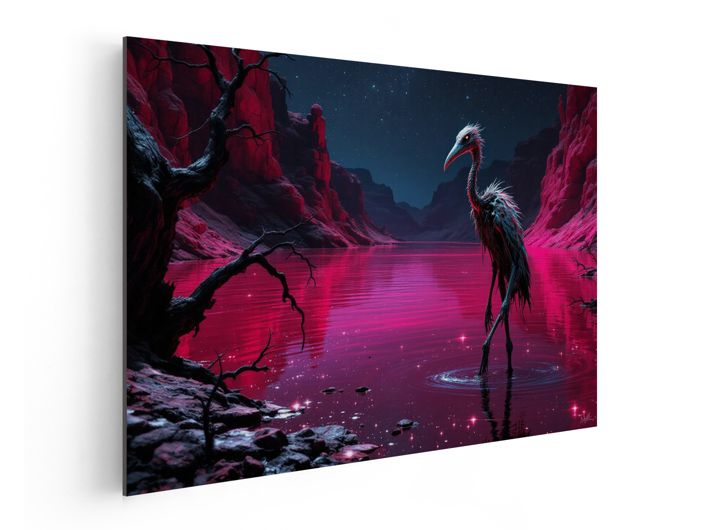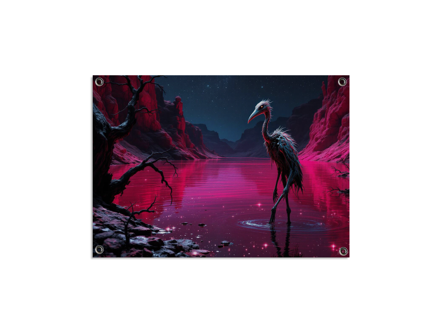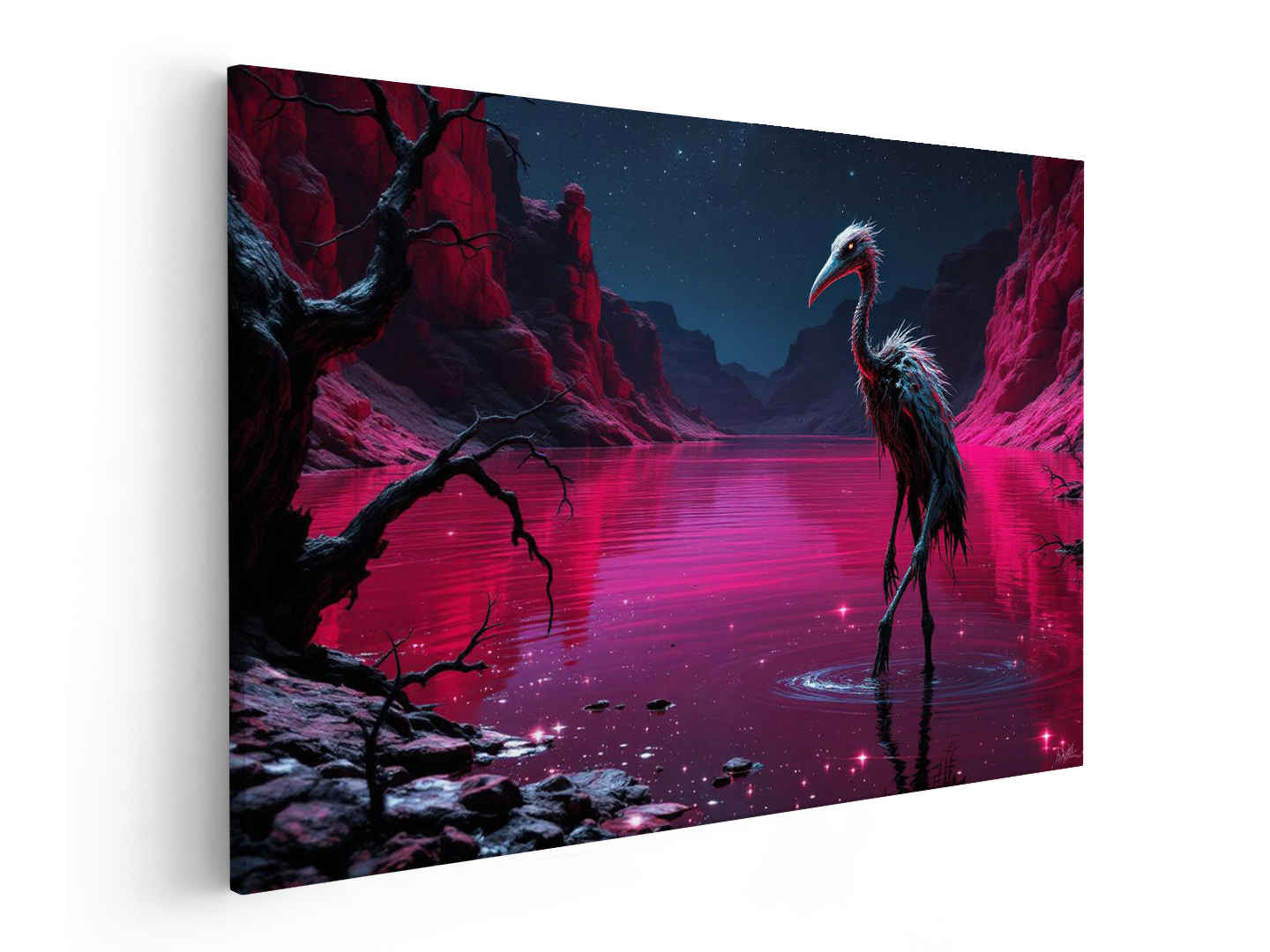 Een surrealistisch fantasielandschap, een cinematisch uitzicht, met een diepe kloof, en op de bodem een ​​landschap met een rood meer en dode bomen. Een lange, slanke, kraaiachtige vogel met lange poten en een lange snavel loopt in het meer; de huid van de vogel lijkt half verrot. De hemel is donker en helder en gevuld met sterren.