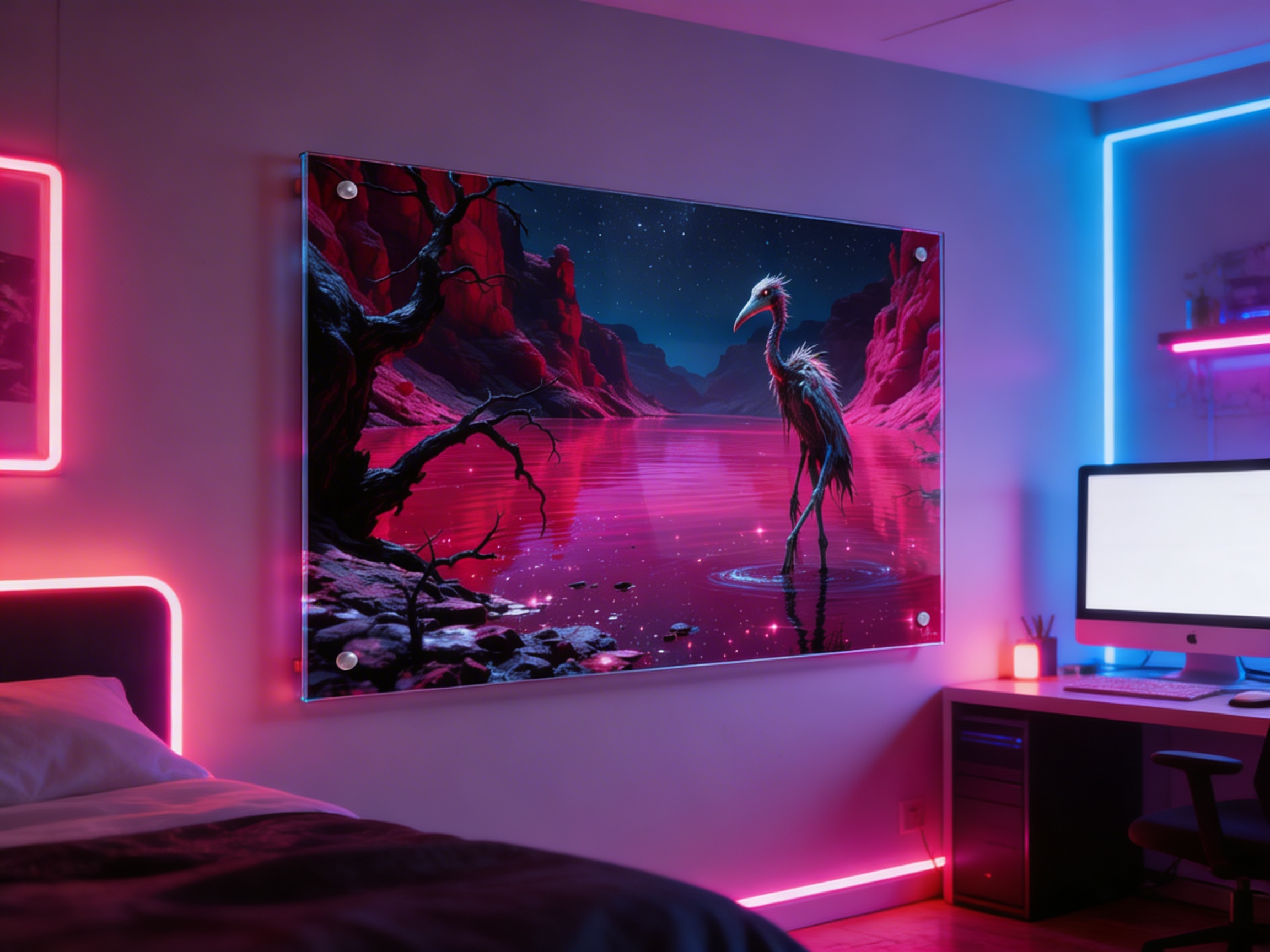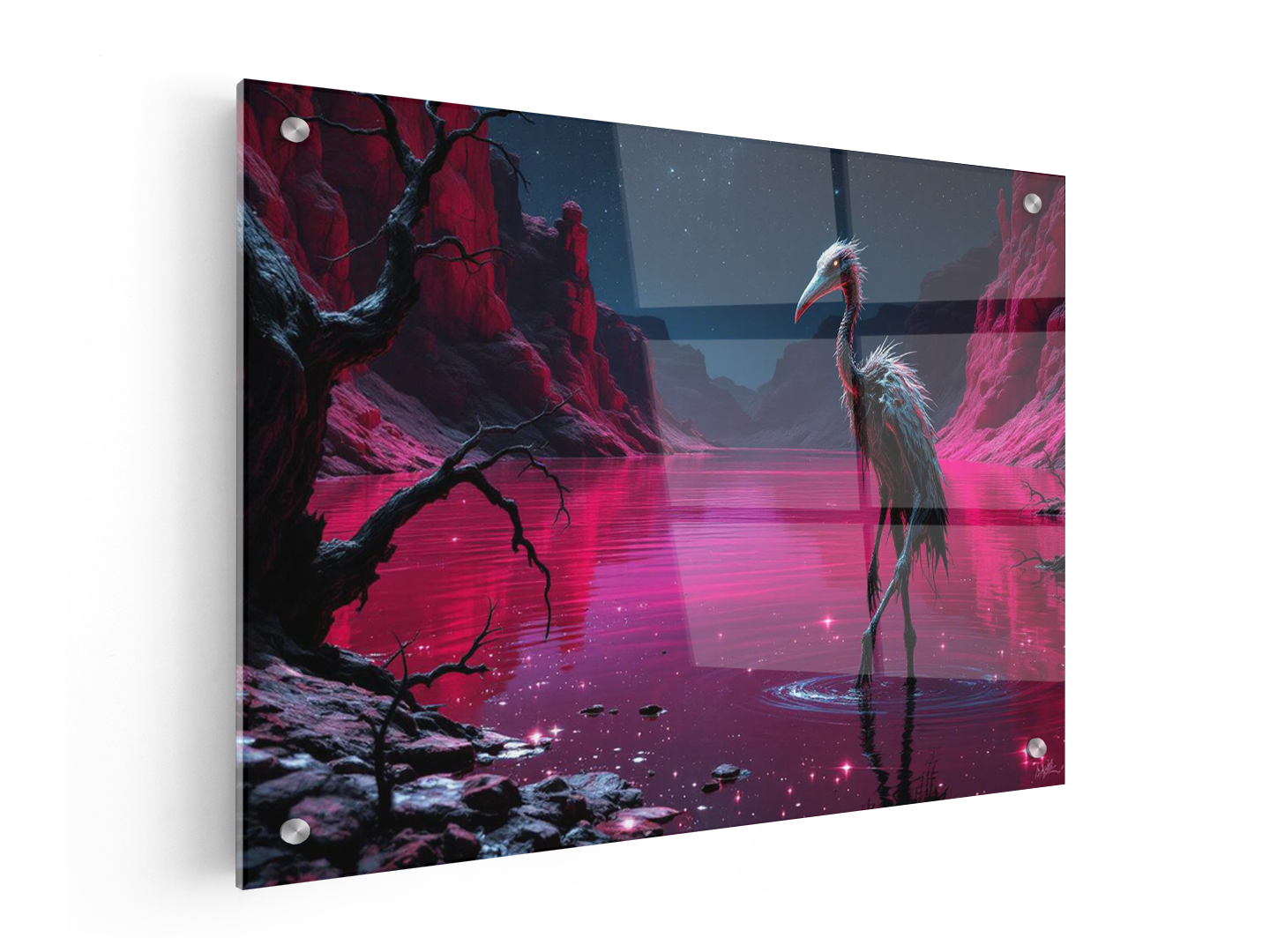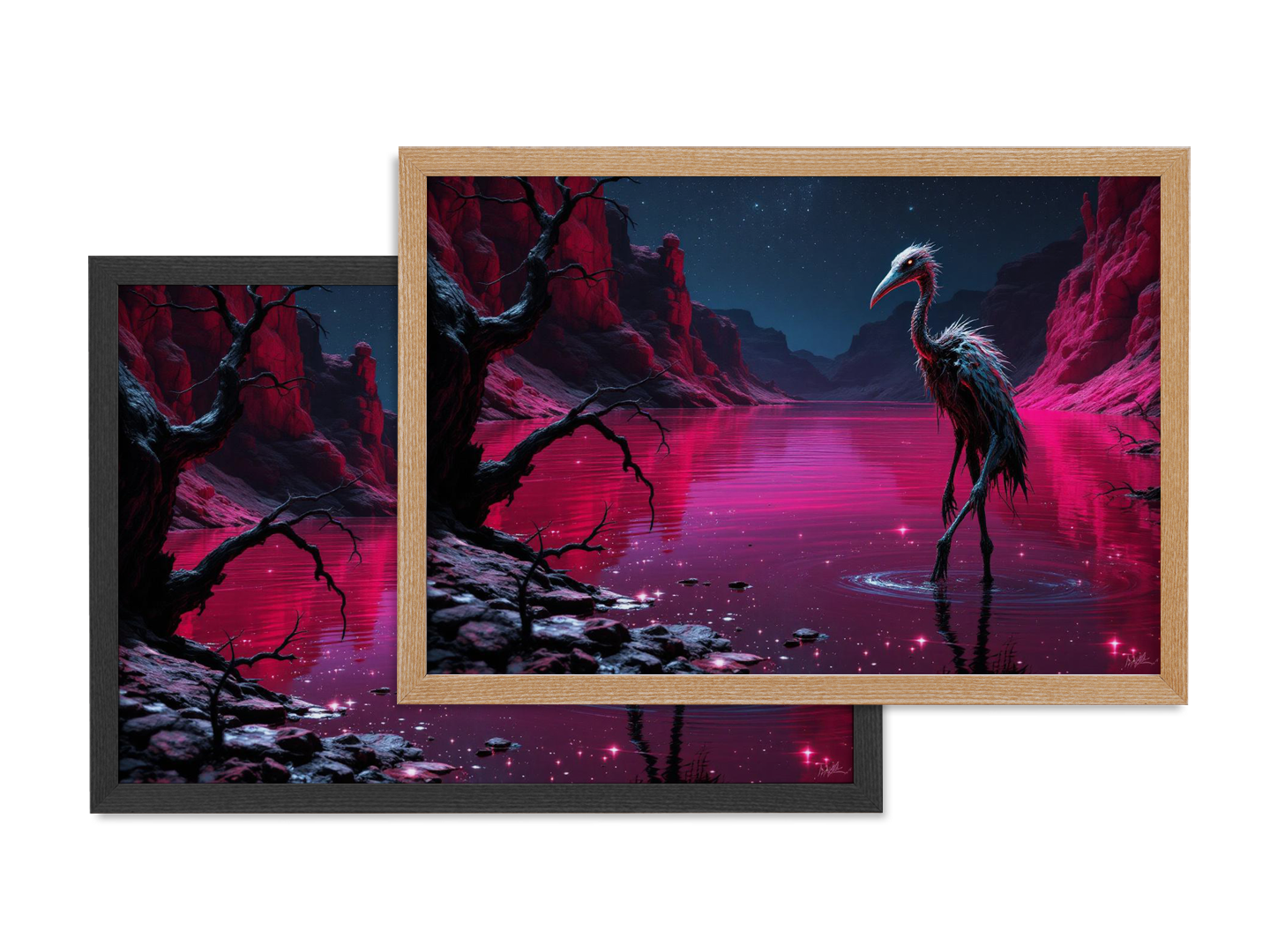 Een surrealistisch fantasielandschap, een cinematisch uitzicht, met een diepe kloof, en op de bodem een ​​landschap met een rood meer en dode bomen. Een lange, slanke, kraaiachtige vogel met lange poten en een lange snavel loopt in het meer; de huid van de vogel lijkt half verrot. De hemel is donker en helder en gevuld met sterren.