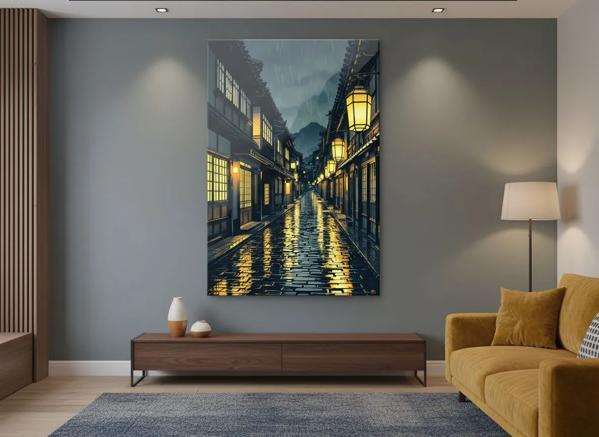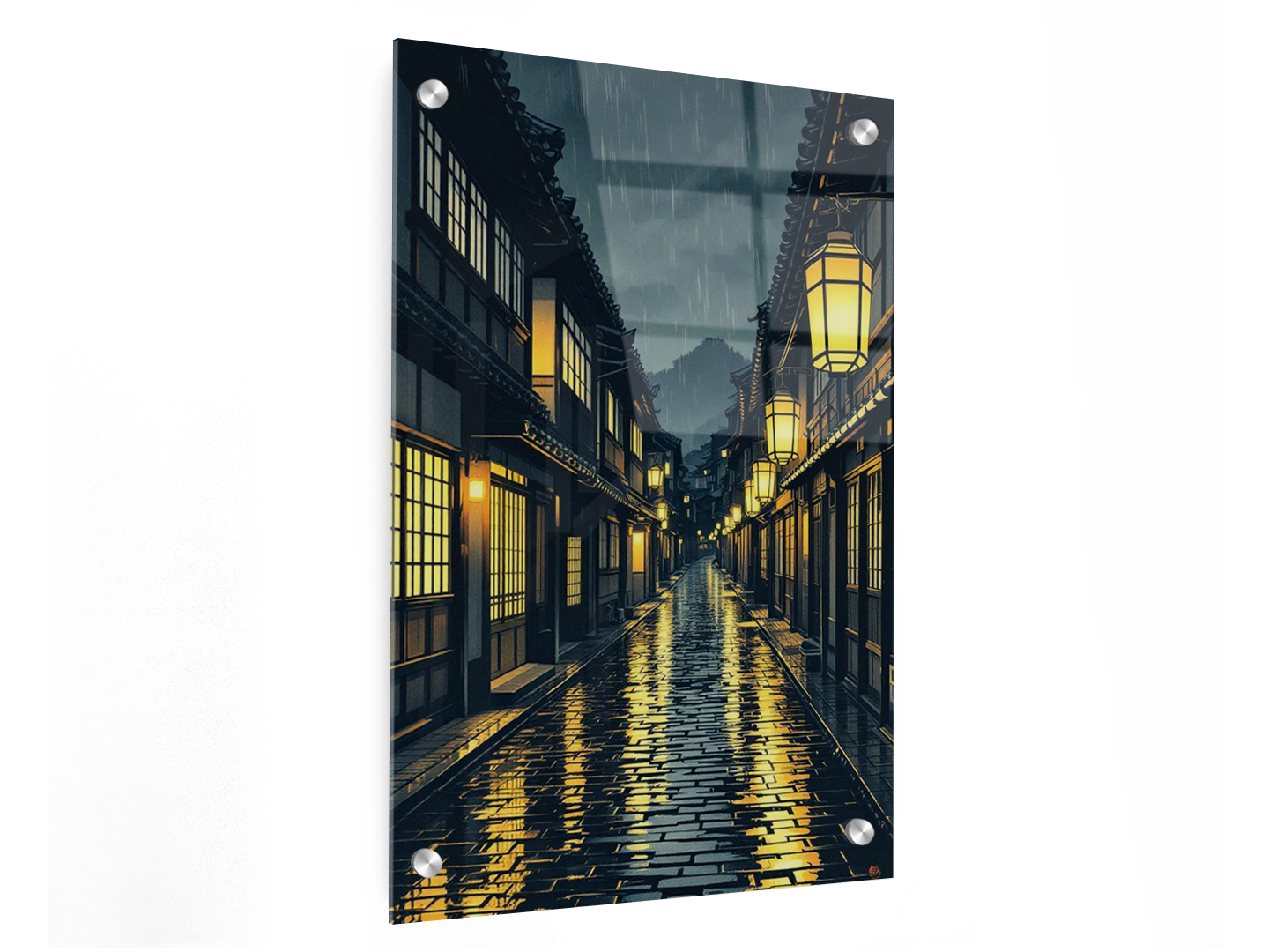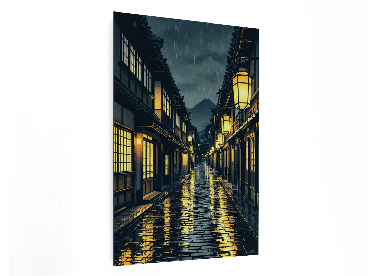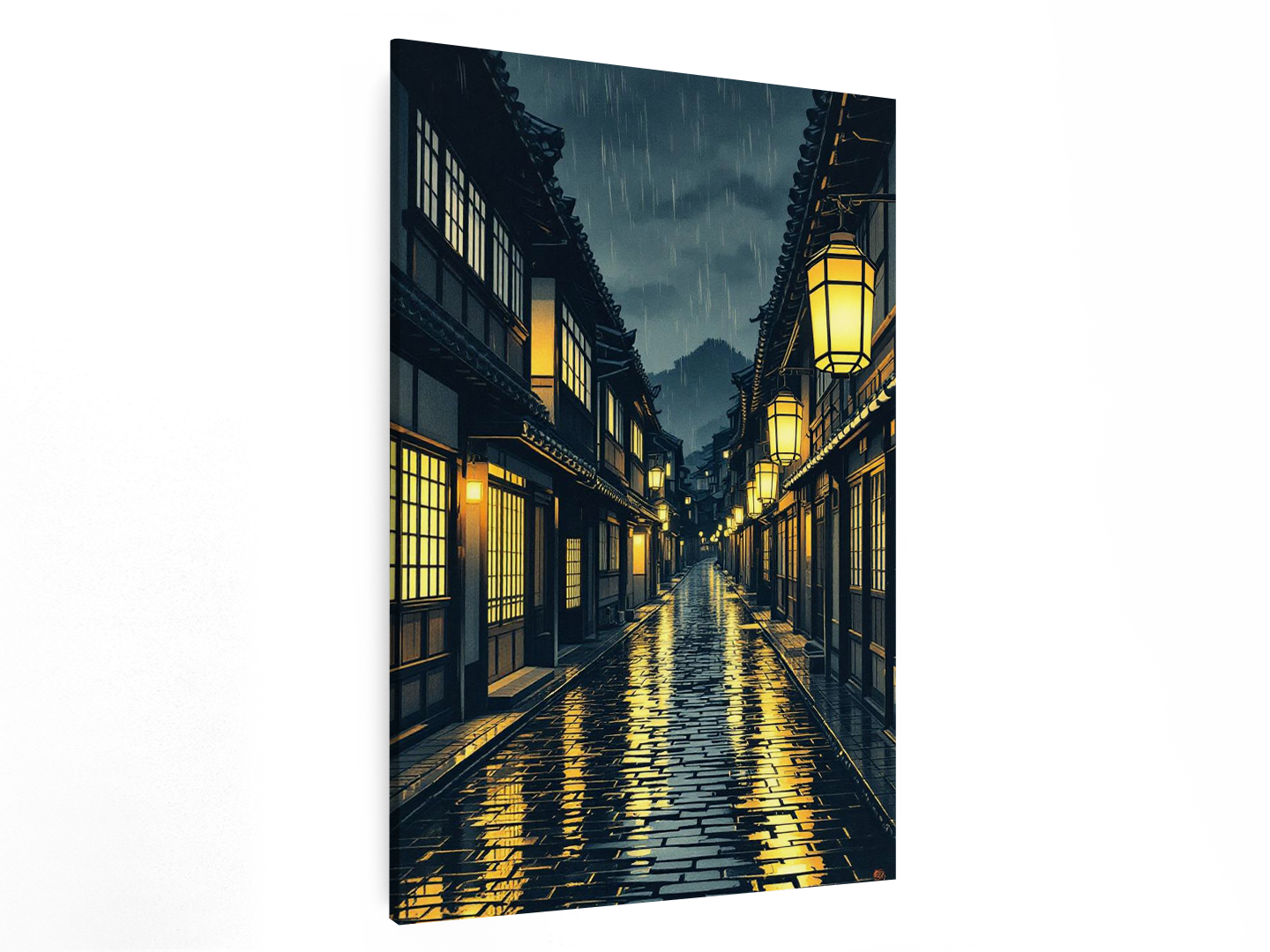 Traditionele ukiyo-e stijl prent van een rustige Japanse straat in Edo-periode, verlicht door warme papieren lantaarns, reflecties op natte straatstenen, silhouetten van houten huizen, zachte penseel lijnen, vlakke kleuren, harmonieuze compositie, geen tekst, geen handtekening, hoge artistieke kwaliteit, geschikt voor canvas print.