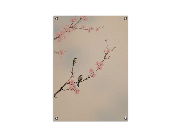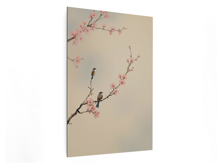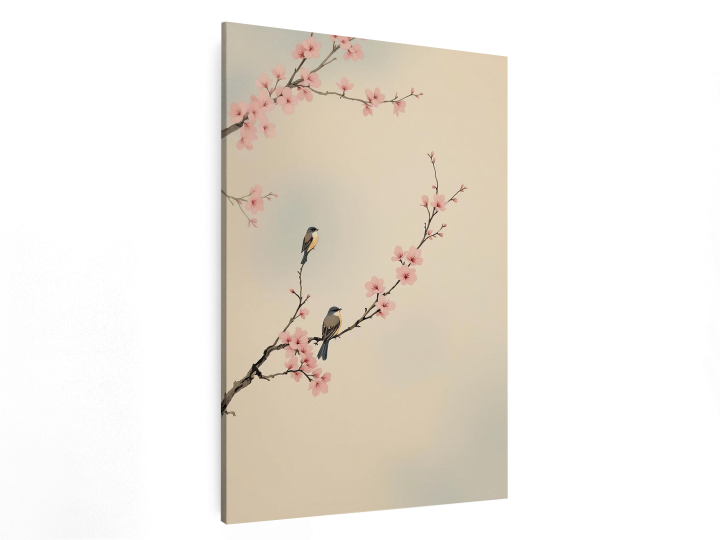 Nihonga schilderstijl van een kersenbloesem tak met twee kleine zangvogels, delicate details, natuurlijke pigmenten, zachte achtergrond, verfijnde Japanse schilderkunst, elegante compositie, geen kalligrafie of handtekening.
