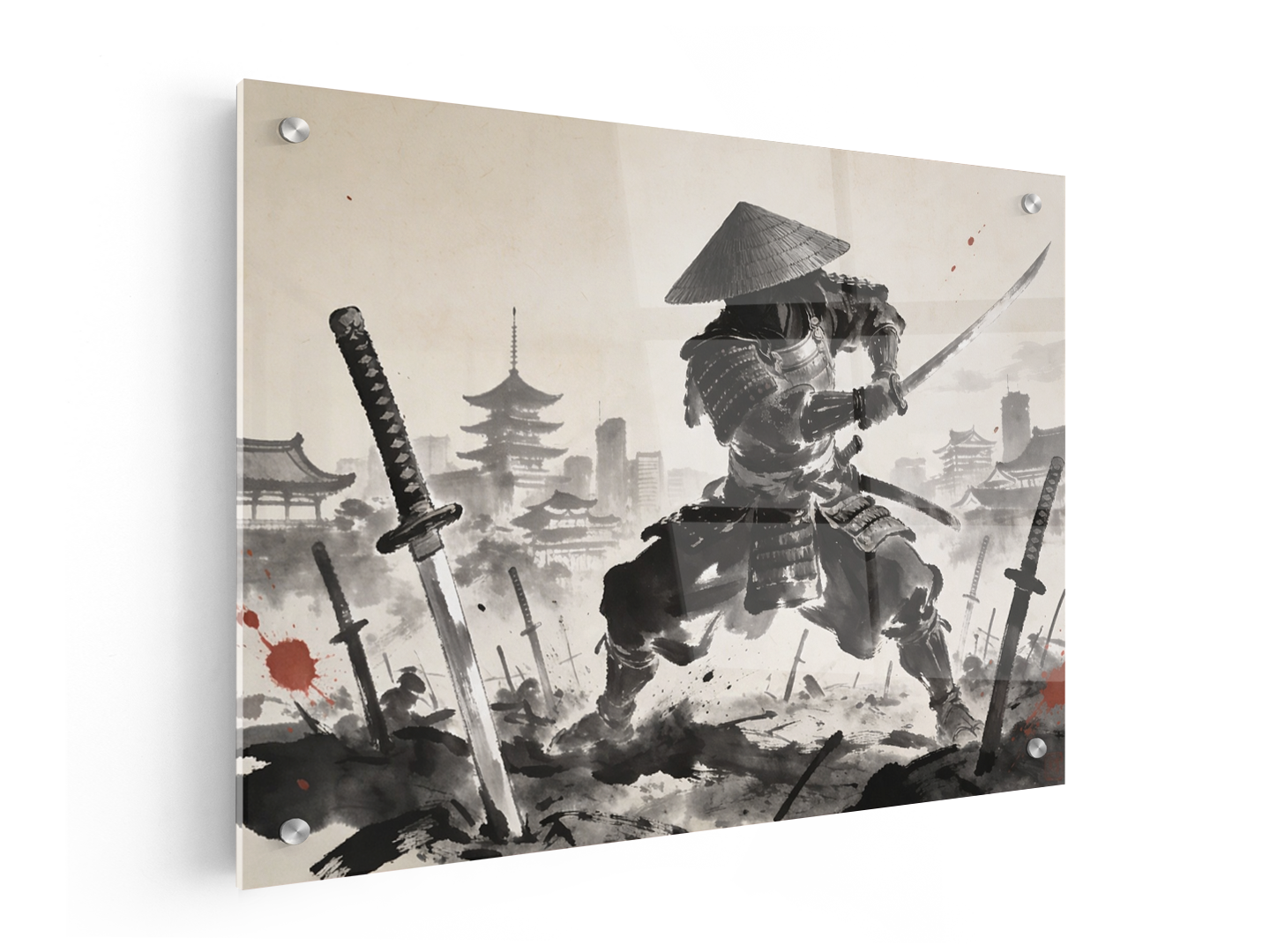 Een dynamische en filmische Japanse inkttekening (sumi-e) van een samoerai in traditioneel harnas, in een gevechtshouding, omringd door katana's die in de grond zijn gestoken alsof het een samoerai kerkhof is, met op de achtergrond een Japanse stadsgezicht uit de Edo-periode. Rijke zwarte inkt op beige rijstpapier, met enkele rode spetters, hoge kwaliteit met ongelooflijke details.