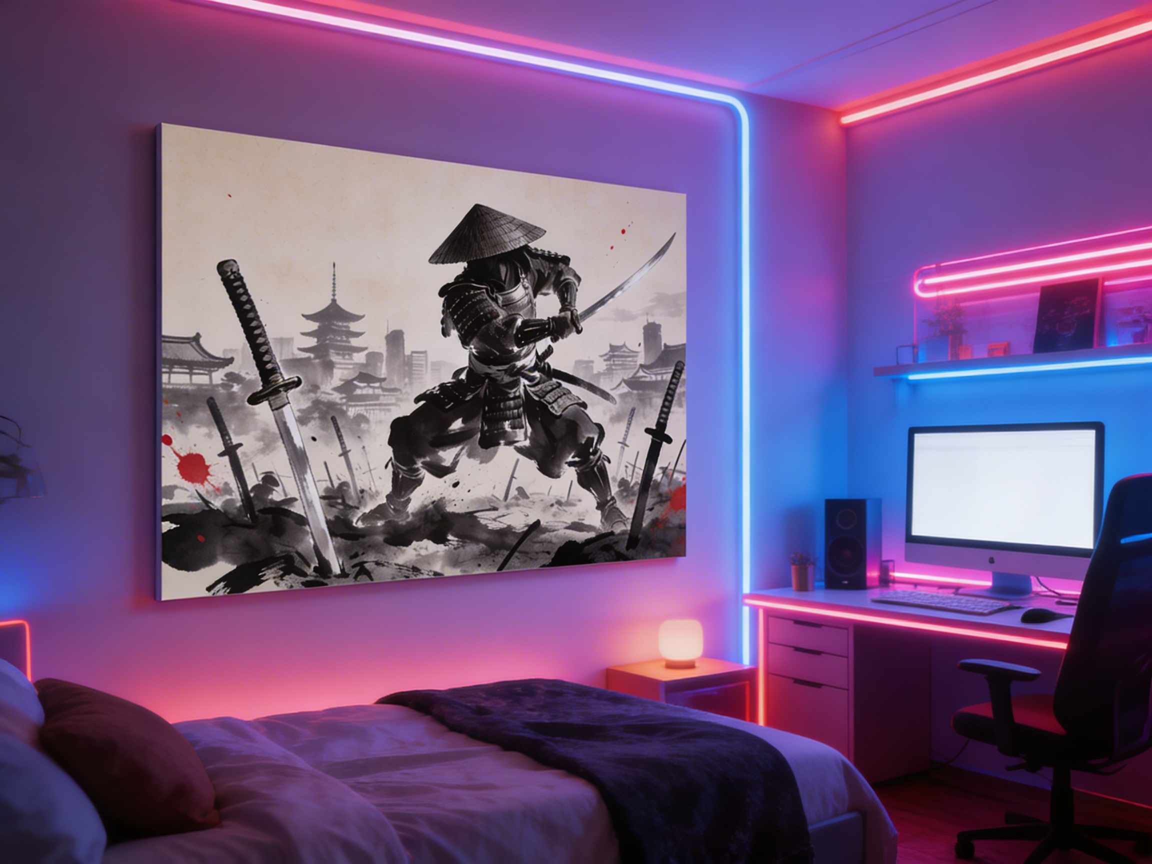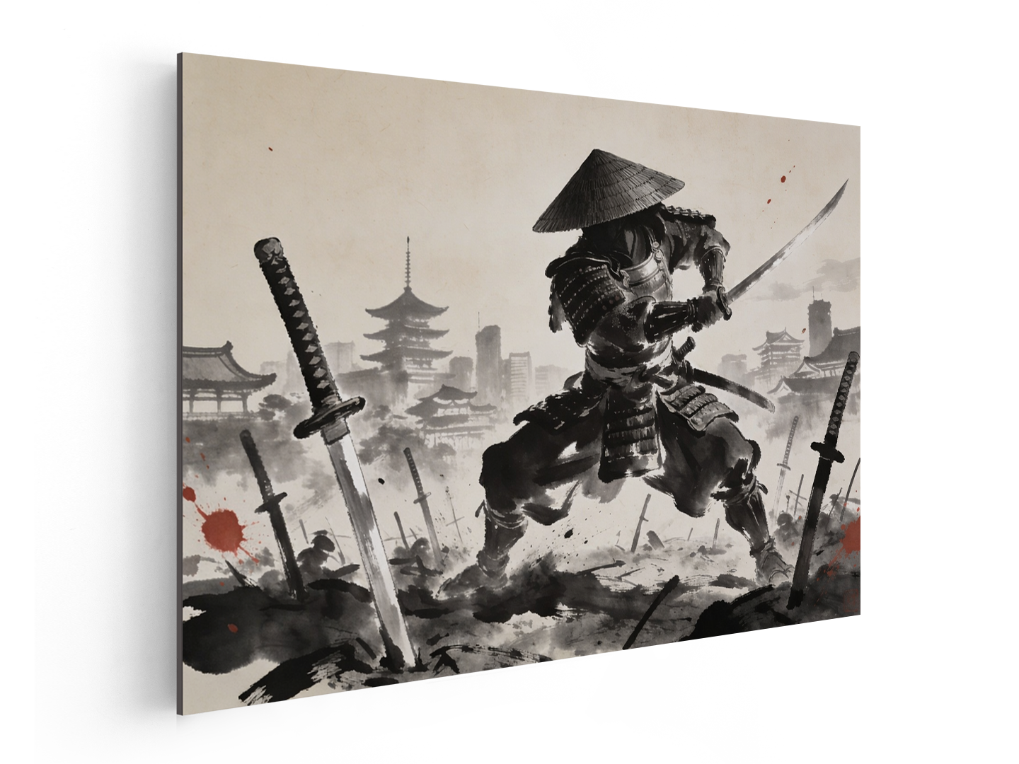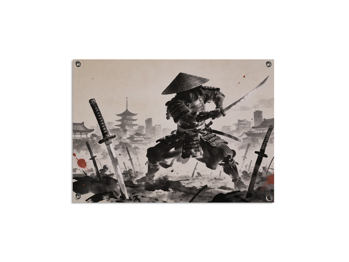 Een dynamische en filmische Japanse inkttekening (sumi-e) van een samoerai in traditioneel harnas, in een gevechtshouding, omringd door katana’s die in de grond zijn gestoken alsof het een samoerai kerkhof is, met op de achtergrond een Japanse stadsgezicht uit de Edo-periode. Rijke zwarte inkt op beige rijstpapier, met enkele rode spetters, hoge kwaliteit met ongelooflijke details.