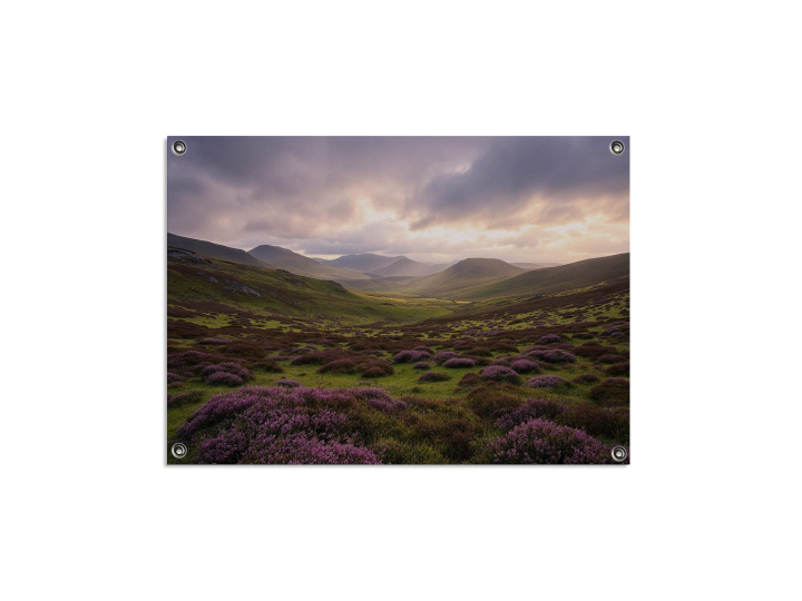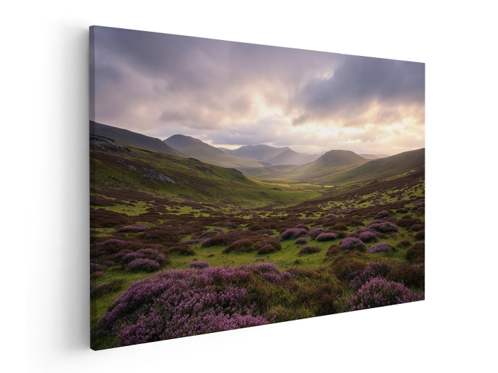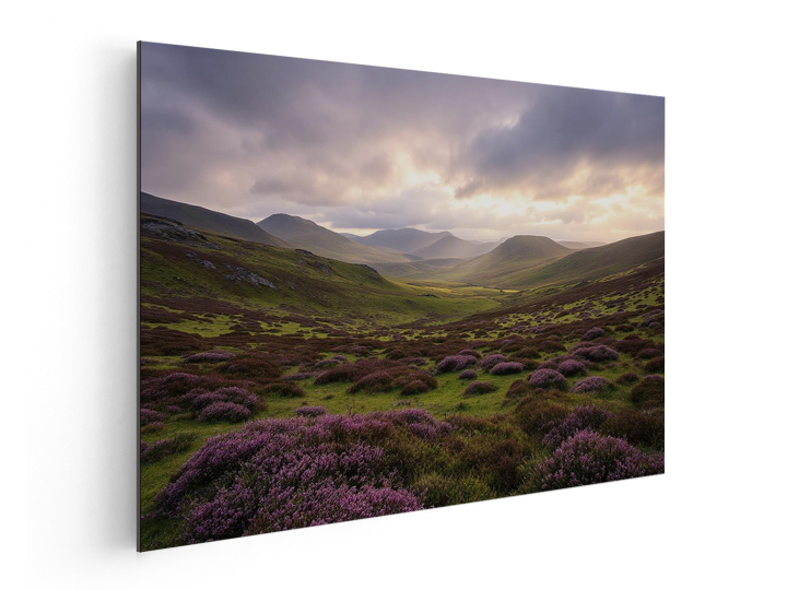 Uitgestrekt landschap van de Schotse Hooglanden, glooiende heuvels met heide, dramatische storm wolken, zonlicht dat door de wolken breekt, filmische sfeer, realistische texturen, hoge detaillering.