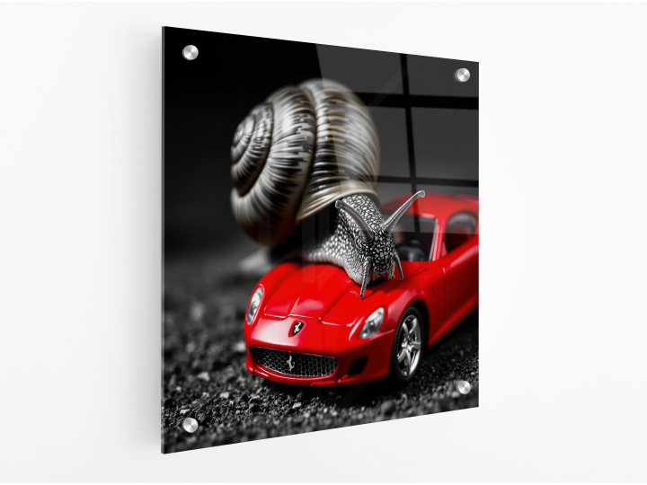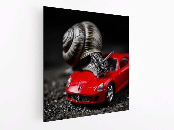 Een zwart en wit foto realistische close-up van een slak, die over een rode Ferrari miniatuur auto kruipt, met een donkere zand achtergrond.