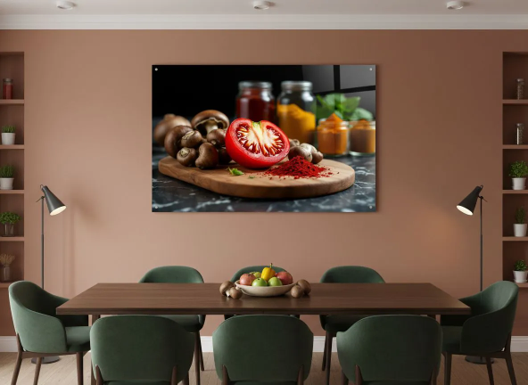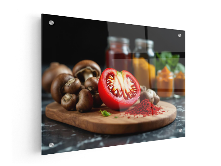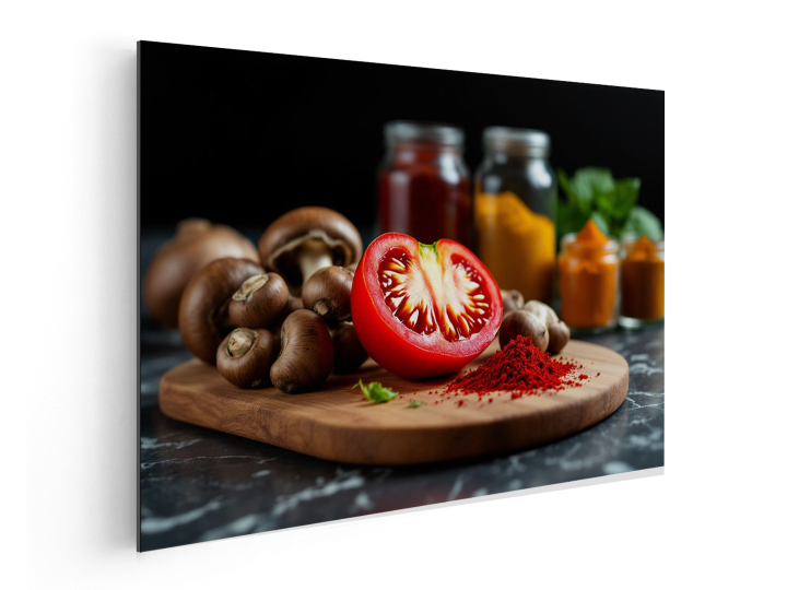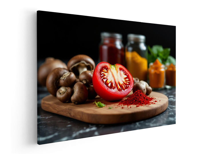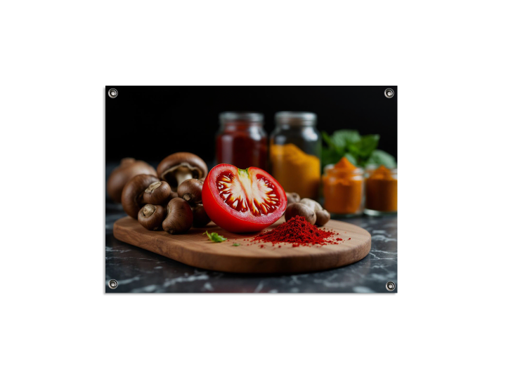 Een professionele foto van een luxe keuken met een houten snijplank, waarop een gesneden tomaat en champignons liggen, en glazen potjes gevuld met kleurrijk kruidenpoeder, tegen een zwarte achtergrond.