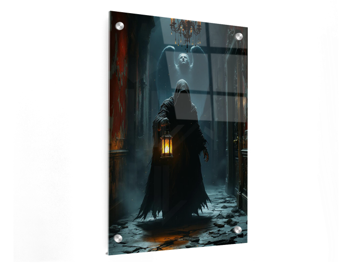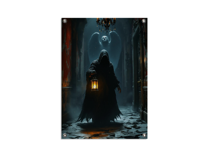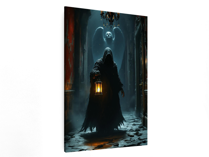 Een eenzame overlevende met capuchon die een lantaarn vasthoudt in de gang van een vervallen landhuis, stofdeeltjes die zweven in het warme licht, sterke contrast schaduwen, volumetrische belichting, gotische horror poster stijl.