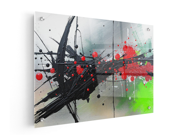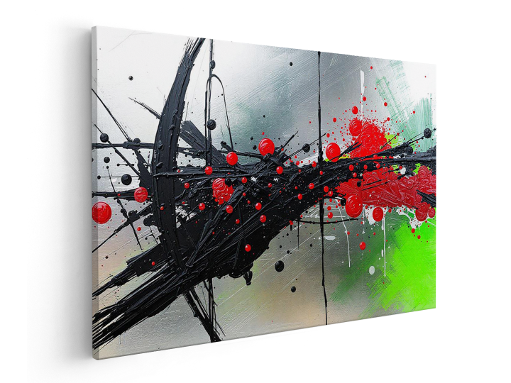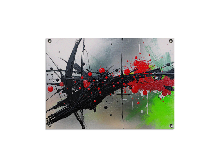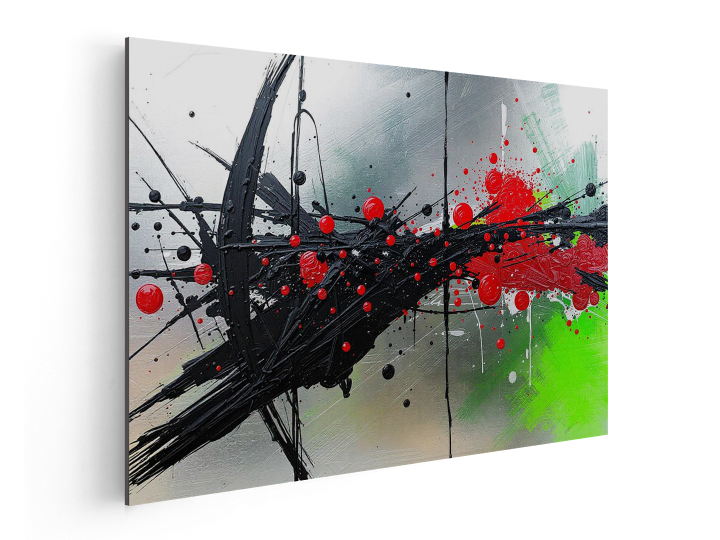 Een abstract design met zwarte, wilde en ruwe verf penseelstreken met een dikke verf textuur, met stip patronen in diverse roodtinten, op een metaal kleurige achtergrond.
